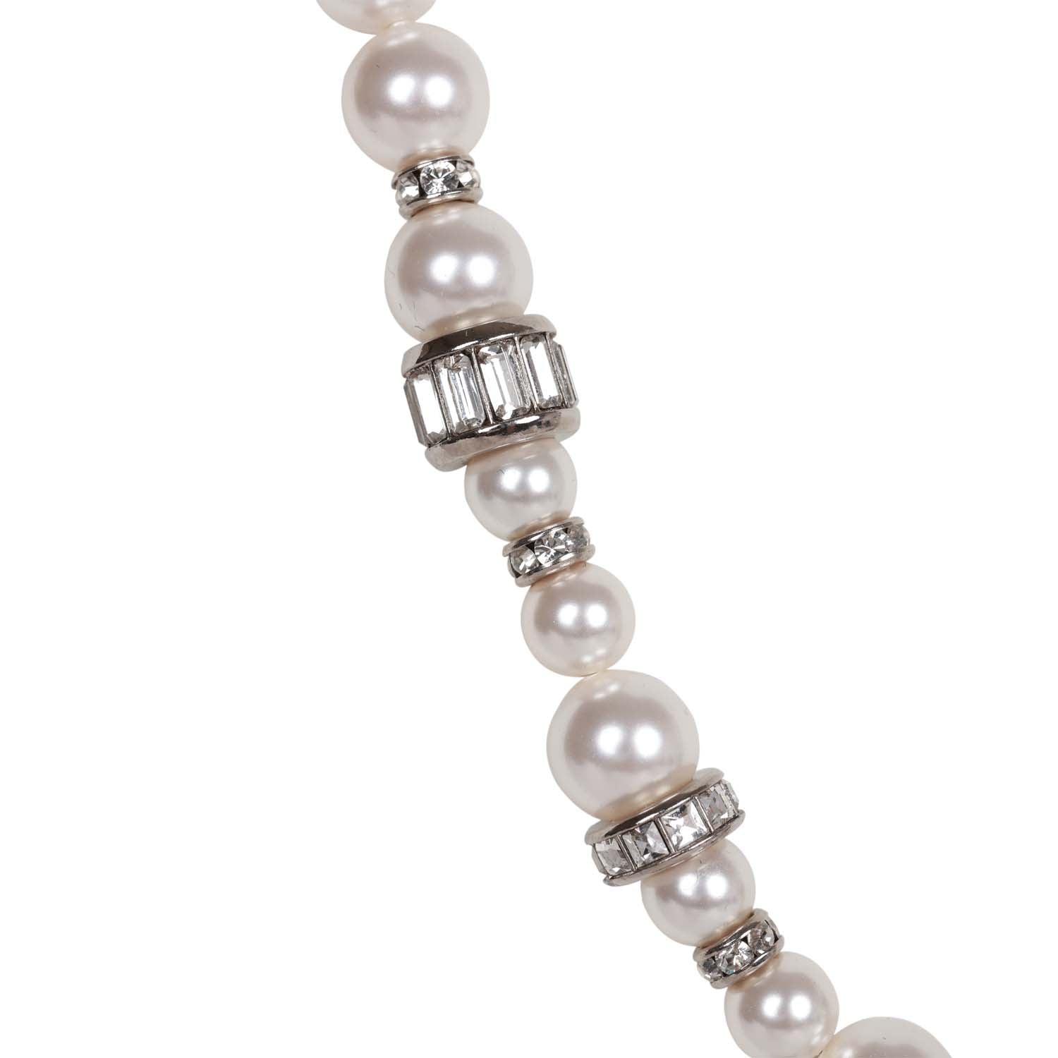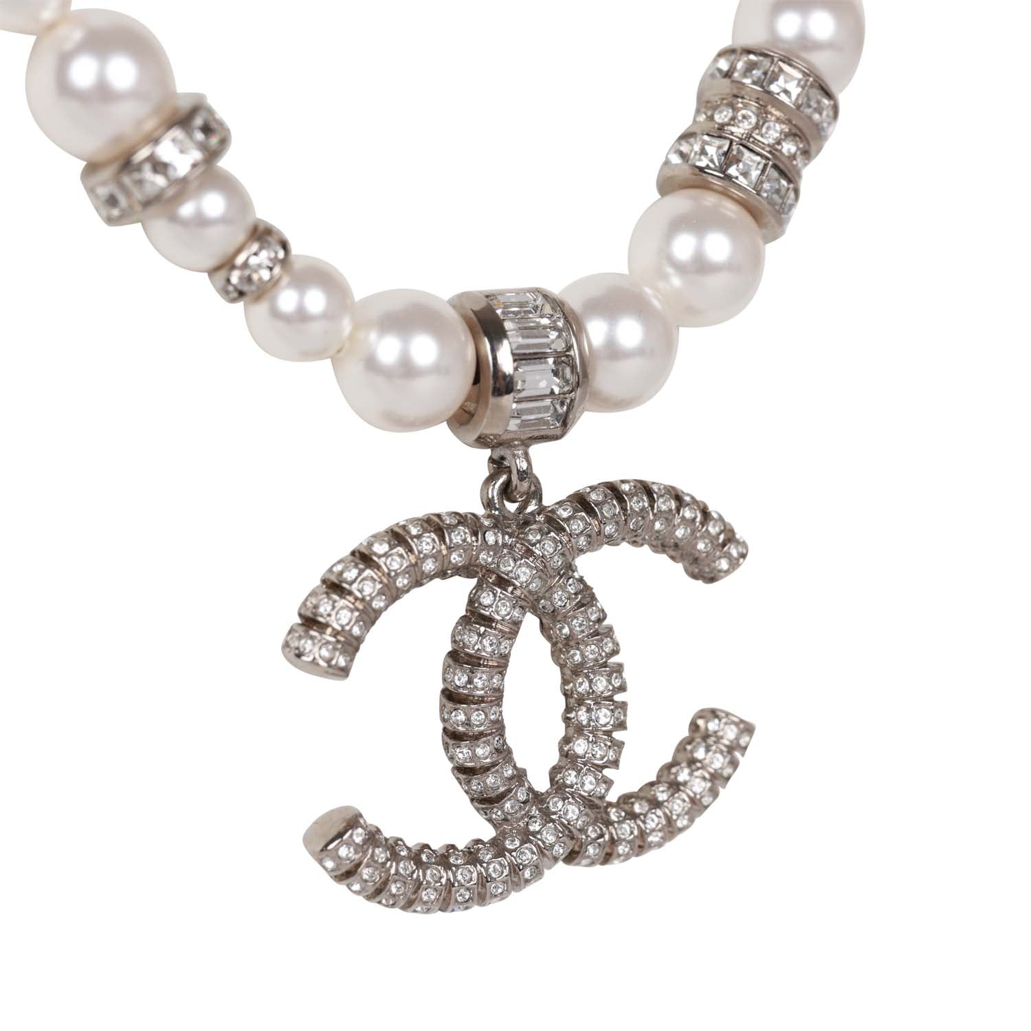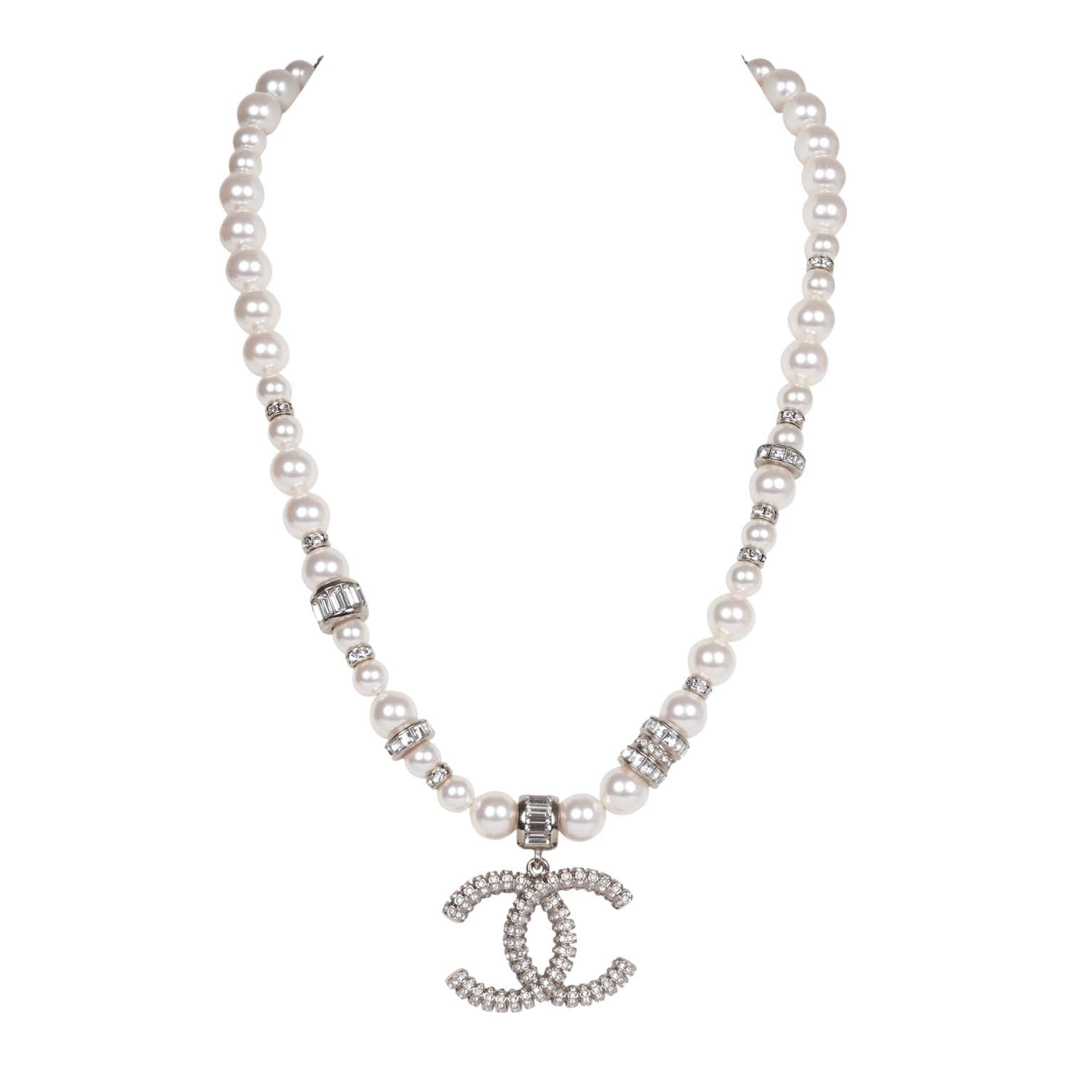 Chanel Faux Pearl and Crystal Silver CC Pendant Necklace