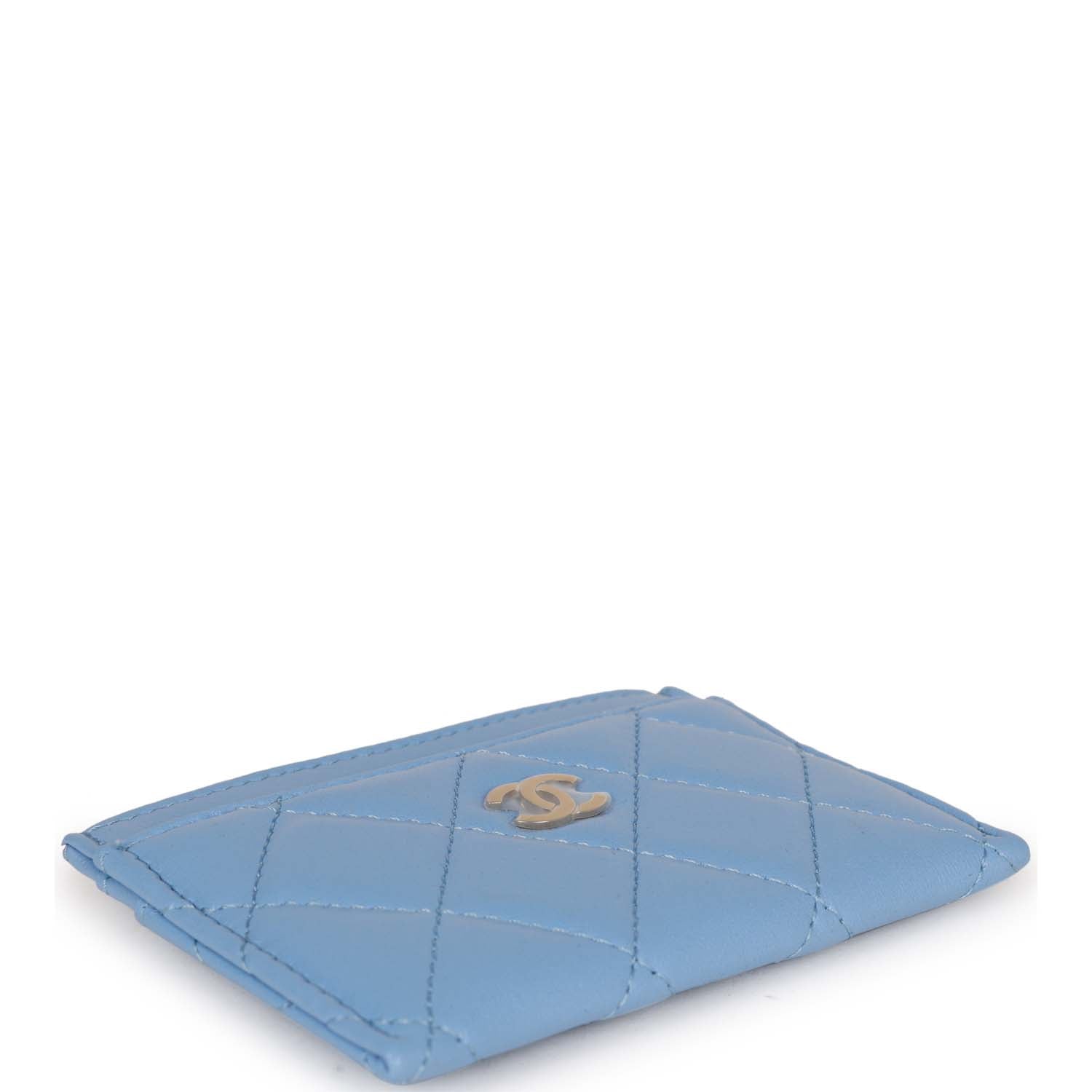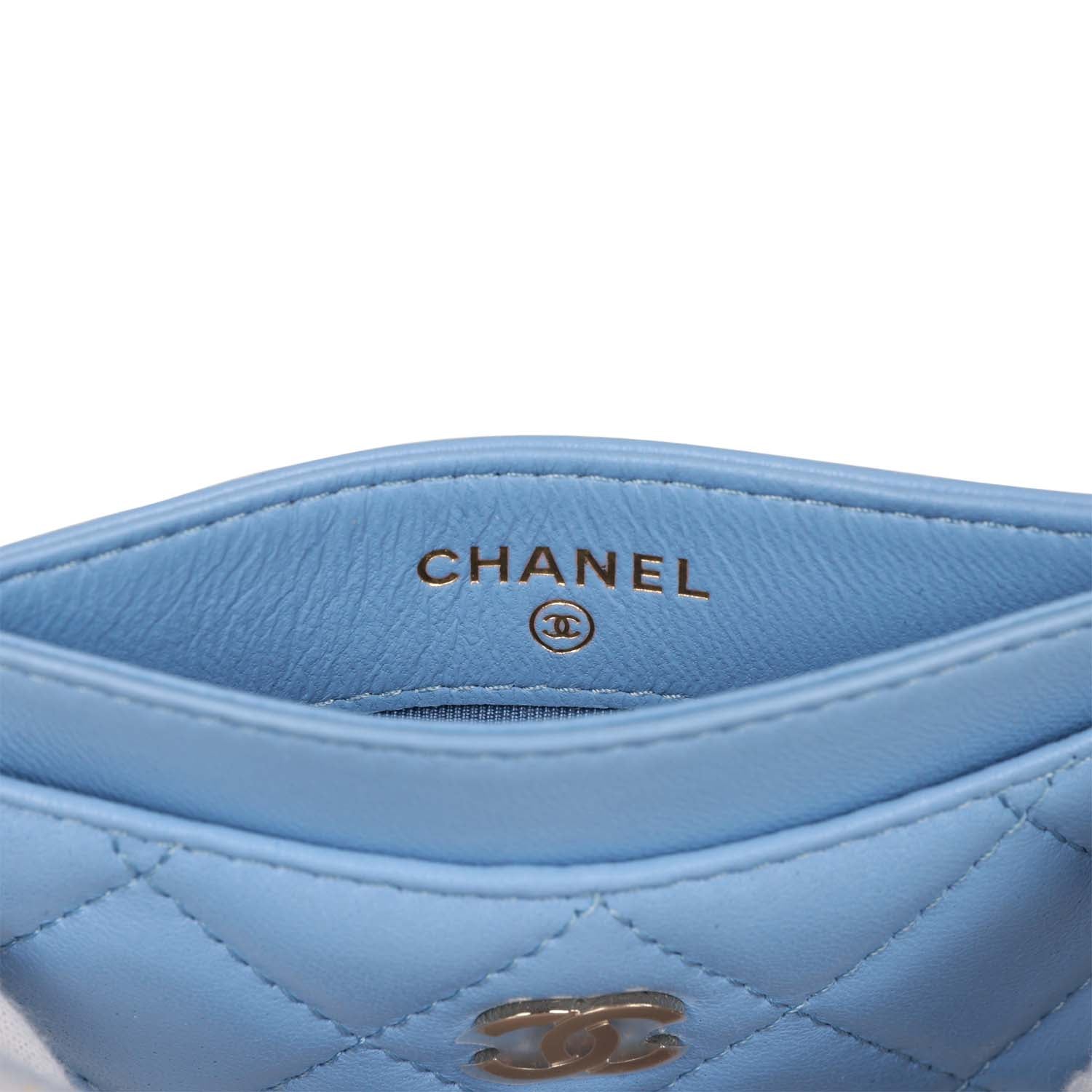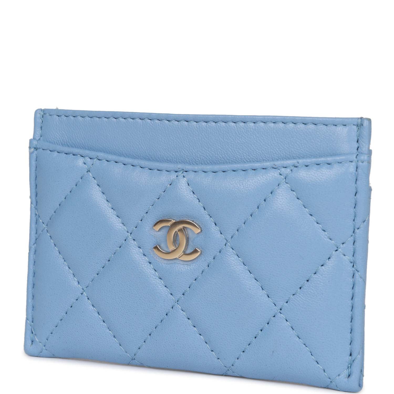 This cardholder is in Blue quilted lambskin with light gold hardware featuring a classic CC logo.