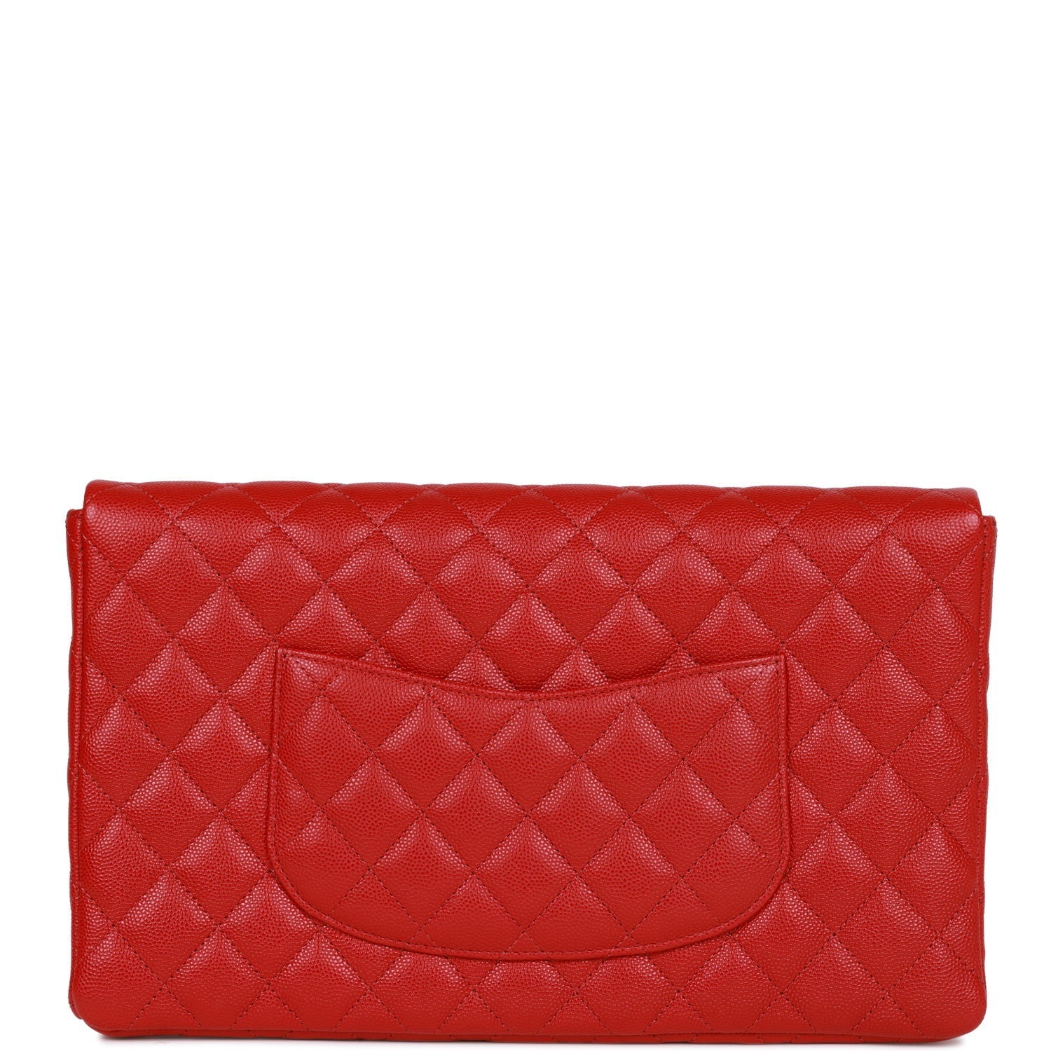This Flap bag clutch is in Red caviar leather with light gold tone hardware and features a full front flap with the signature CC turnlock closure and half moon back slip pocket.