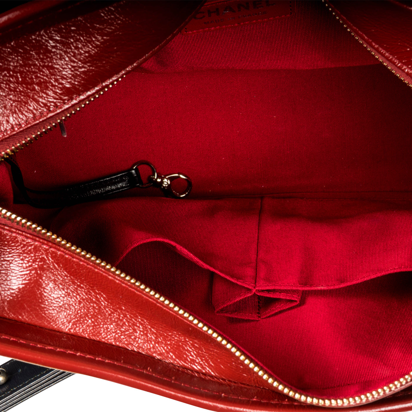 - Antique gold-tone CC logo charm on zip pull-tag