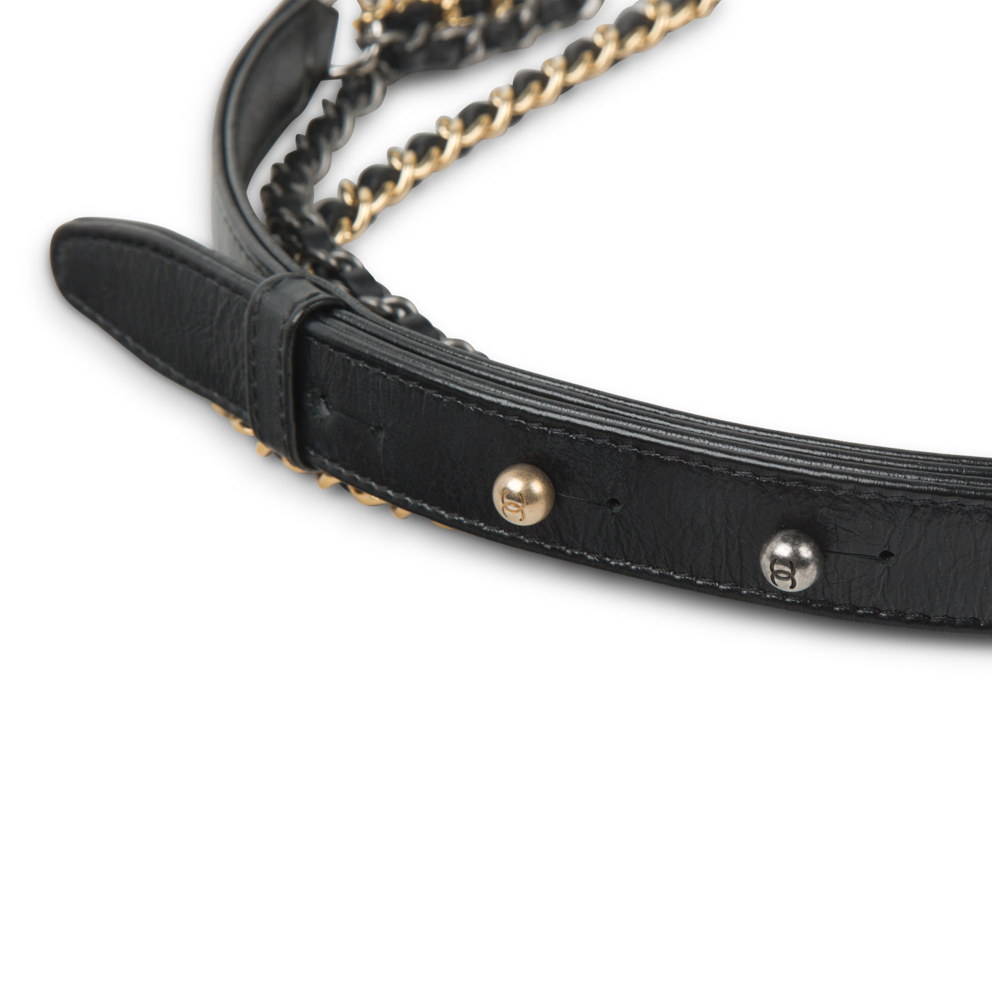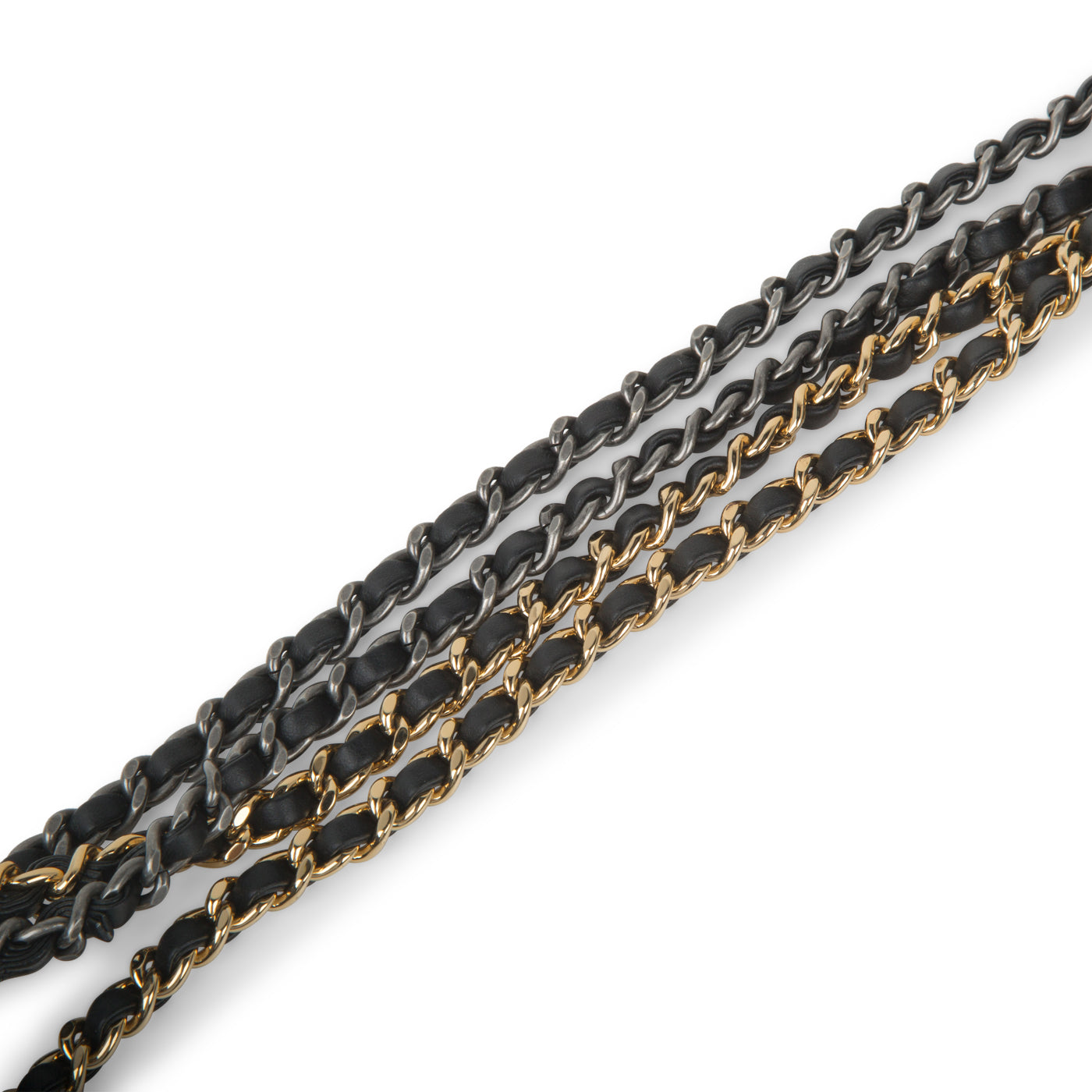 • Gold-tone, silver-tone and ruthenium interwoven chain / leather straps