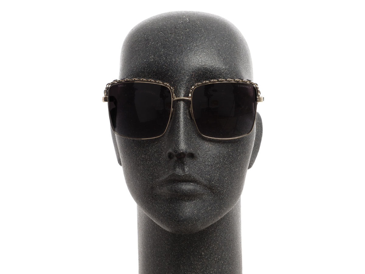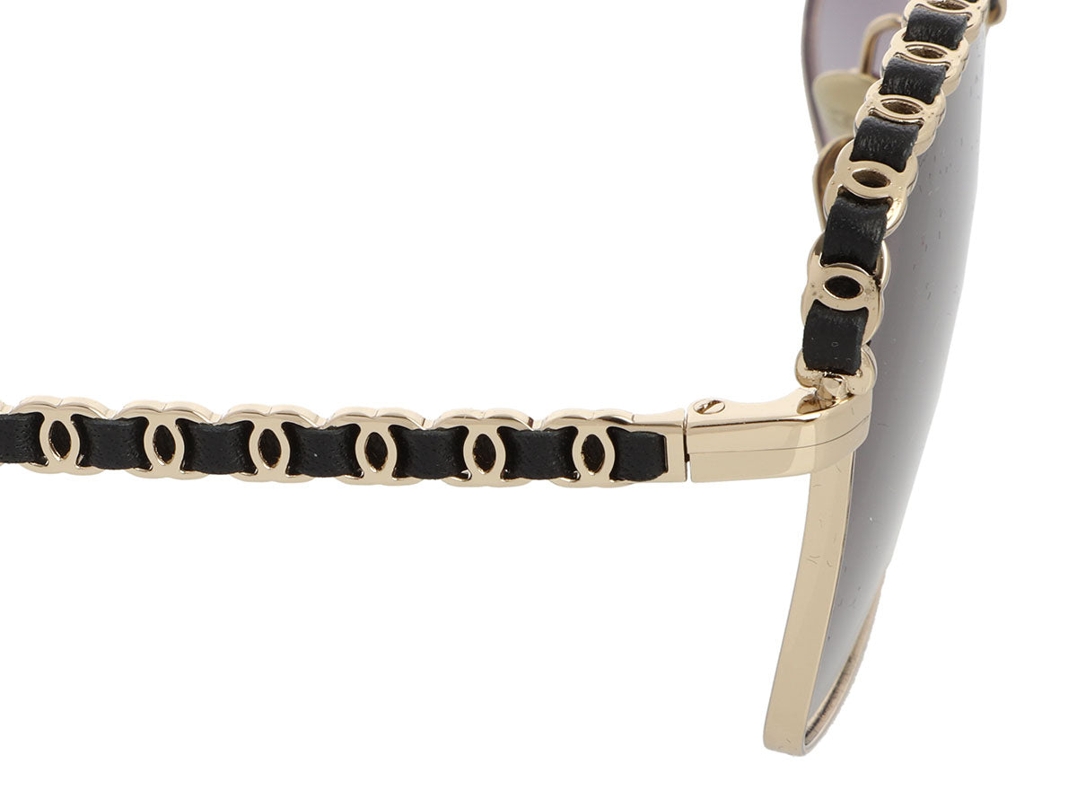 Chanel’s Gold and Leather CC Sunglasses are big, bold, and glamorous! The gold wire frames have chain details with leather woven through along the tops and arms. New and never worn with a box, cloth, and case, they have dark gray graduated lenses and a rockstar style!