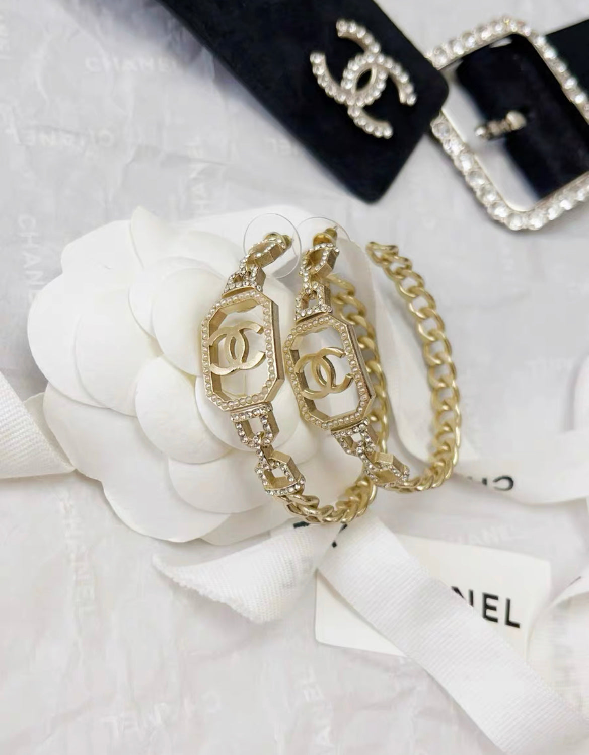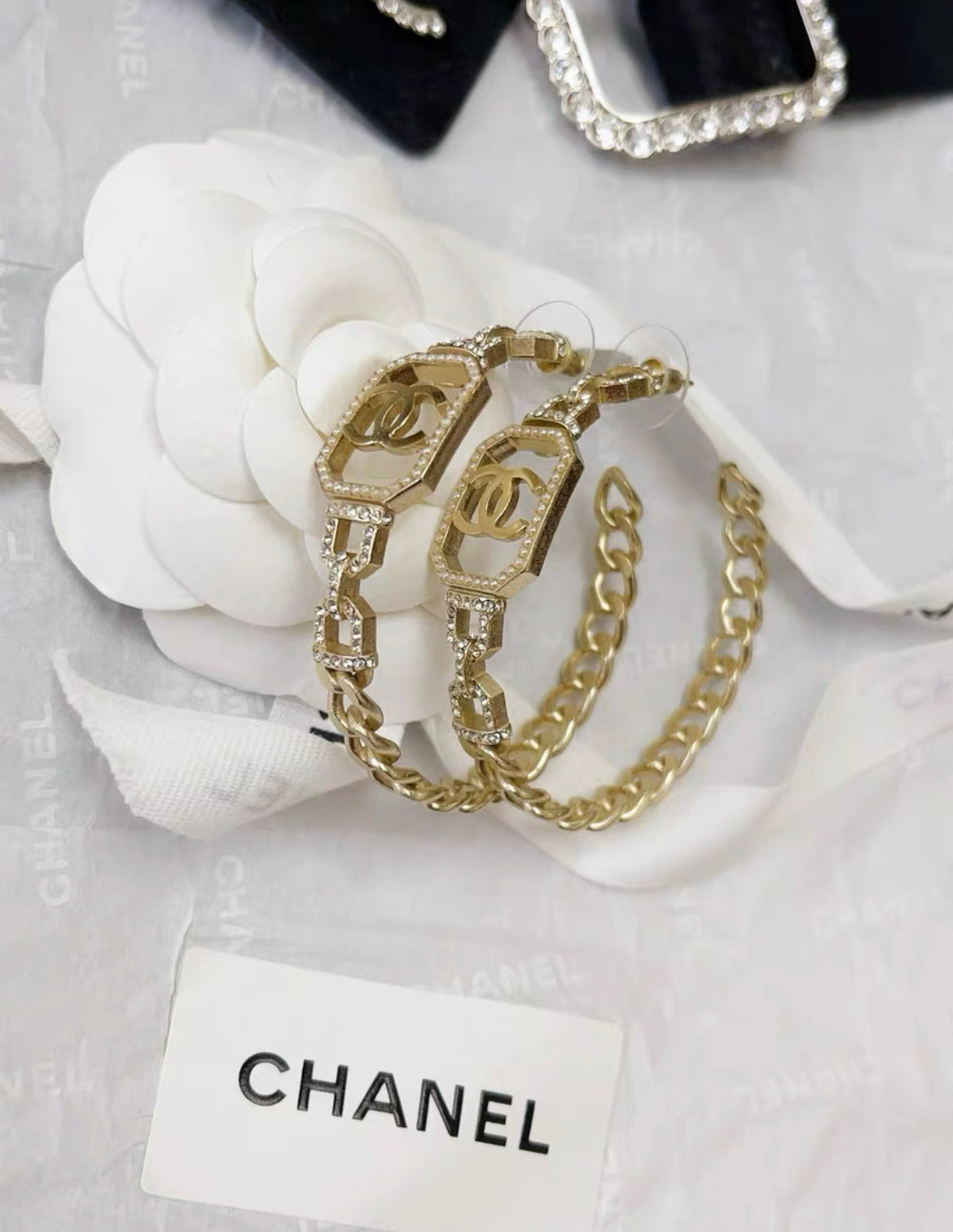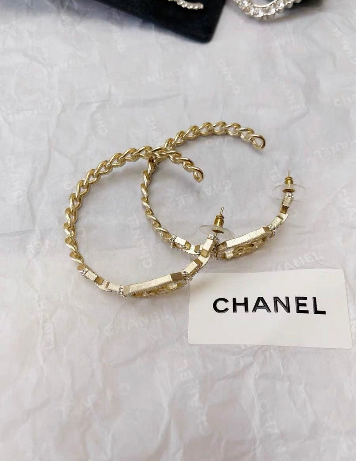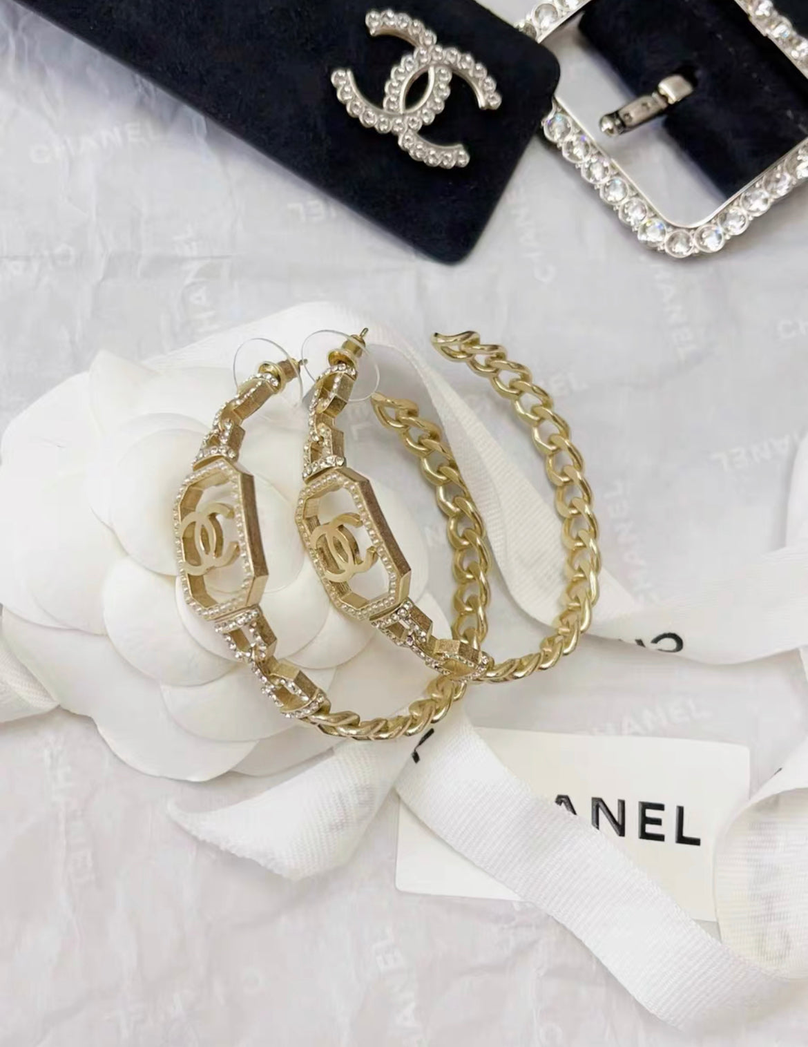 These Chanel gold CC chain diamond hoop earrings are in like-new condition, adding a touch of luxury to any outfit. Made of high-quality materials and featuring a classic design, these earrings are perfect for any fashion-forward individual. Upgrade your style with these elegant and timeless accessories.