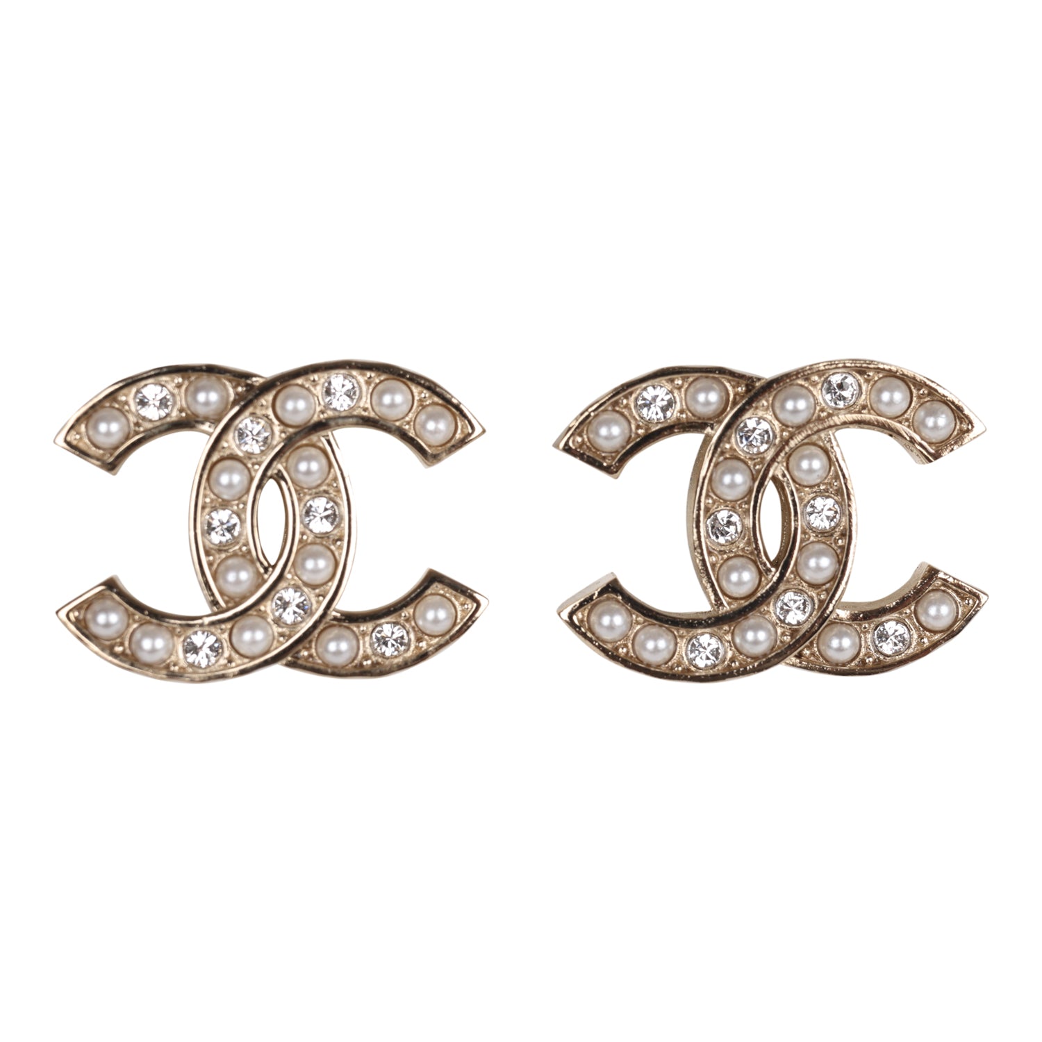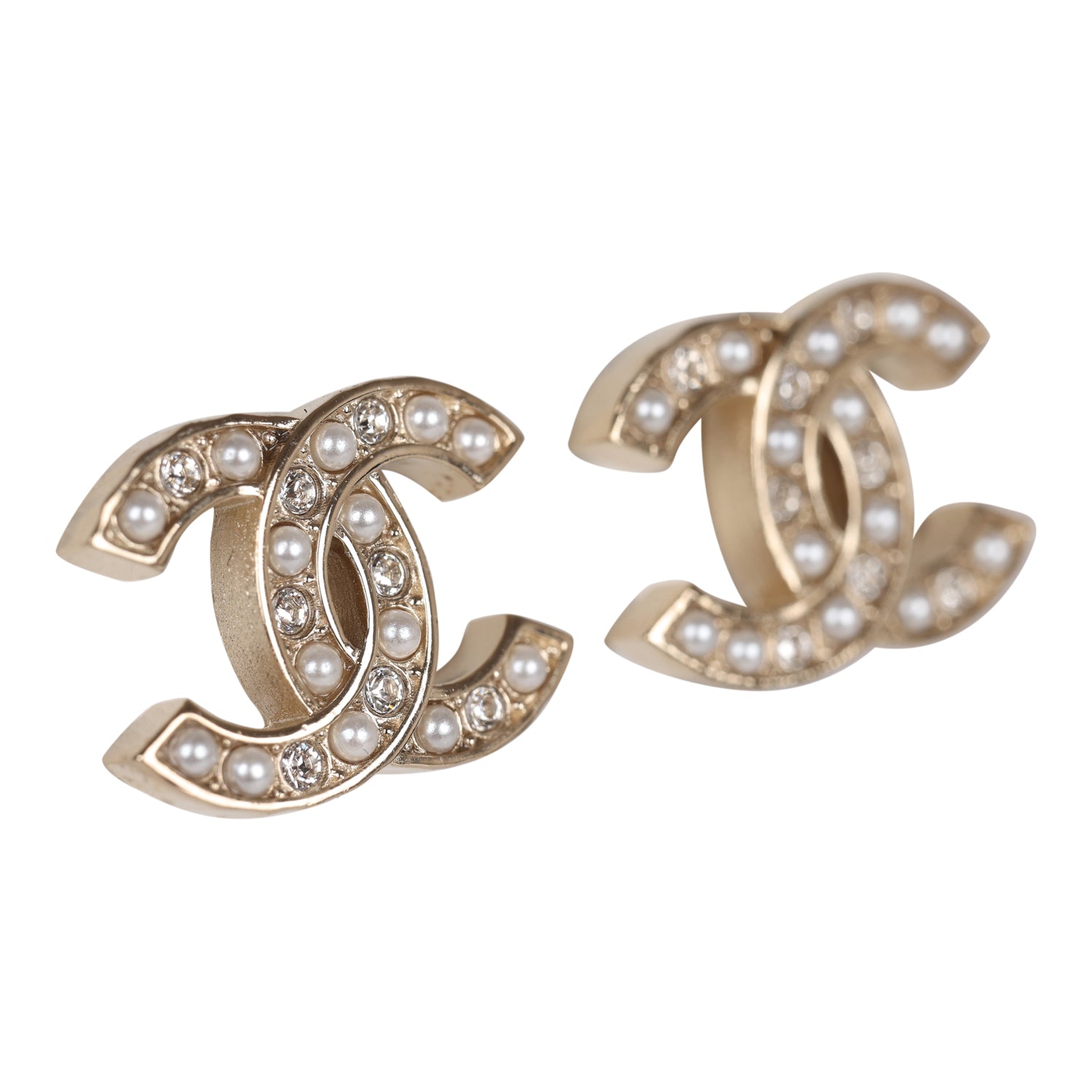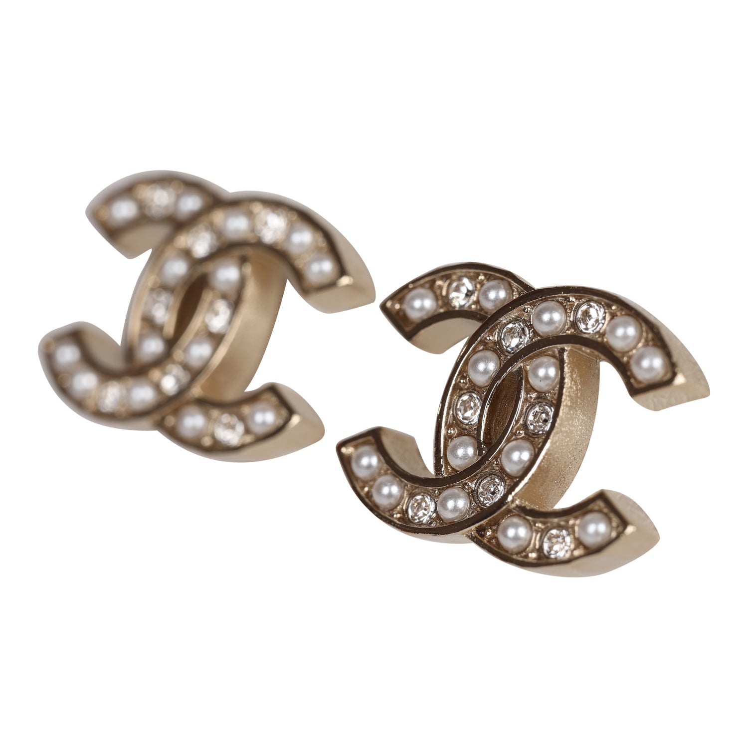 Chanel Gold Crystal and Pearl CC Stud Earrings