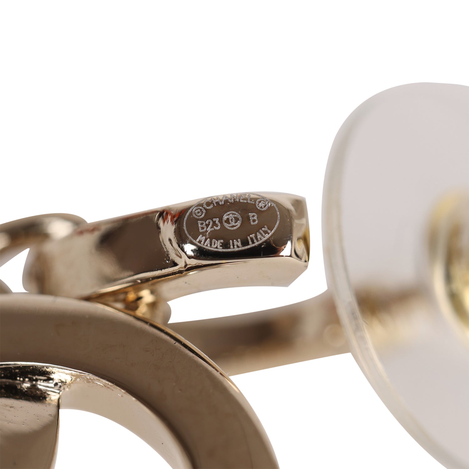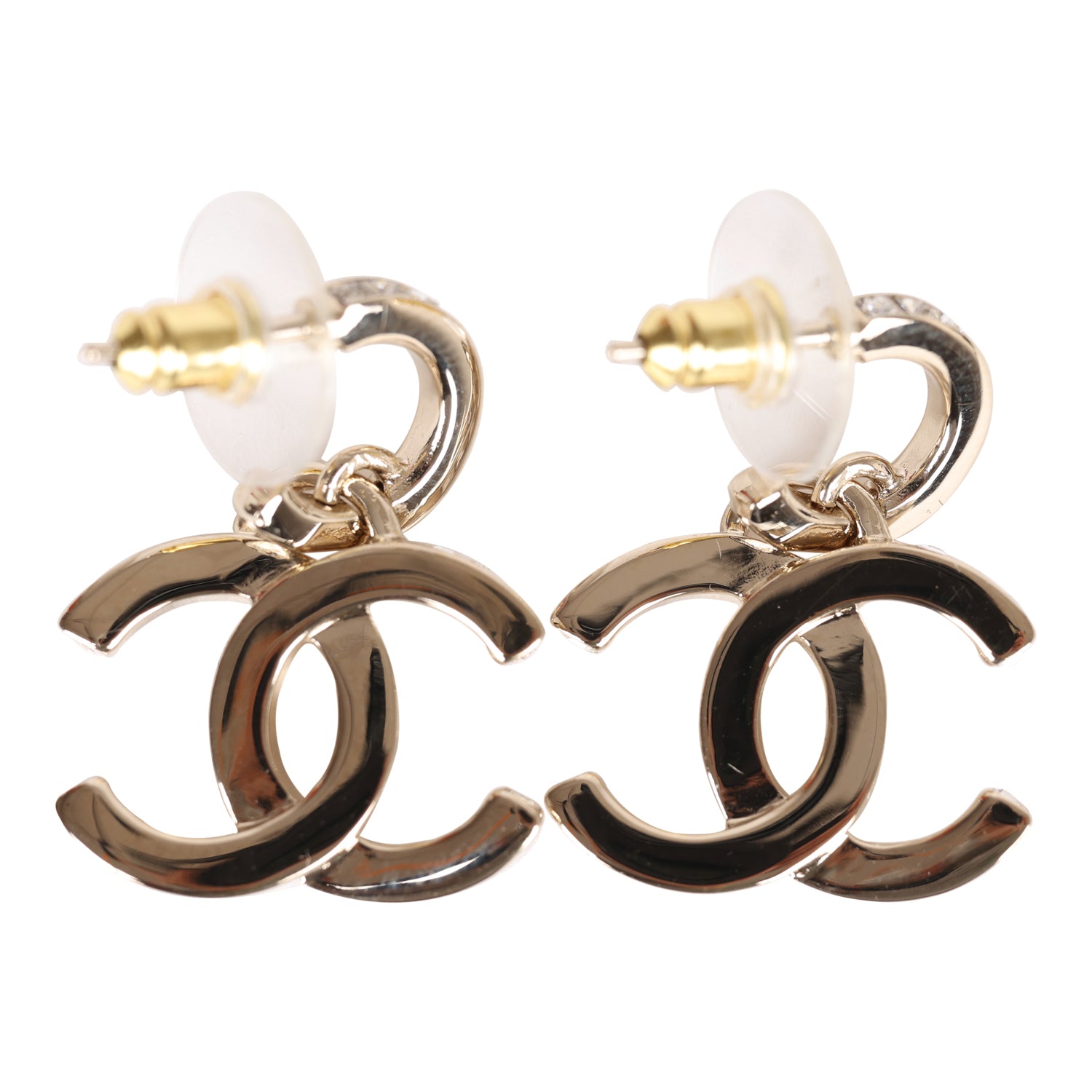 These 23B CC logo earrings are in gold tone metal with clear crystals.
