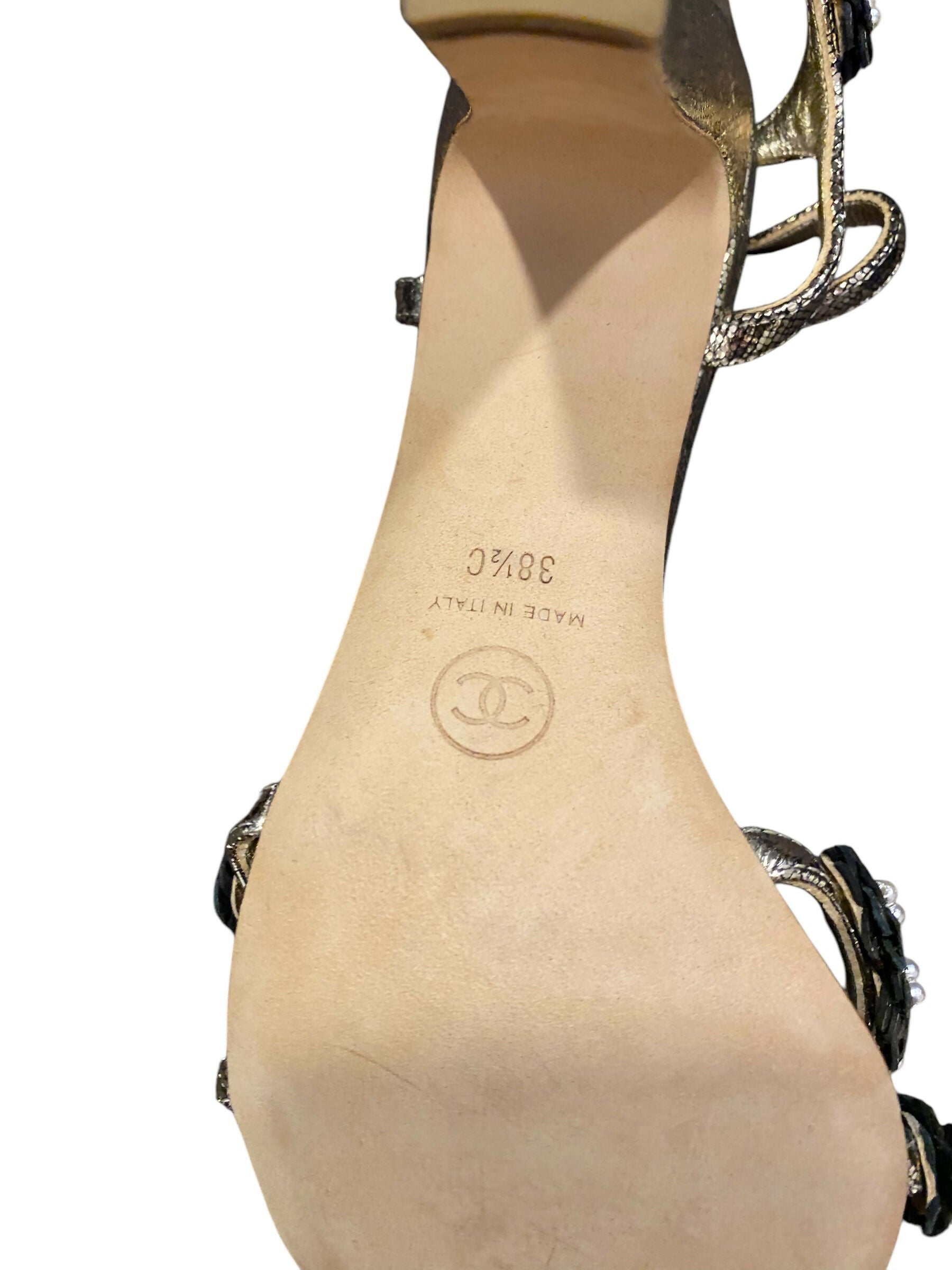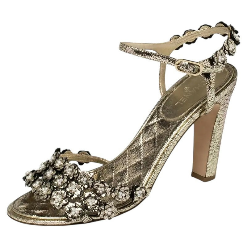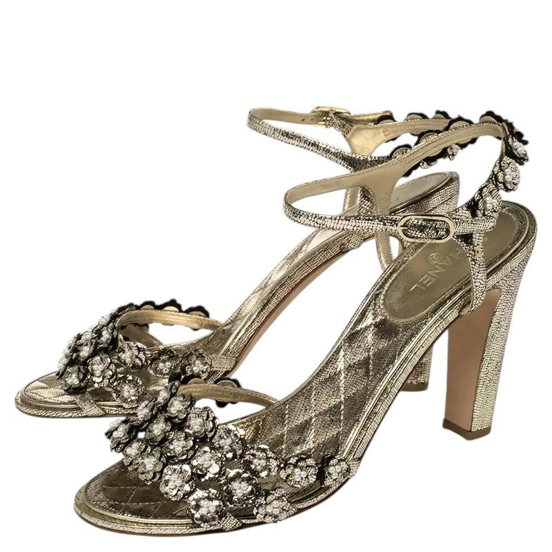 Chanel Gold Metallic Leather Camellia Pearl Sandals Heels EU 38.5C