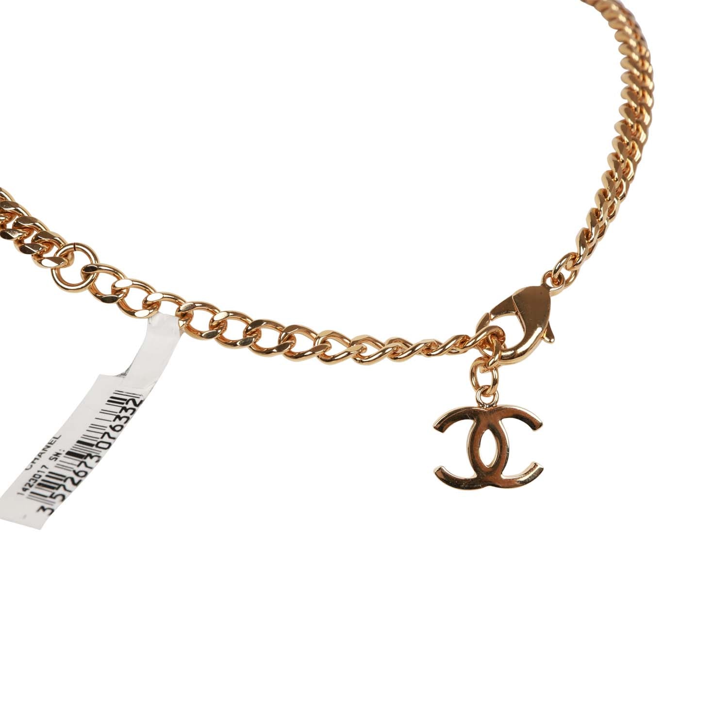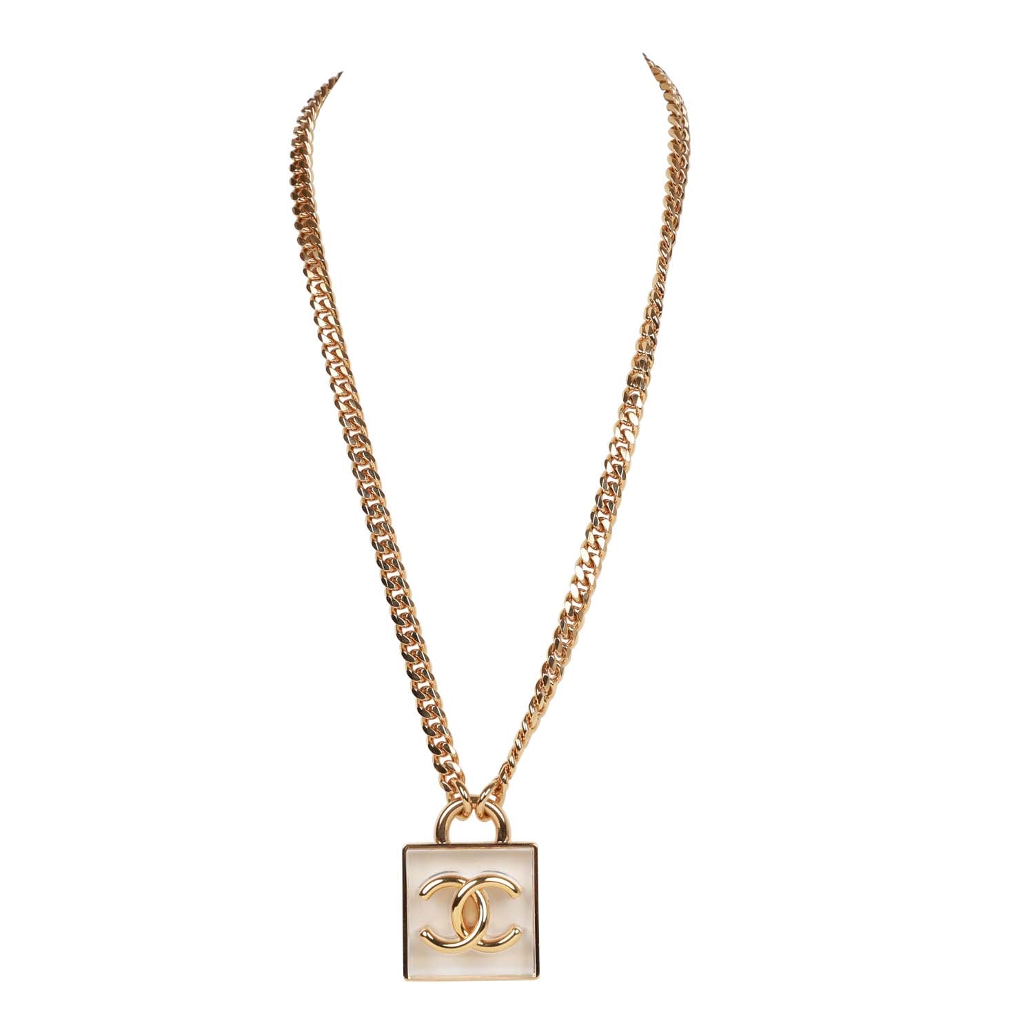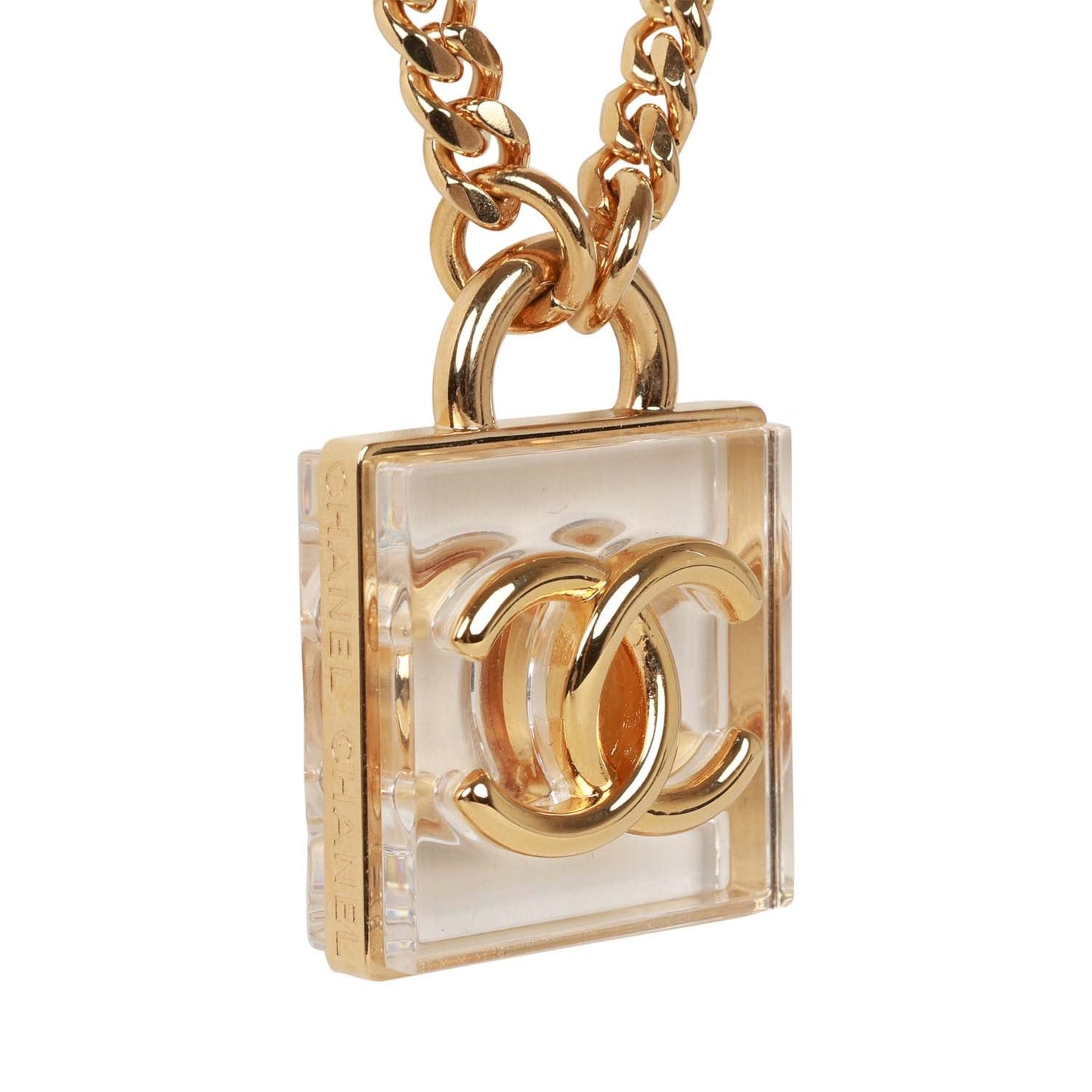 This Chanel necklace is in gold tone metal and clear resin and features a CC square pendant, cuban chain, and lobster claw closure.