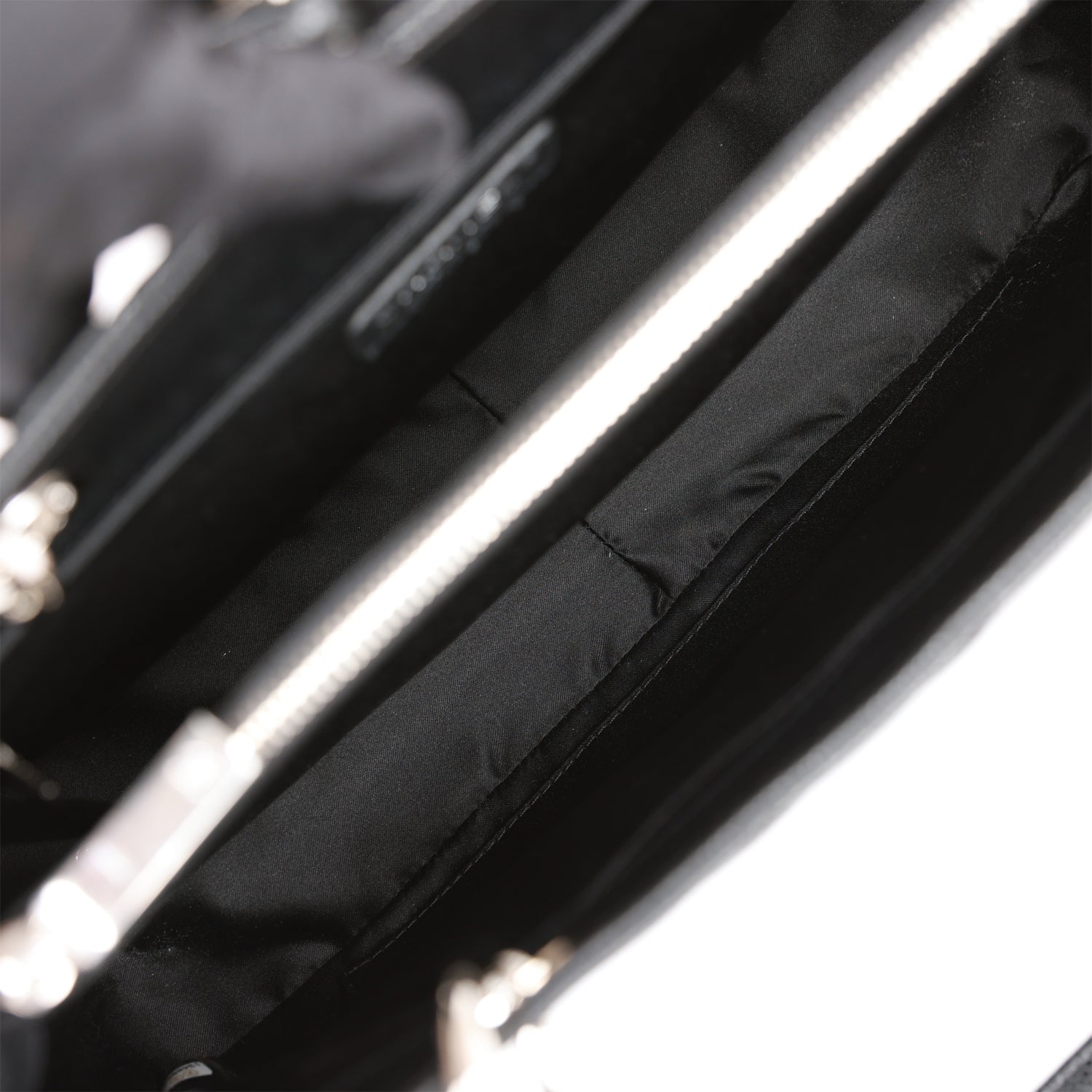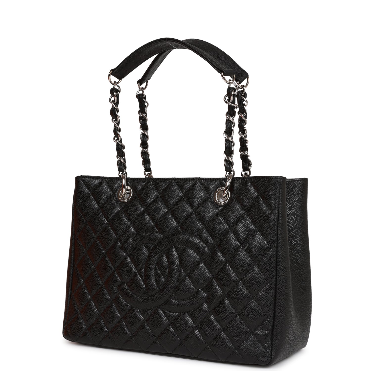 This (GST) Grand Shopping Tote bag is made of black caviar with silver tone hardware; featuring the CC signature logo, rear exterior slip pocket and interwoven silver tone chain link and black leather shoulder straps.