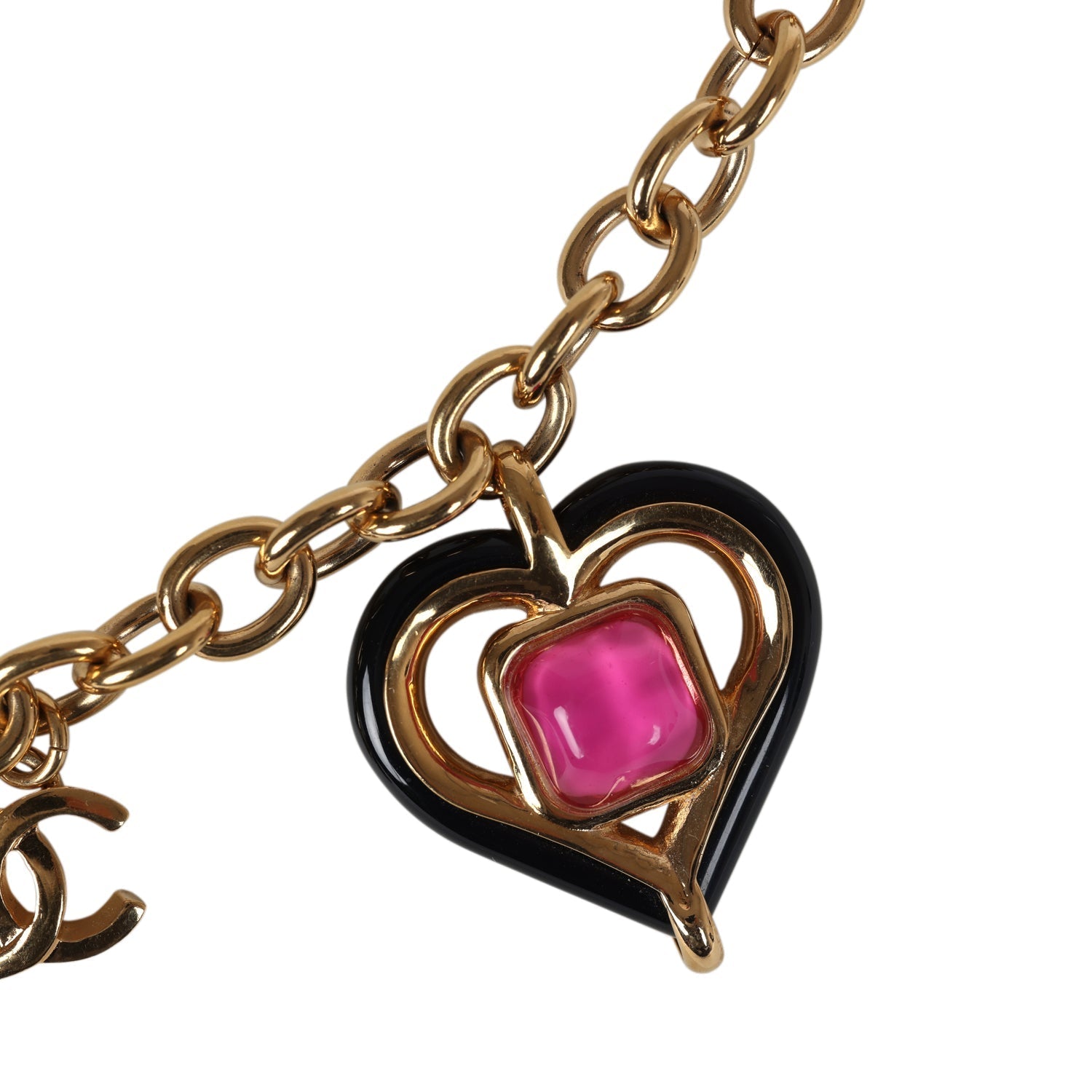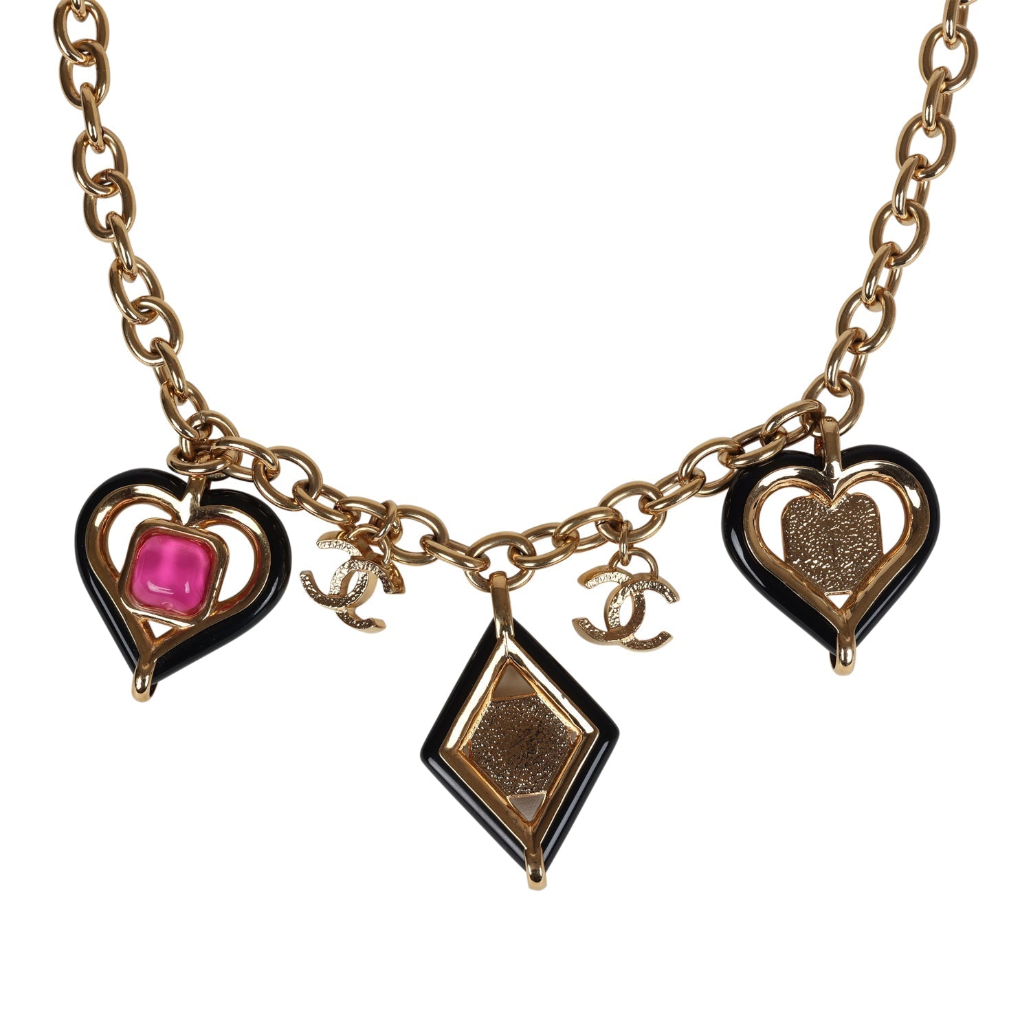 Chanel Hearts Charm Necklace Black/Pink Enamel/Gripoix Gold Tone Hardware