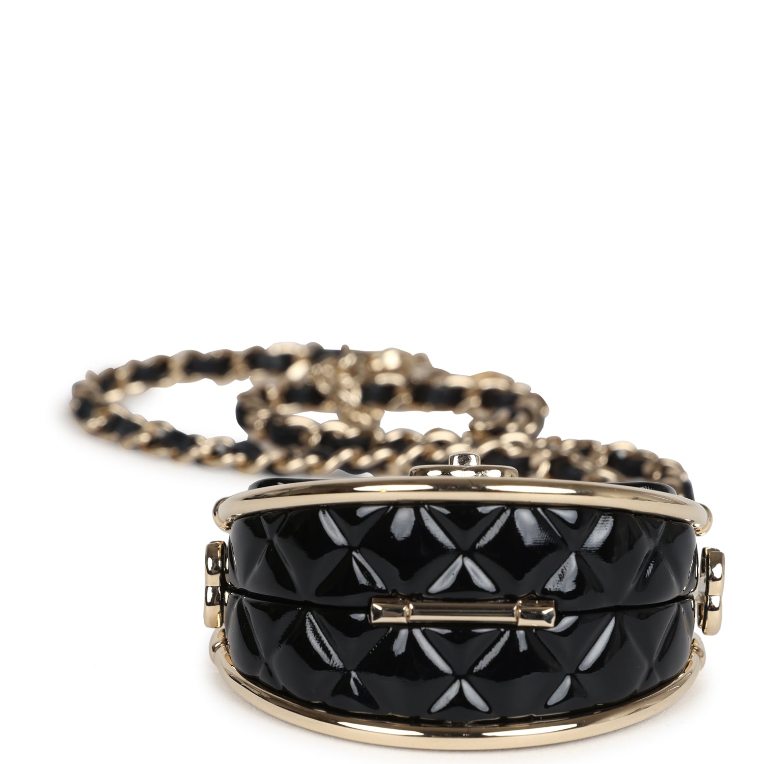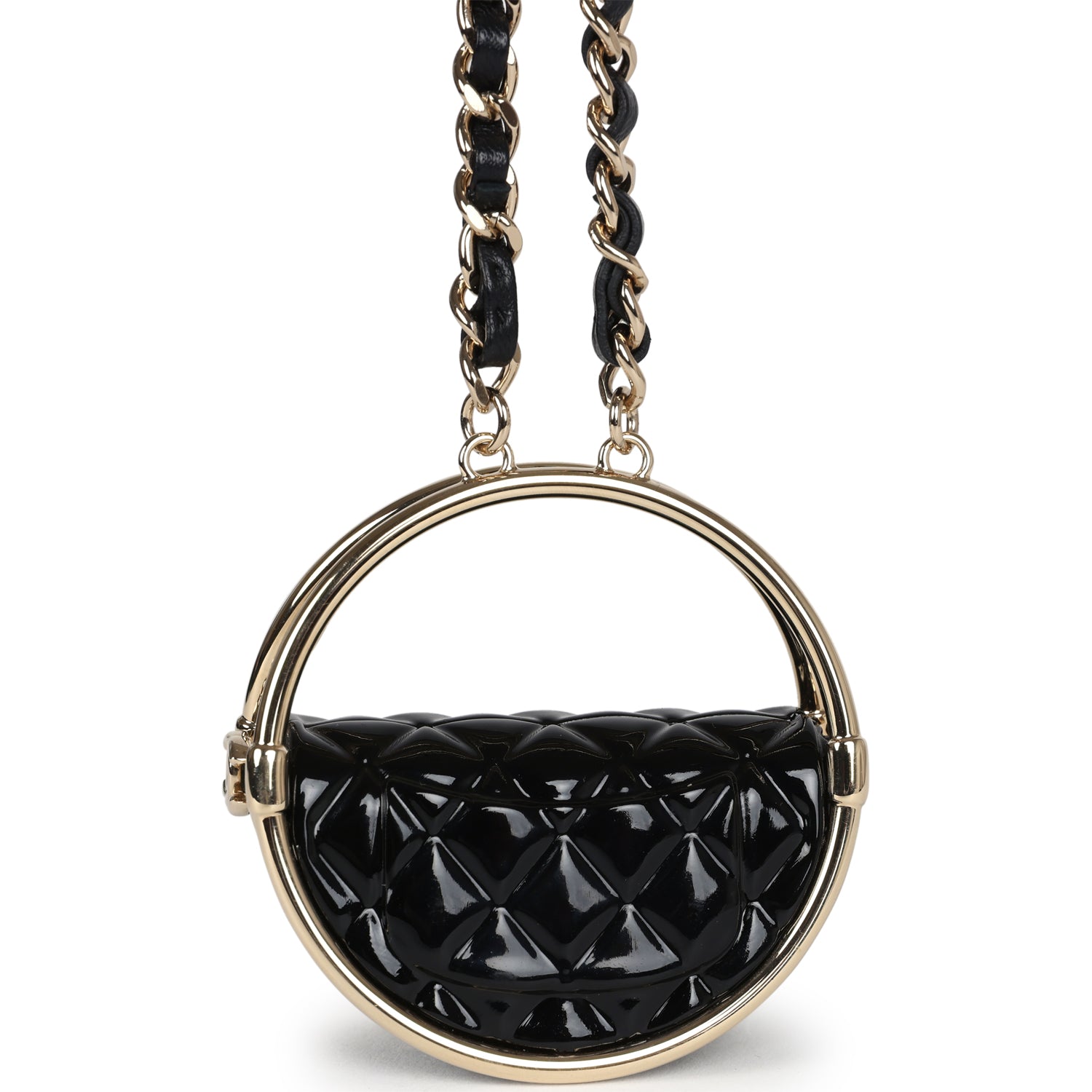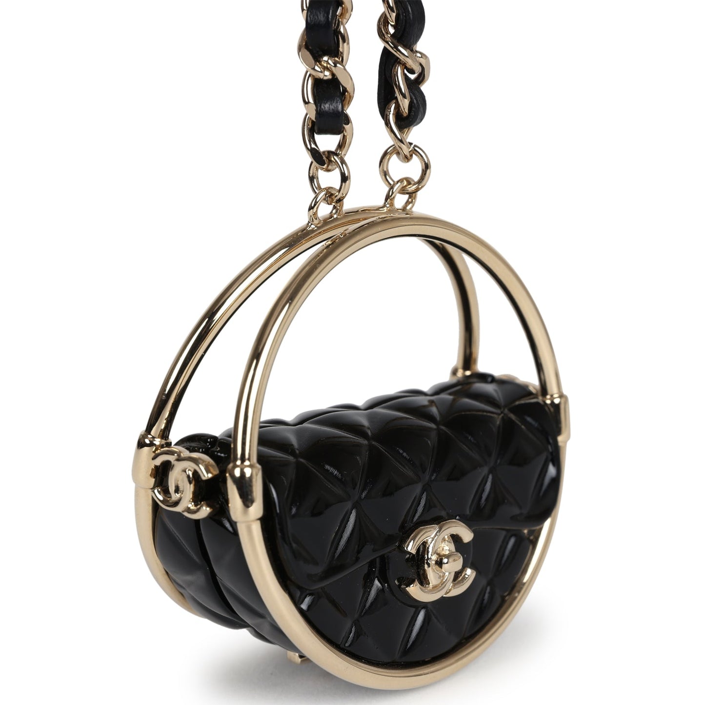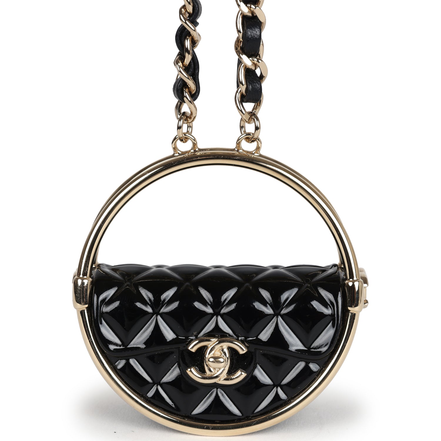 This Chanel Hula Hoop Compact Charm Necklace is in black enamel and light gold tone hardware featuring the iconic hula hoop bag as a compact charm that opens to a mirror on one side and a lobster clasp closure.