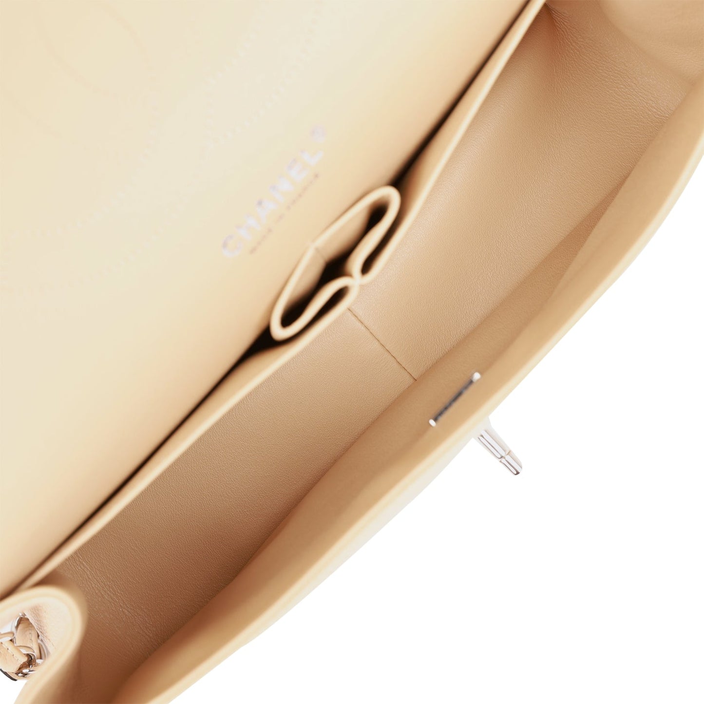 This Jumbo Classic Double Flap bag is in beige caviar leather with silver tone hardware and features a front flap with signature CC turnlock closure, half moon back pocket, and adjustable interwoven silver tone chain link and beige leather shoulder strap.