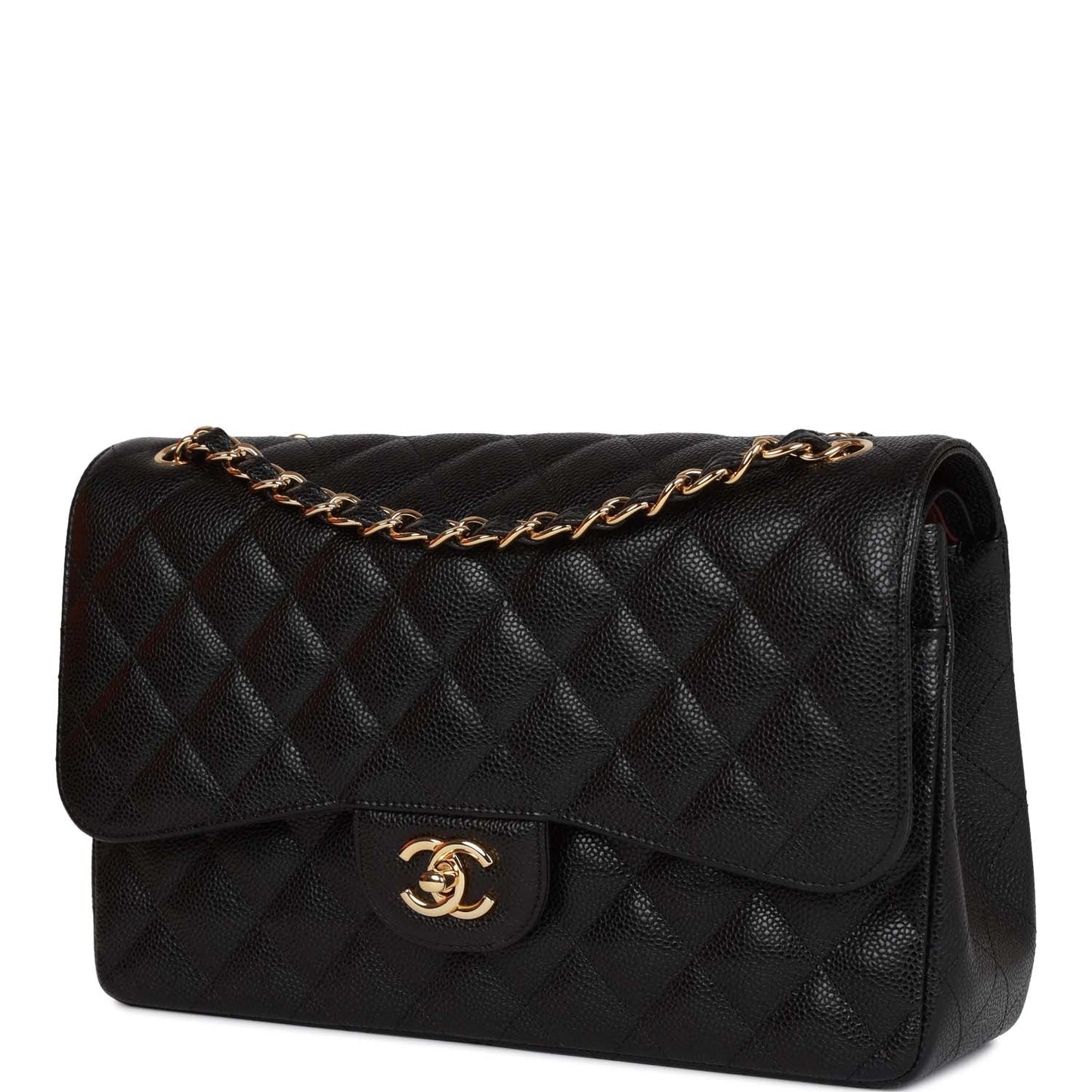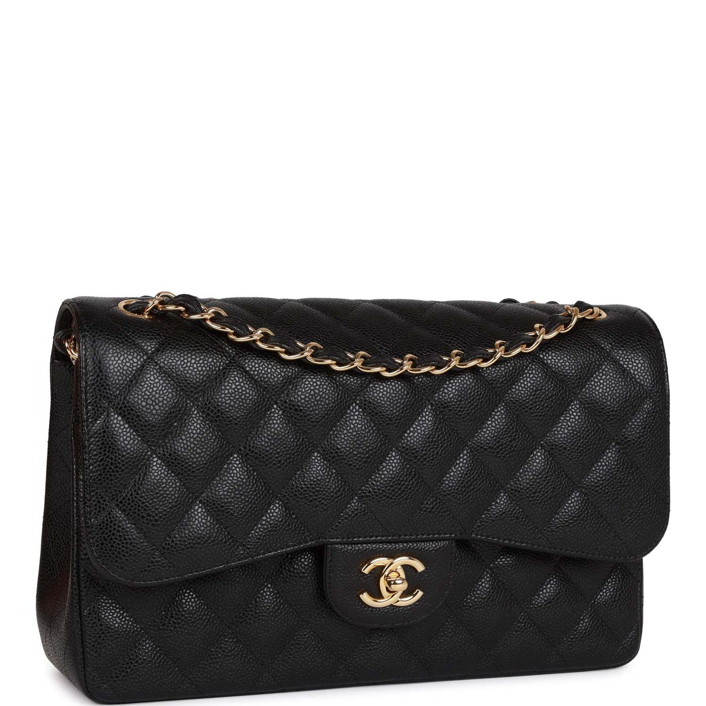 This Jumbo Classic Double Flap bag is in black caviar leather with gold tone hardware and features a front flap with signature CC turnlock closure, half moon back pocket, and adjustable interwoven gold tone chain link and black leather shoulder strap.