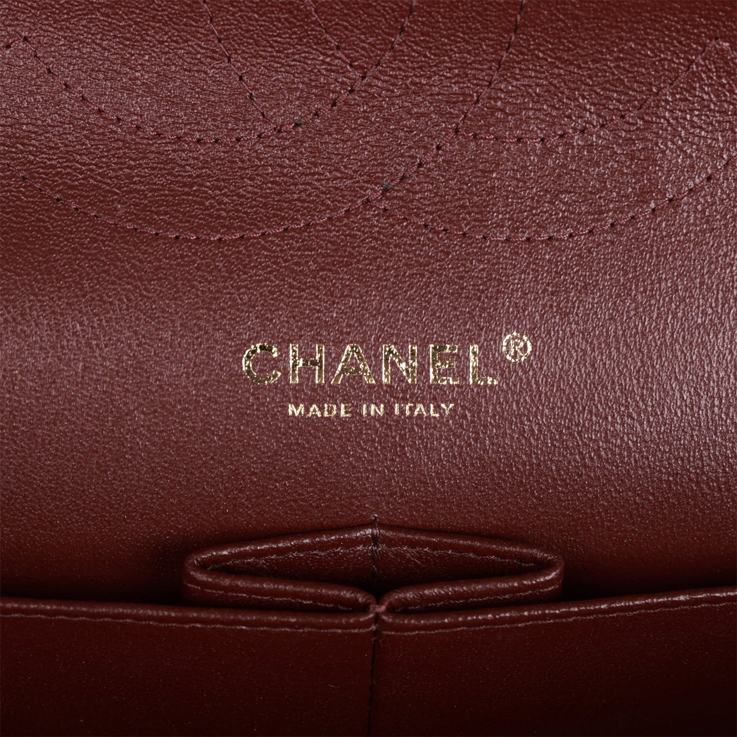 The interior is lined in burgundy leather with a "love letter" zipper compartment under the first flap, an "outer" slit pocket under the second flap, and an interior compartment with two open pockets separated by a "lipstick" compartment.