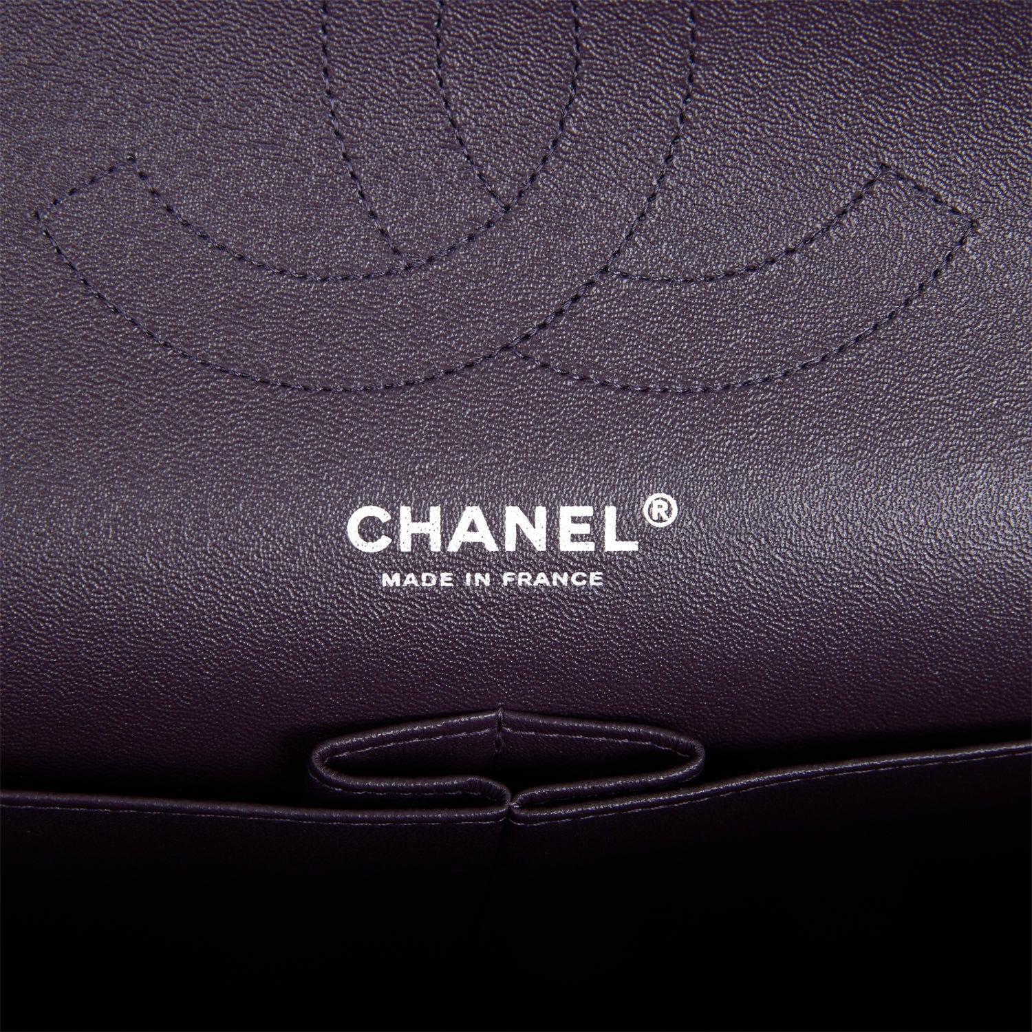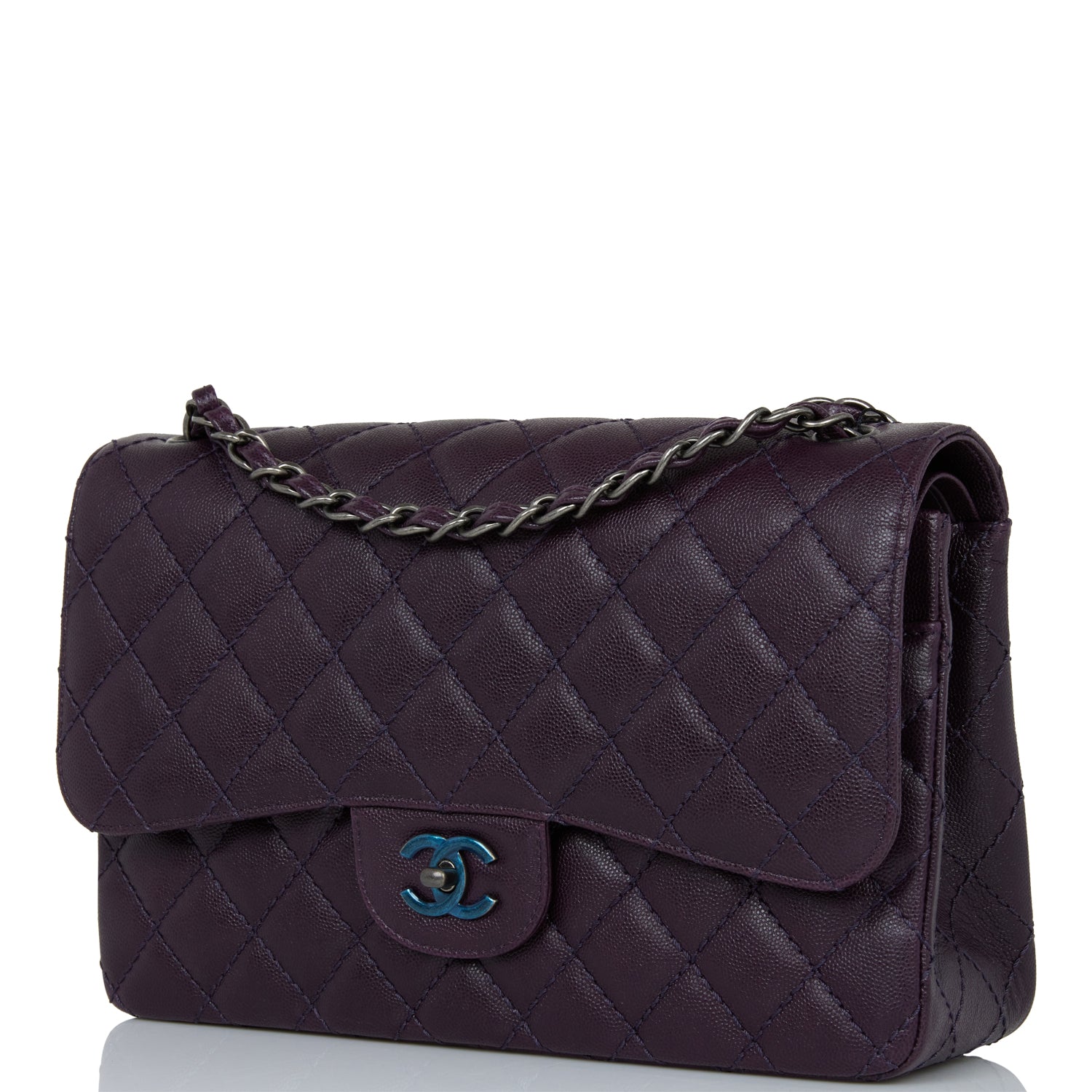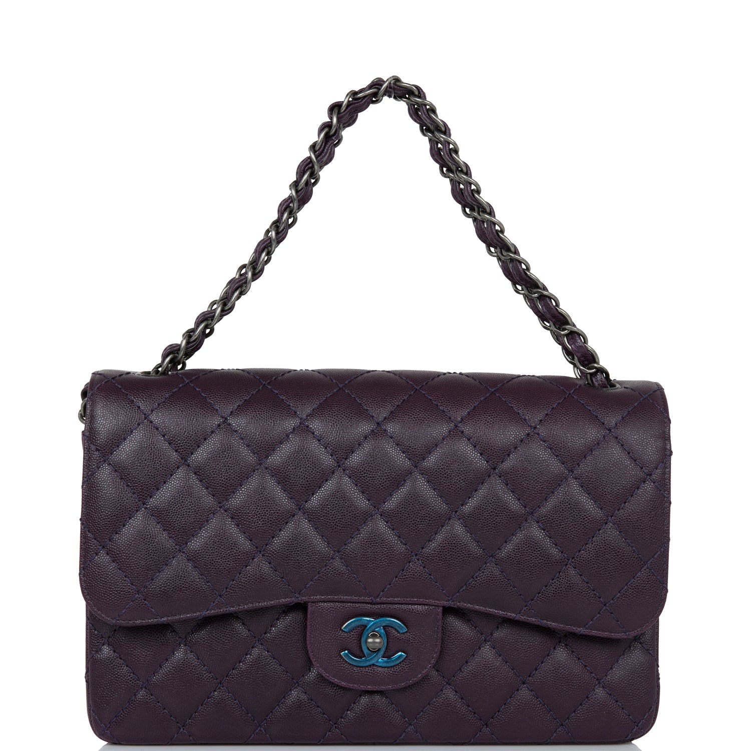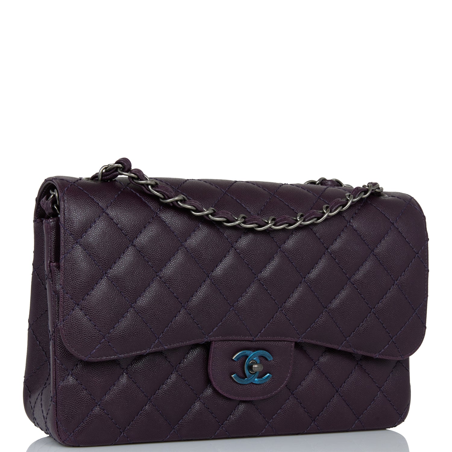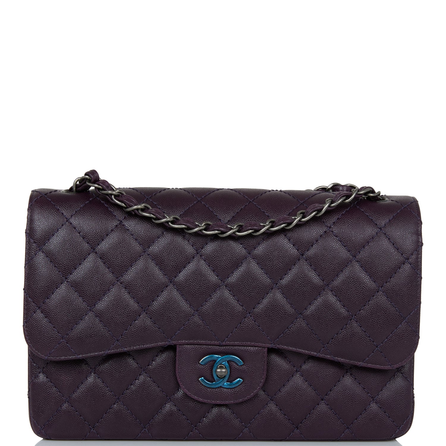 This Jumbo Classic Double Flap bag is in dark purple caviar leather with ruthenium hardware and features a front flap with signature CC turnlock closure, half moon back pocket, and adjustable interwoven ruthenium chain link and dark purple leather shoulder strap.