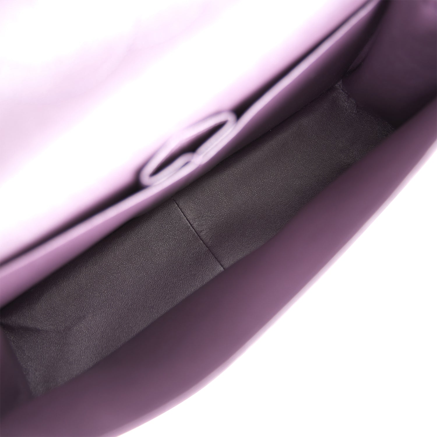 The interior is lined in dark purple leather with a "love letter" zipper compartment under the first flap, an "outer" slit pocket under the second flap, and an interior compartment with two open pockets separated by a "lipstick" compartment.