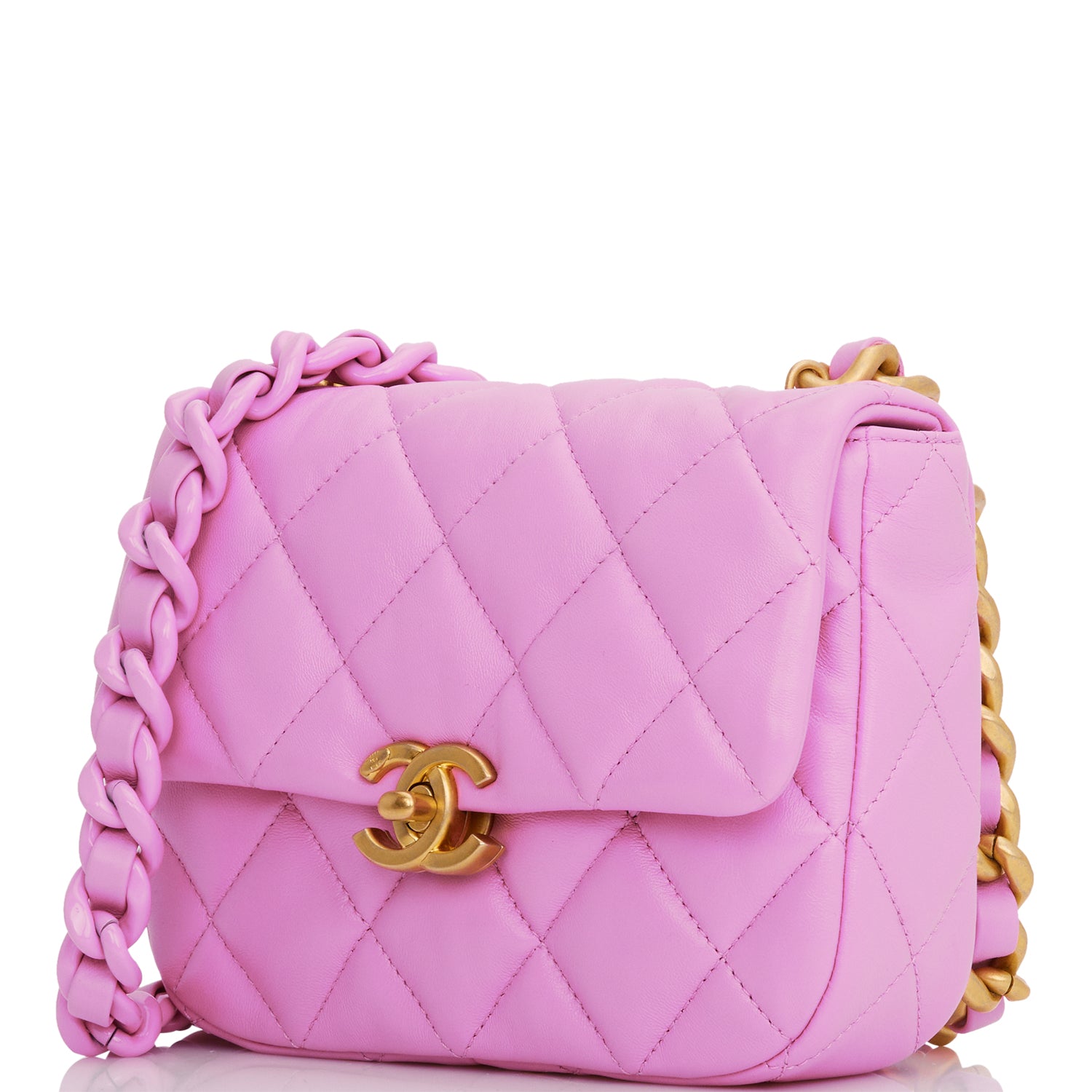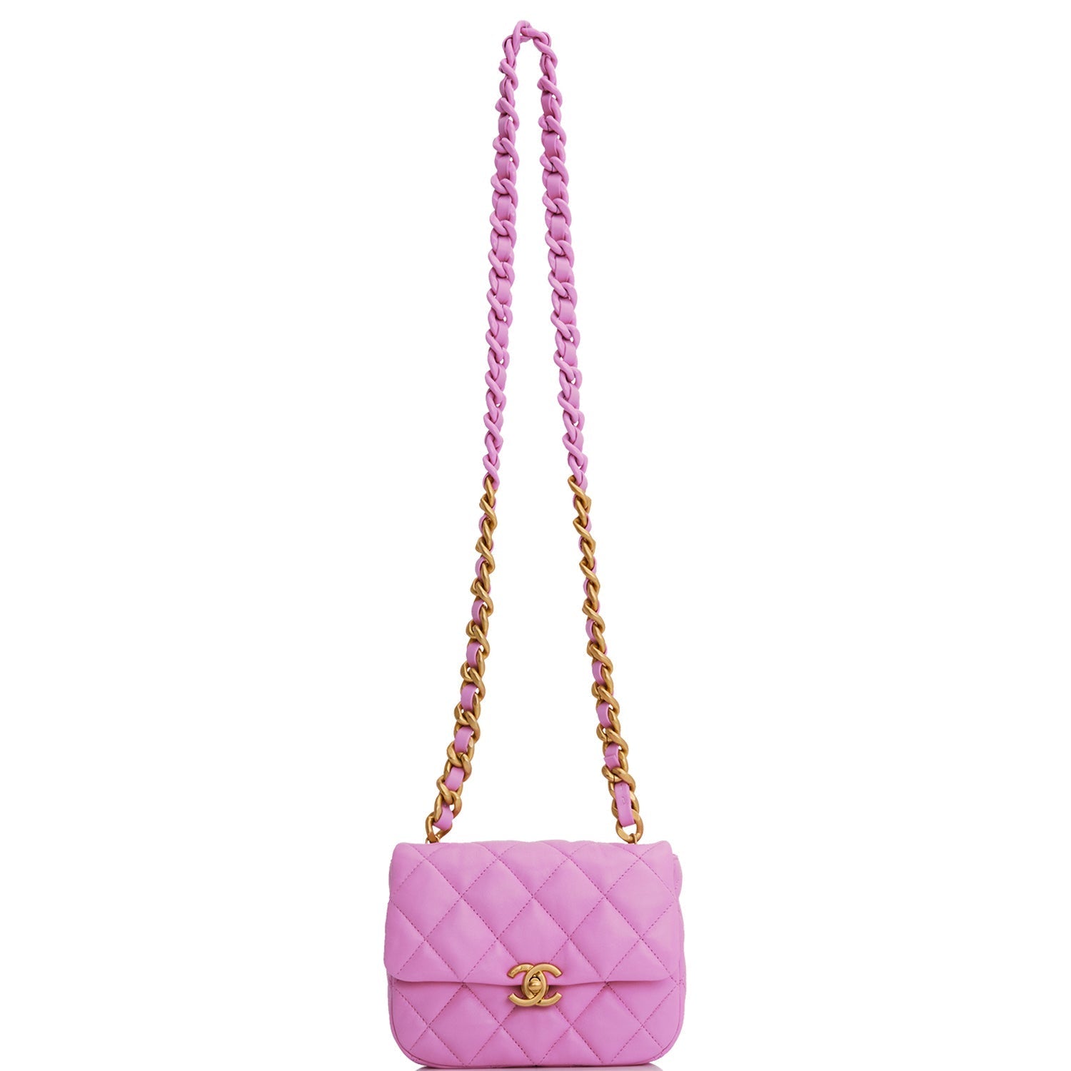This Lacquered Metal Mini flap bag is of dark pink lambskin leather with antique gold tone hardware and has a front flap with signature CC turnlock closure, single interwoven dark pink leather and antique gold tone and lacquered metal chain link shoulder/crossbody strap.