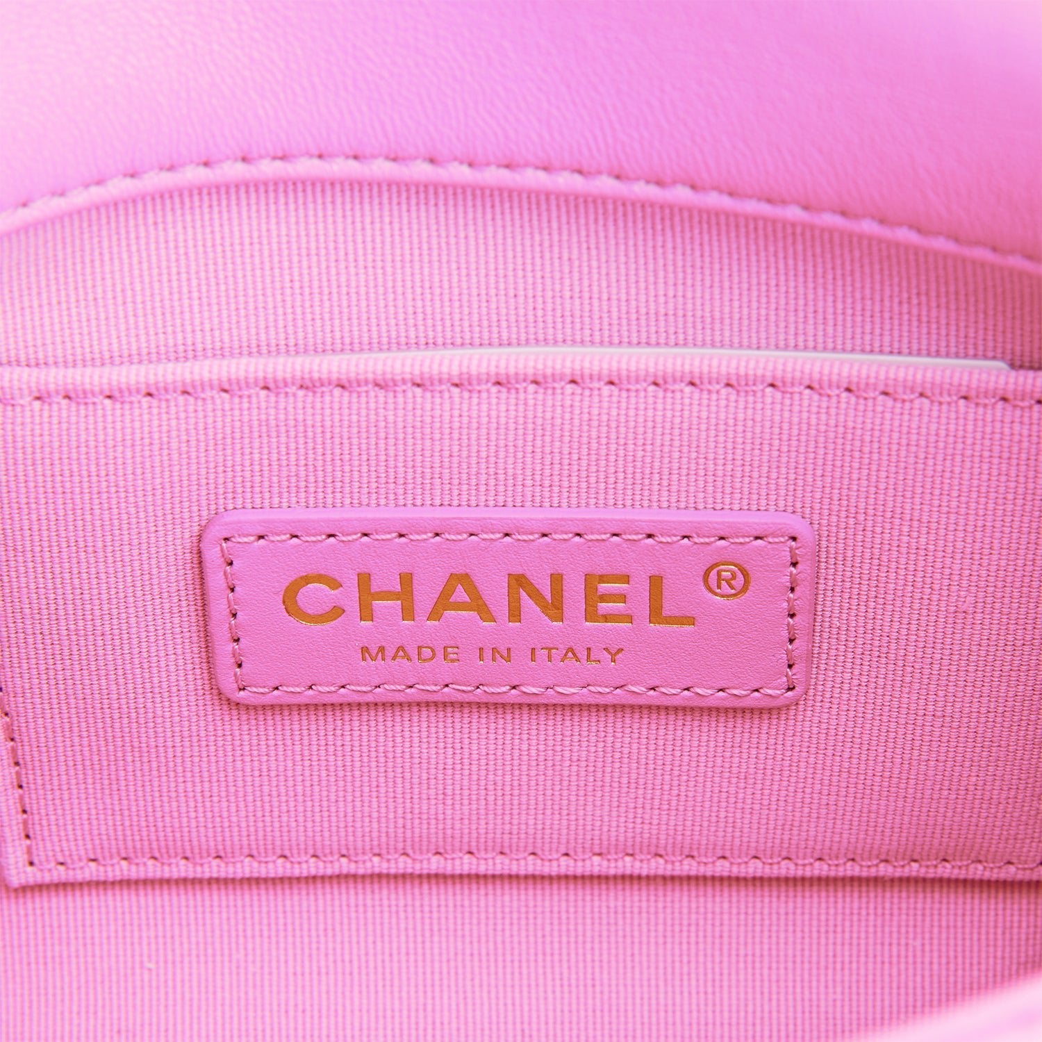 The interior is lined in pink fabric and has one slip pocket on the back wall.
