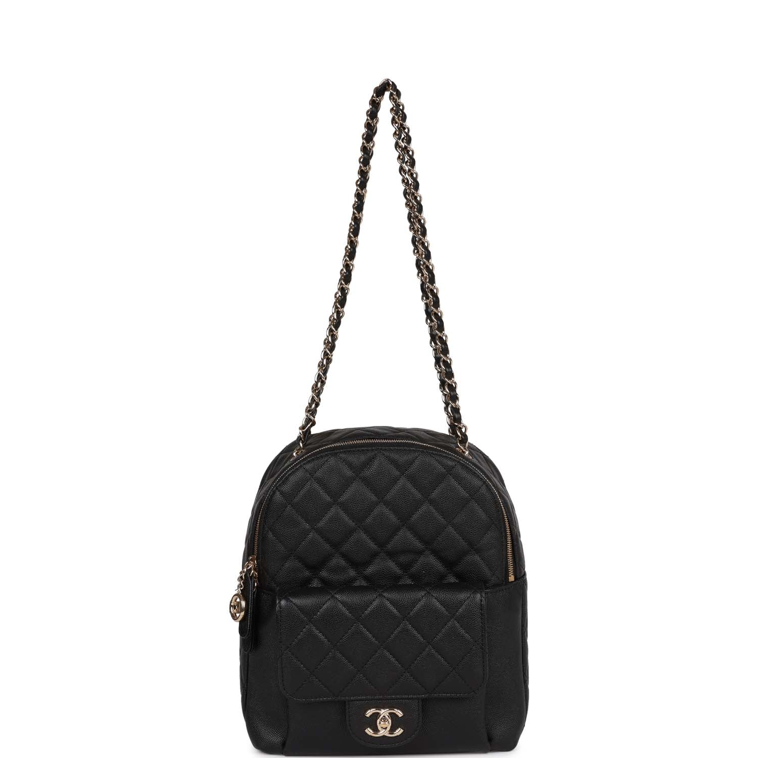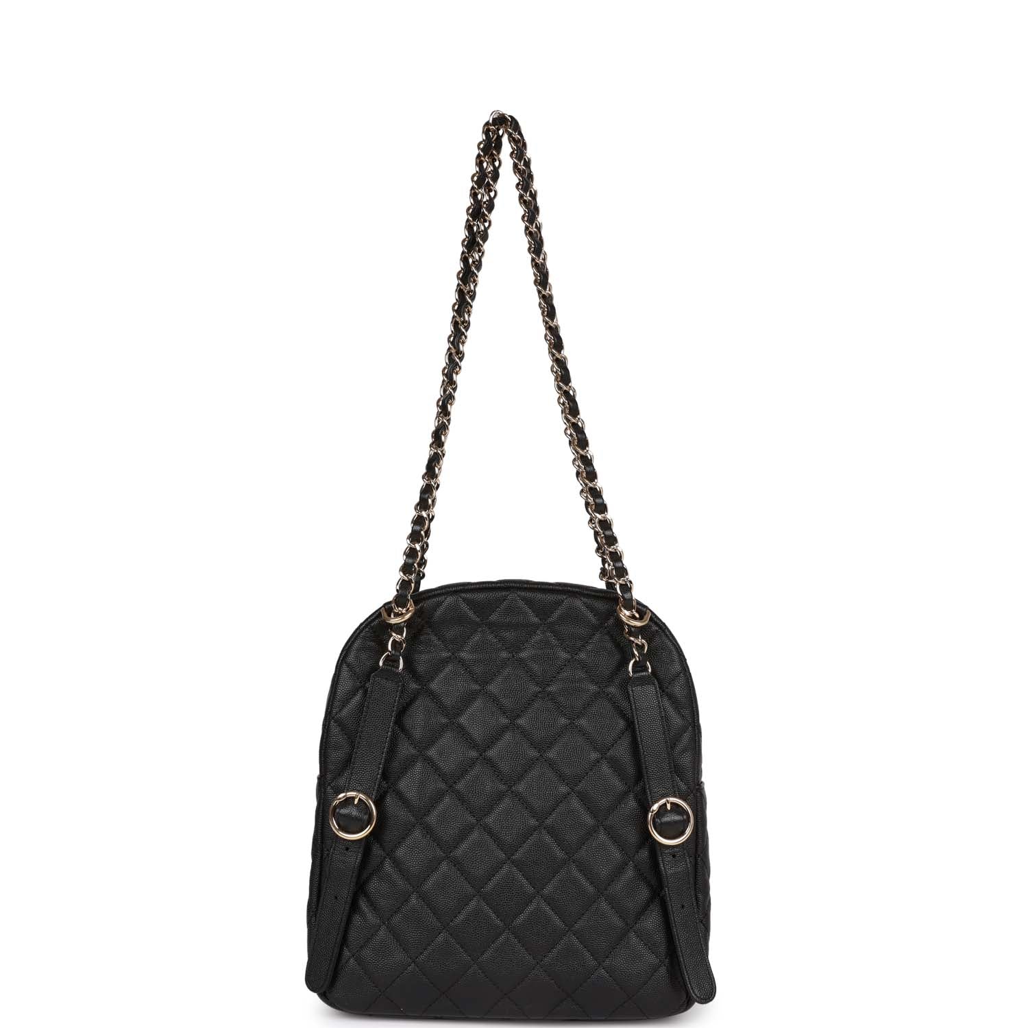 This large backpack is in Black caviar leather with light gold hardware, a front CC logo, zipper closure, and two interwoven light gold tone metal chain link and black leather backpack straps.