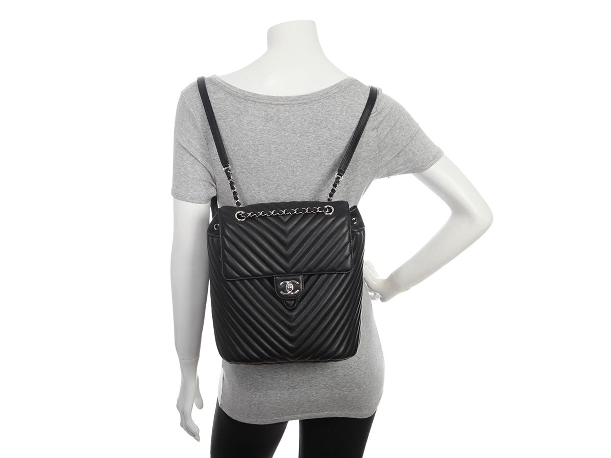 Rah, rah—show some Urban Spirit for this Chanel Large Black Chevron-Quilted Calfskin Backpack!! Crafted from calf leather with silver-tone hardware, it features a leather-threaded chain handle with a 4-inch drop and adjustable leather backpack straps for versatile wear. The flap secures with a CC turnlock over a drawstring top, and there’s a convenient slide pocket on the back for quick access. In great condition from 2018 with a dustbag, box, it has hairline scratches on the hardware and minor wear inside. Inside the black fabric lining, you’ll find one zipped and one slide pocket. Whether you're commuting to work or jetting off on a vacay, this chic backpack keeps up in style!