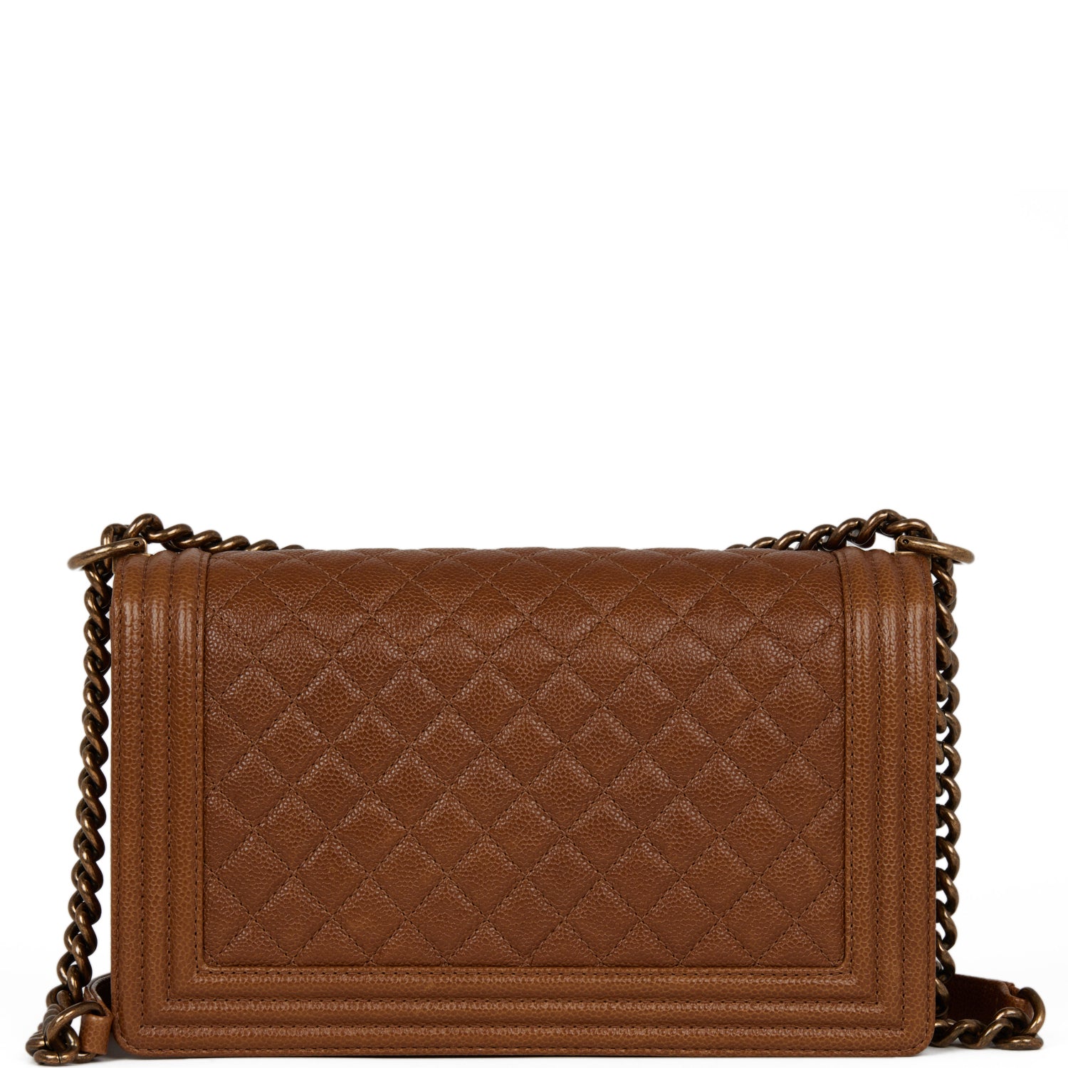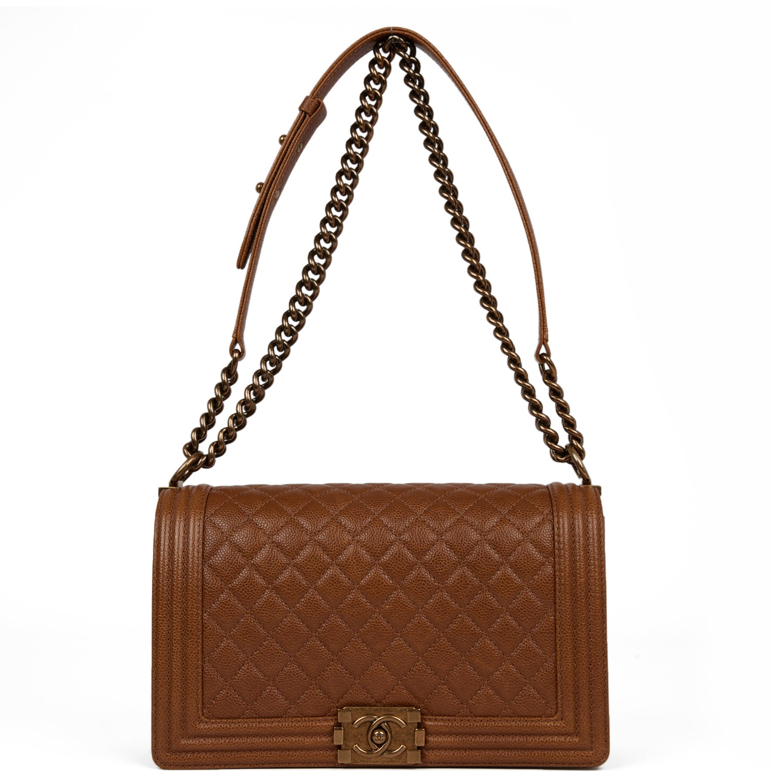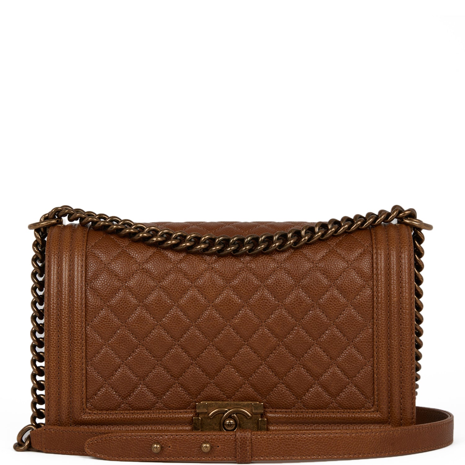 This Large Medium Boy bag is in brown caviar leather with antique gold tone hardware and features a full front flap with the Le Boy CC push lock closure and an antique gold tone chain link and brown leather padded shoulder/crossbody strap.