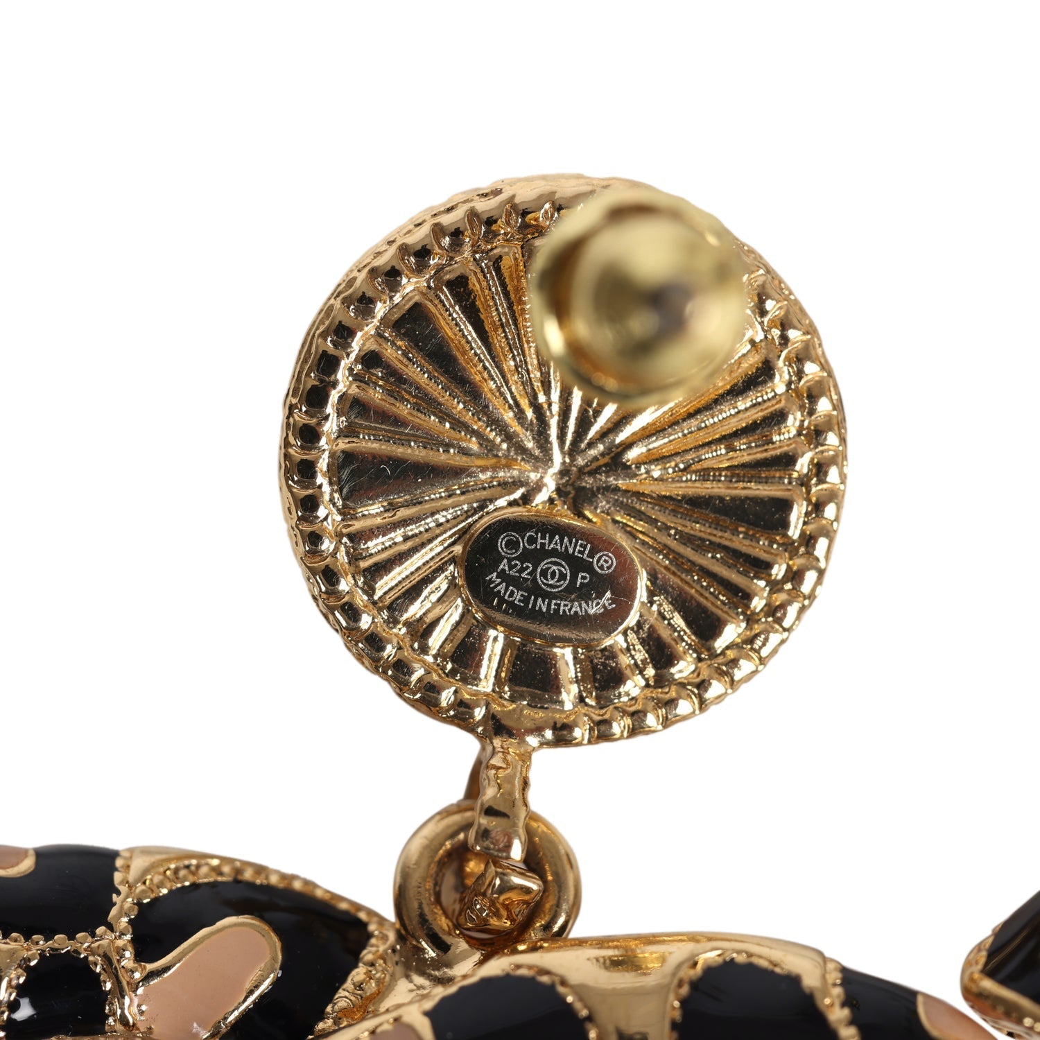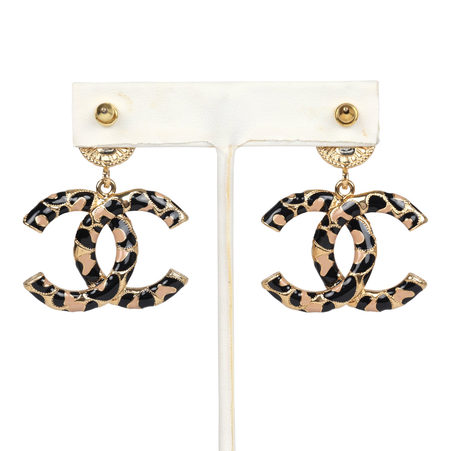 Chanel Large Leopard Print CC Dangle Earrings Black and Brown Enamel Gold Hardware