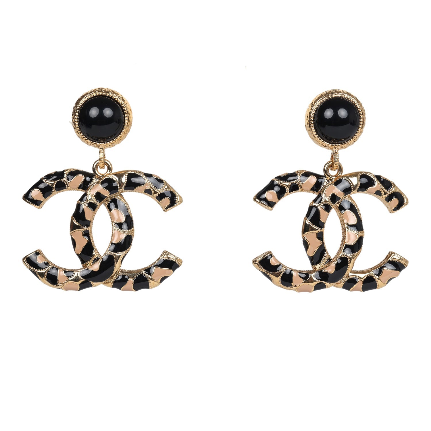 Chanel Large Leopard Print CC Dangle Earrings Black/Brown Enamel Gold Hardware