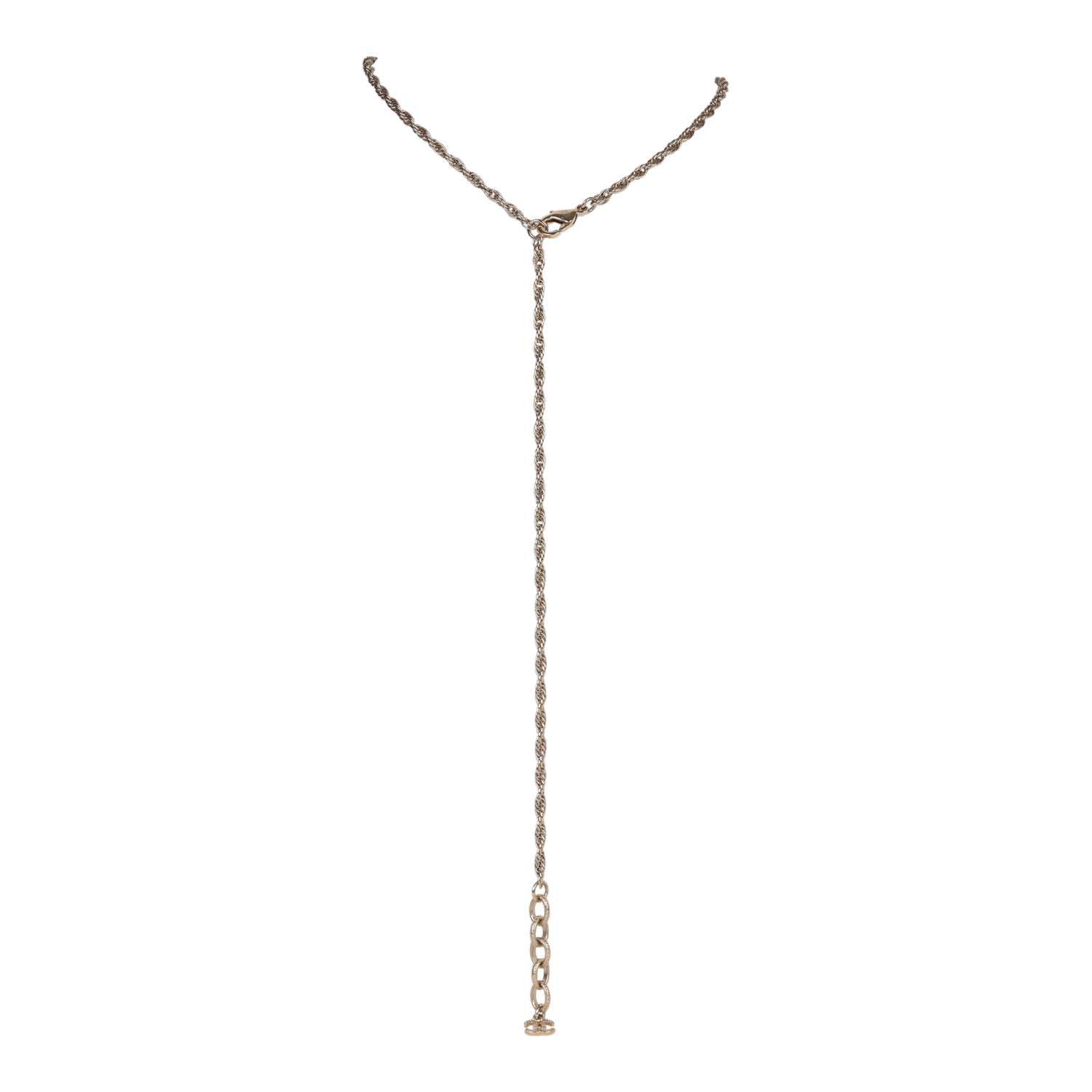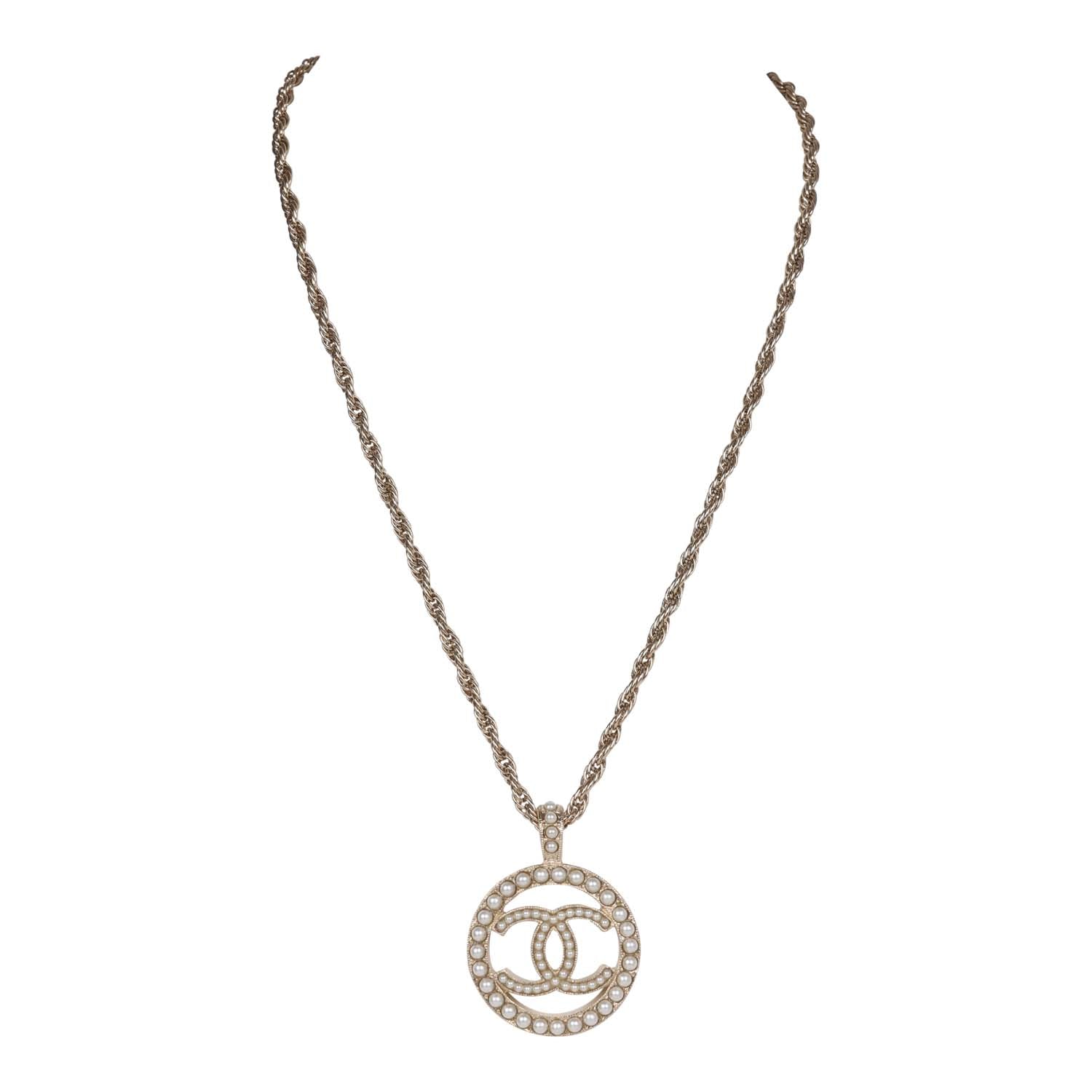 Chanel Large Logo Pearl and Light Gold Metal Pendant Necklace