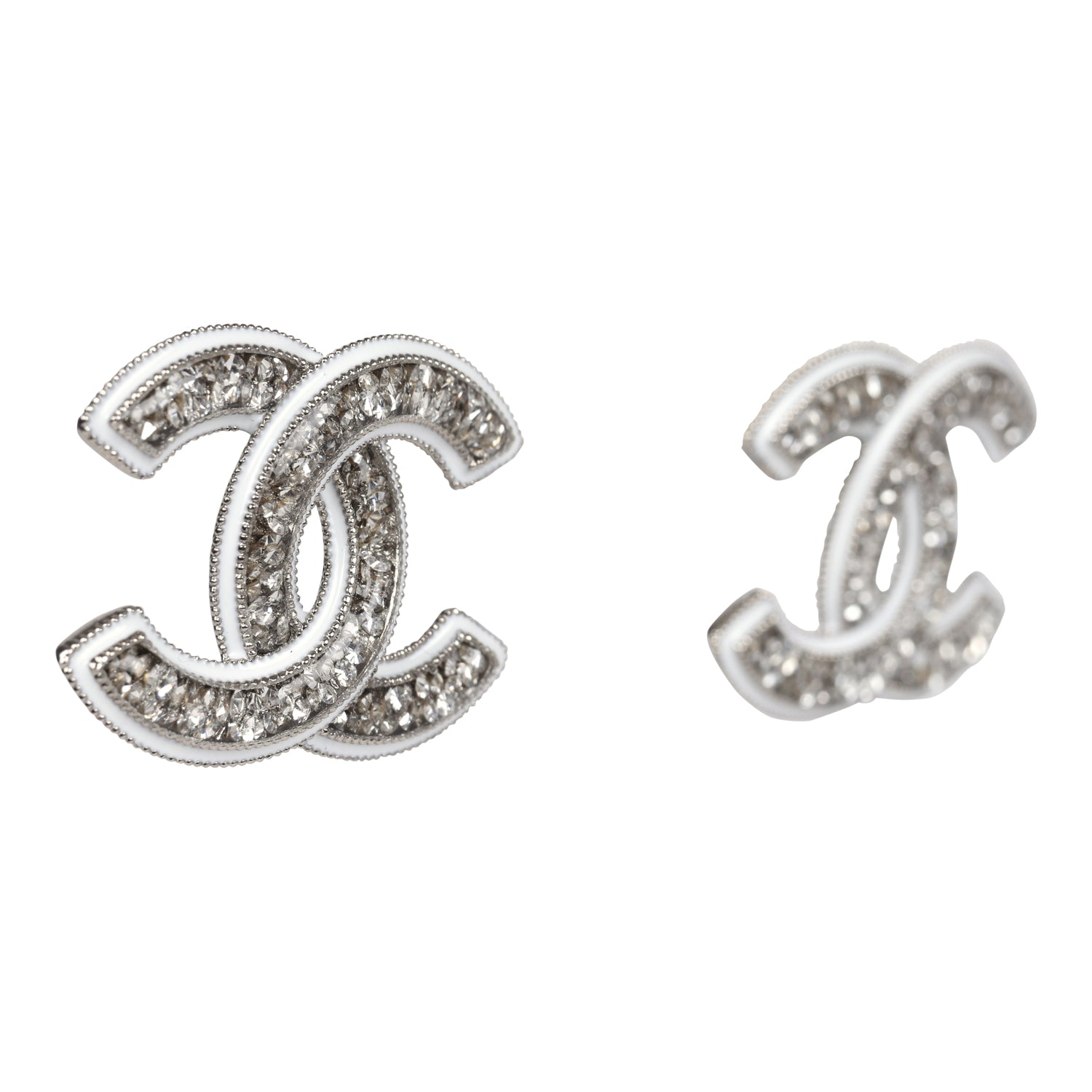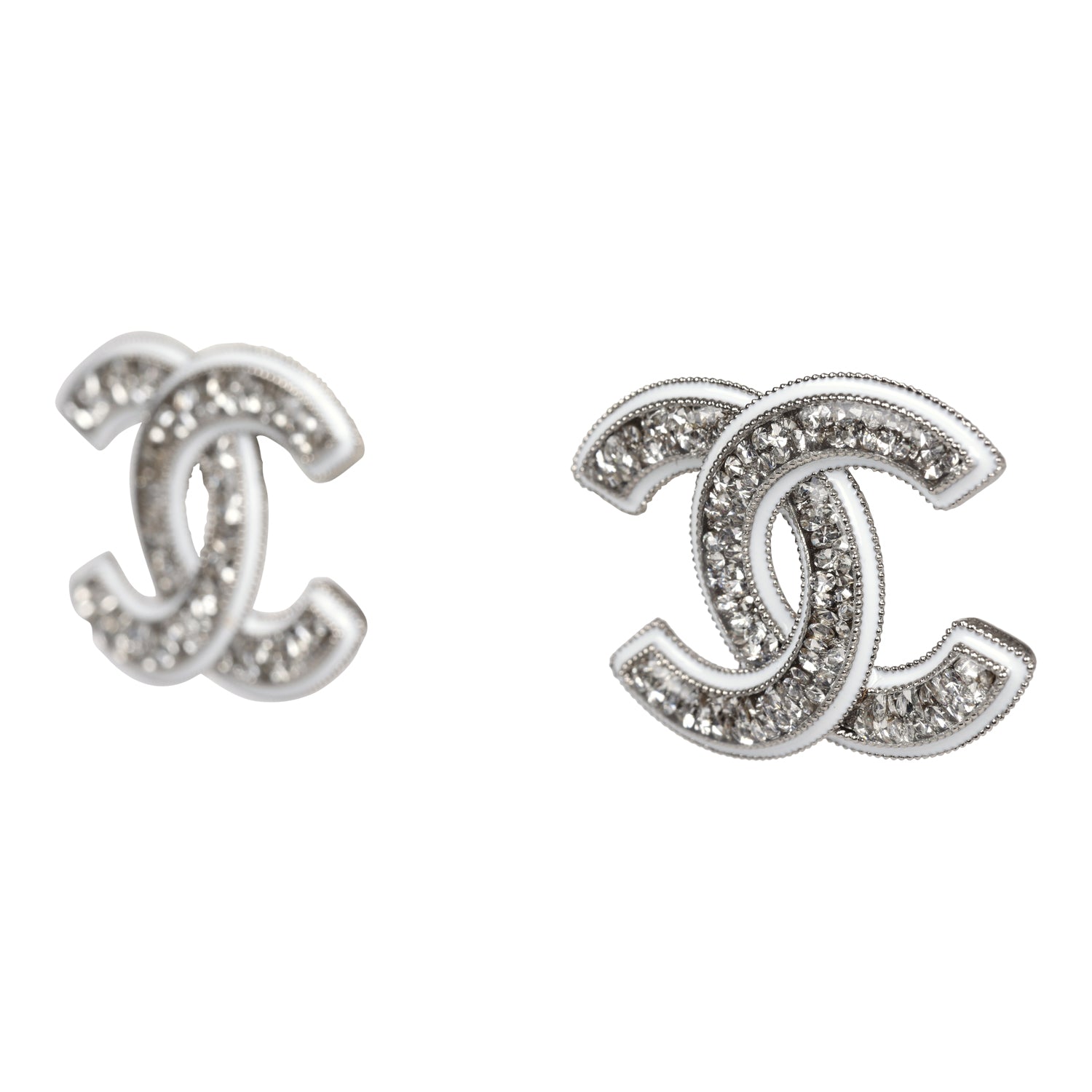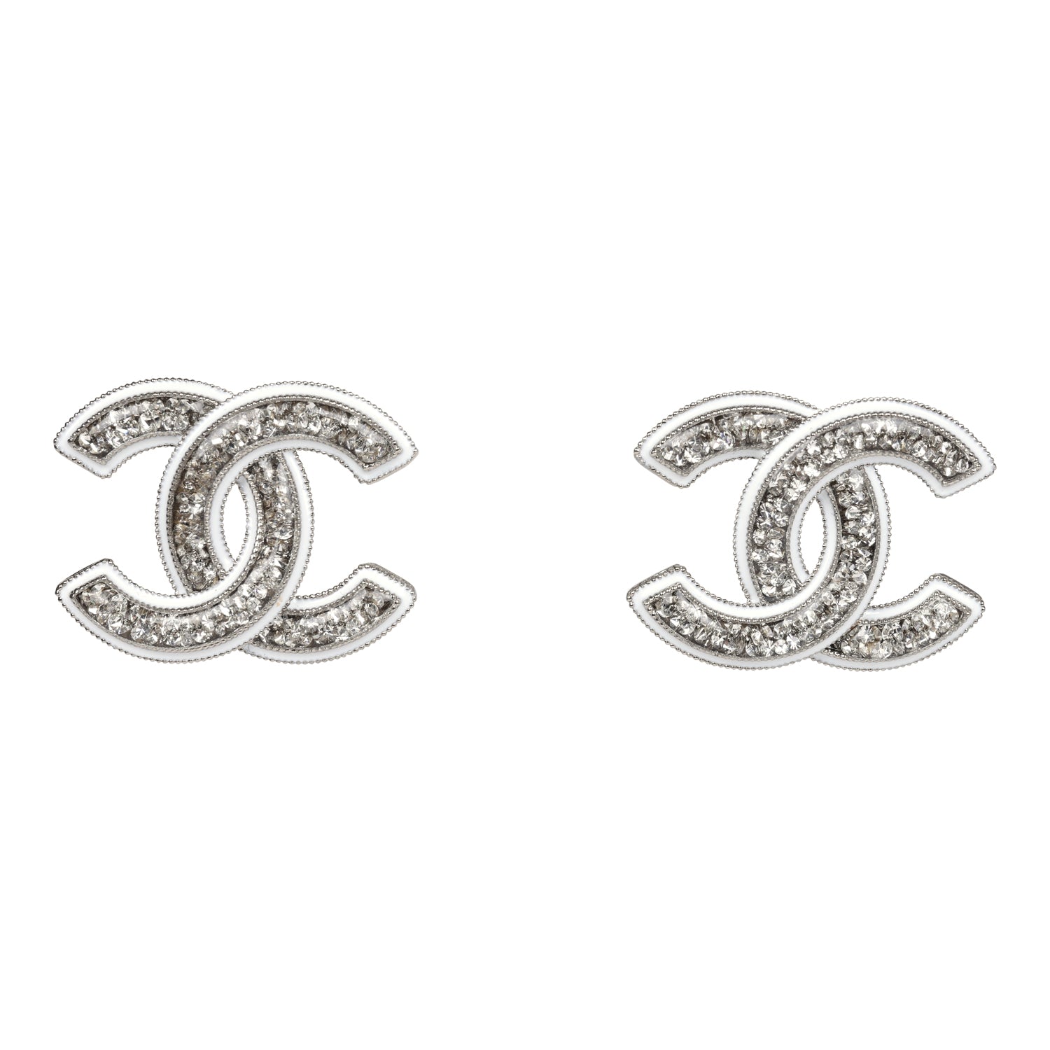 Chanel Large Lucite CC Crystal Stud Earrings White Enamel and Silver Hardware