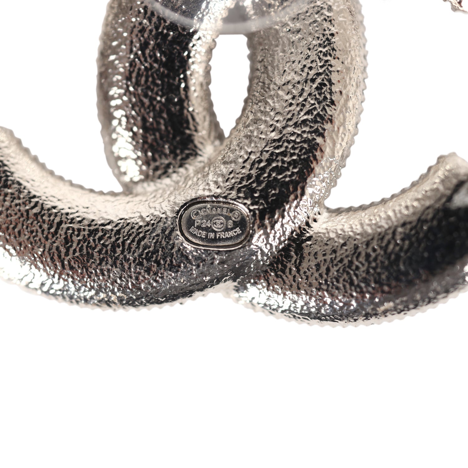 These Chanel Large Lucite CC Crystal stud earrings are in white enamel and silver tone hardware, featuring large signature CC logo earrings with a silver beaded border and white enamel trim and has faux crystal in the CC's with a lucite material and post back closures.