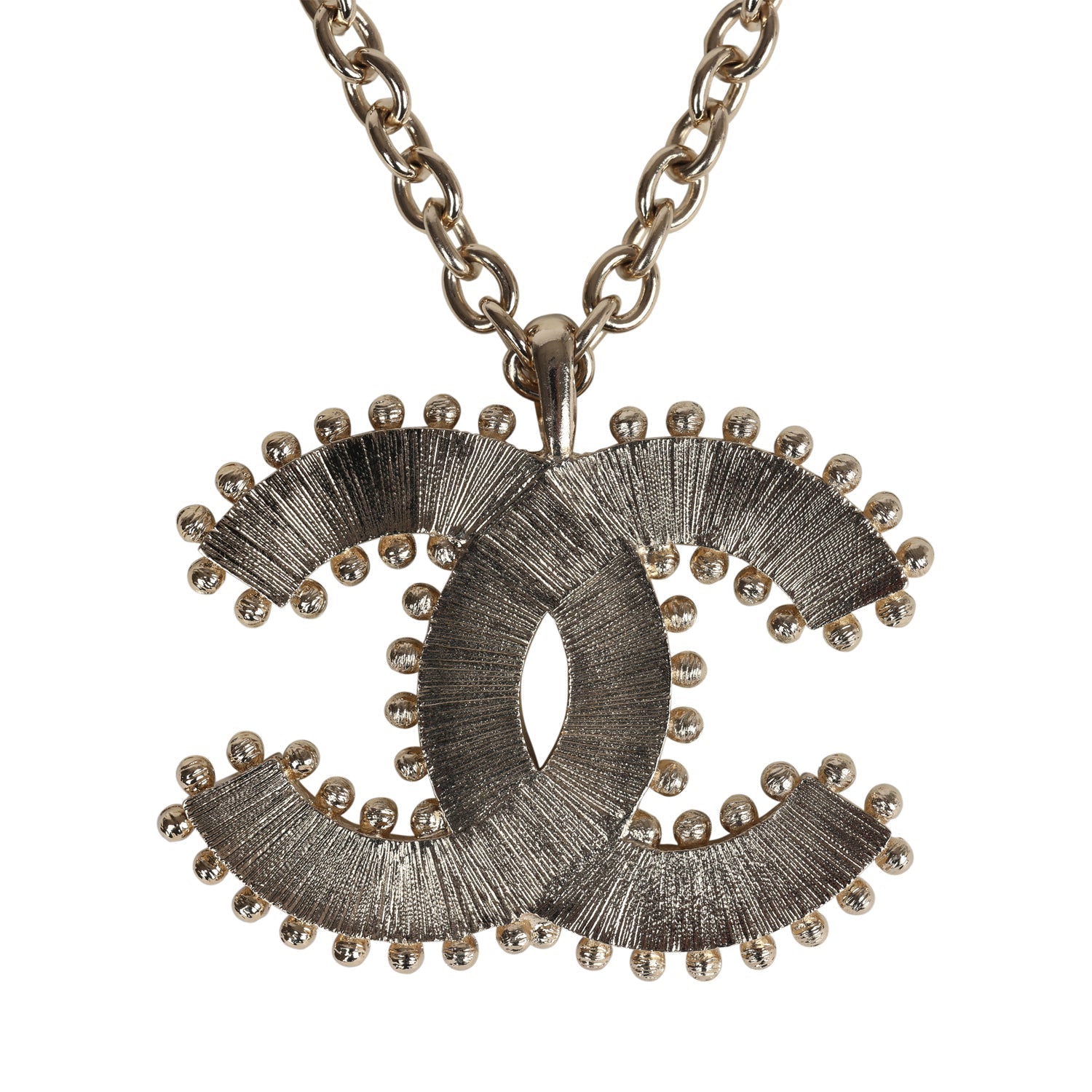 This Chanel large quilted resin CC pendant necklace is of gold tone metal, featuring a large resin textured signature CC logo with gold tone beaded trim and has a lobster clap closure.