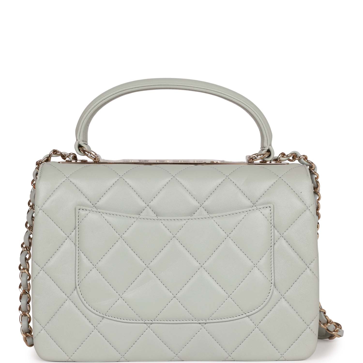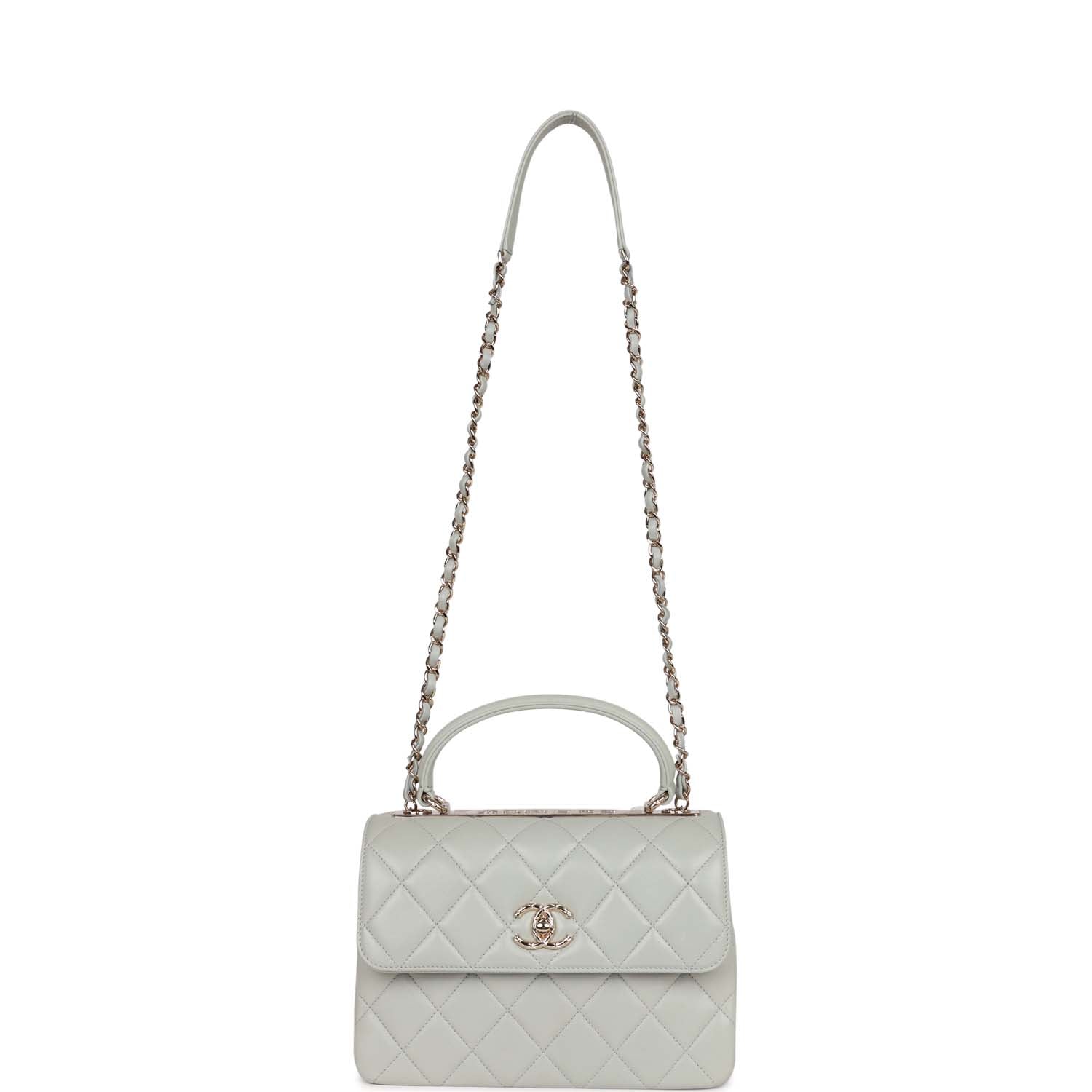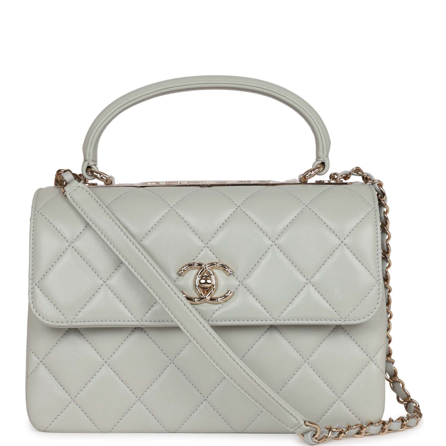 This Large Trendy CC bag is in Grey lambskin leather with light gold tone hardware and has a front flap with signature CC turnlock closure, rear half moon pocket, single interwoven grey leather and light gold tone chain link shoulder/crossbody strap and top handle.