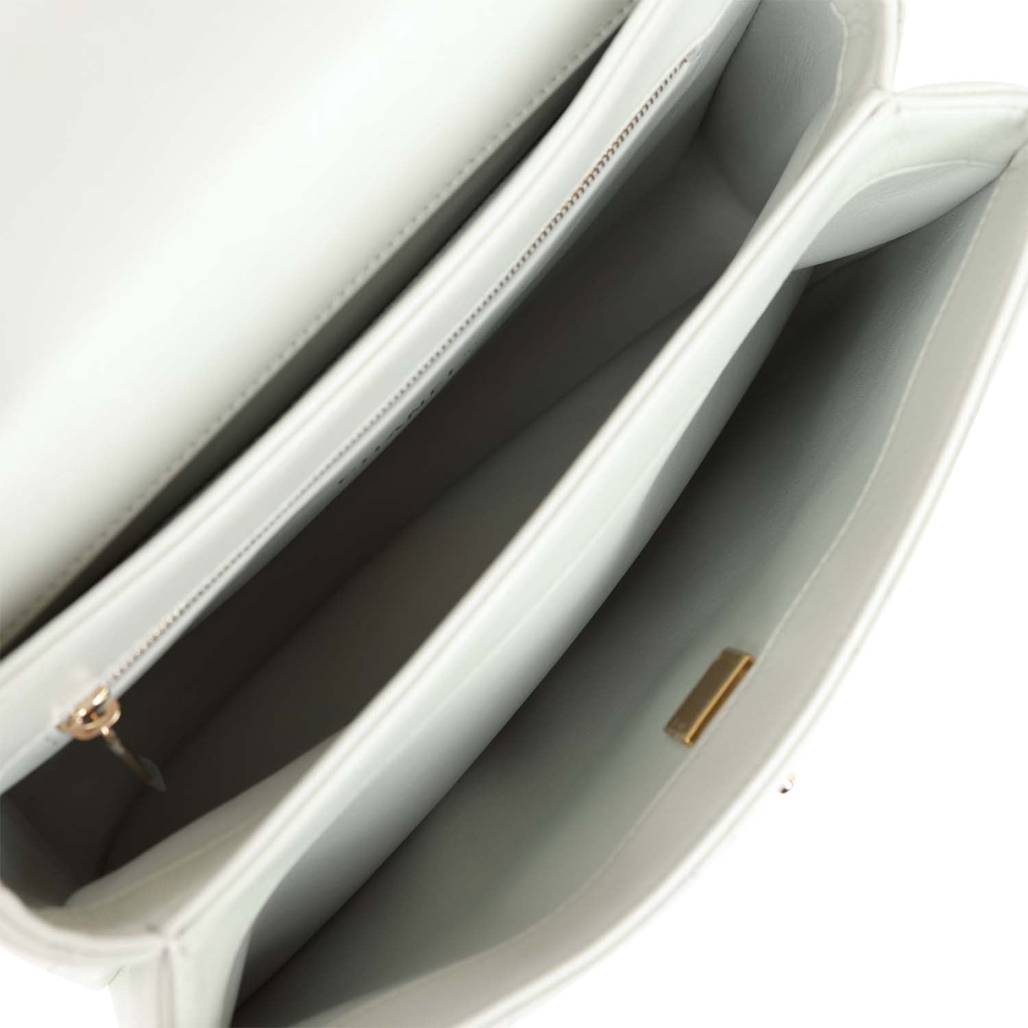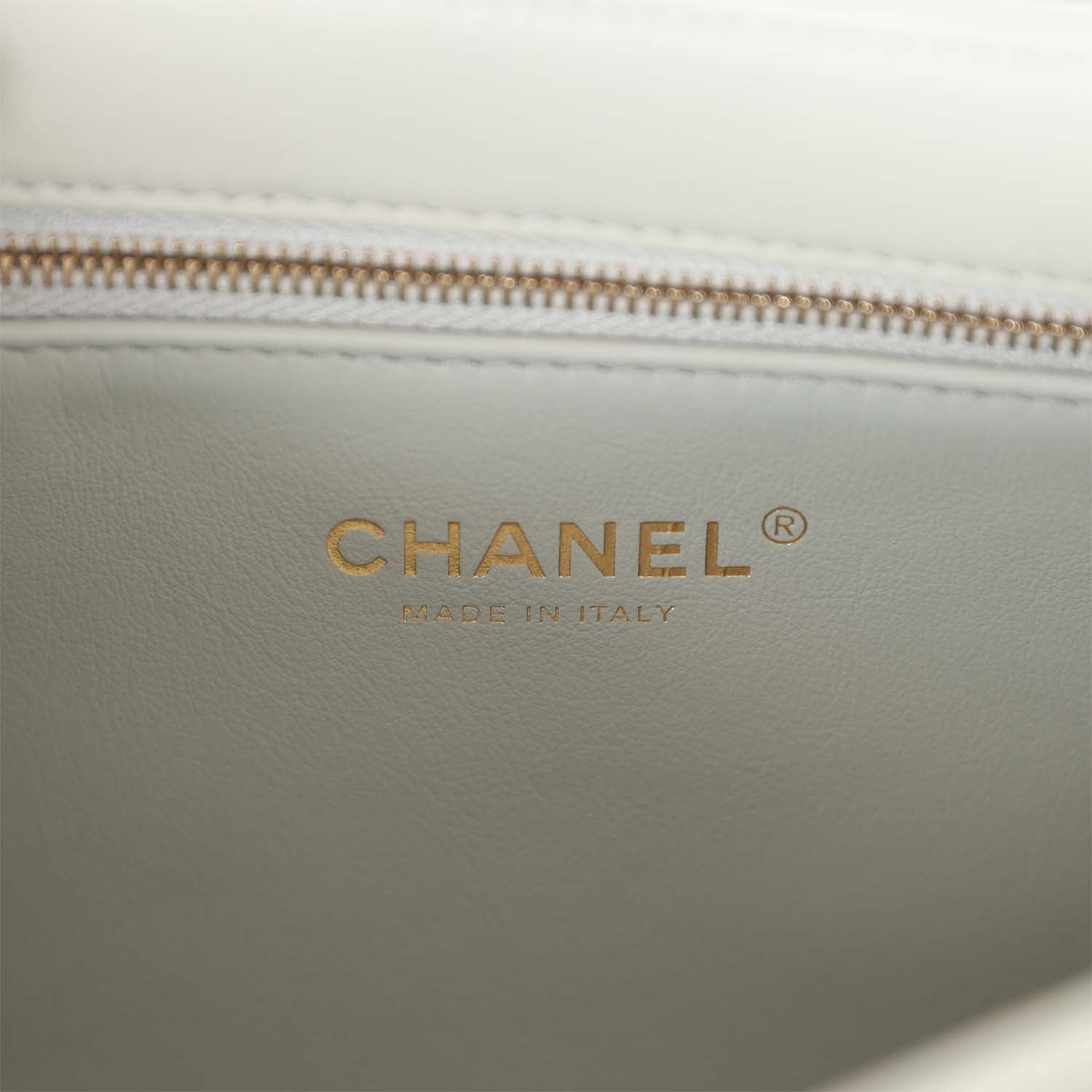 The interior is lined in grey leather and features three compartments, a zipper pocket with Chanel pull and an open pocket.
