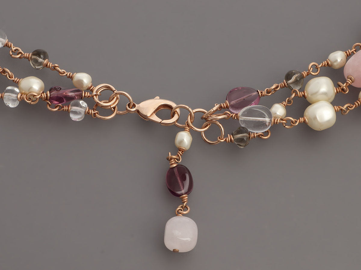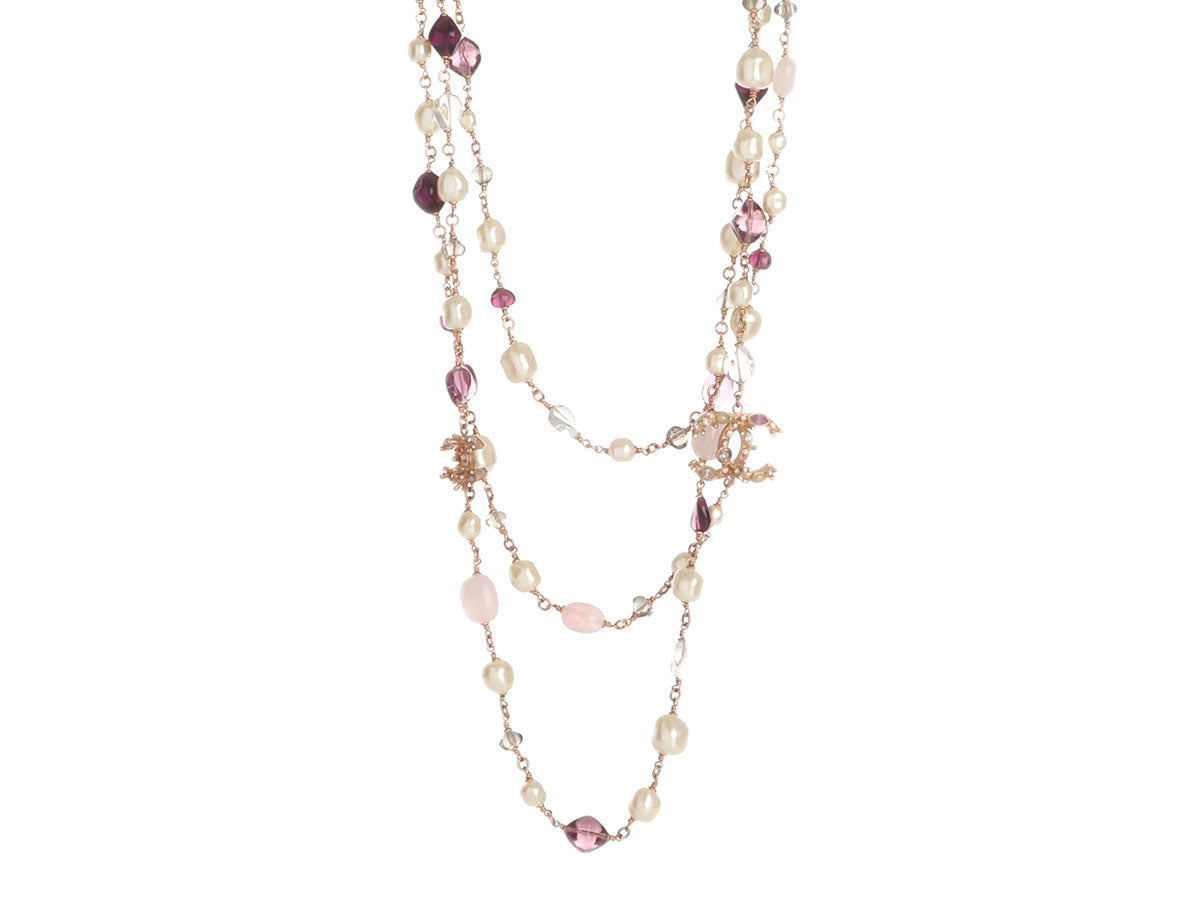 This Chanel Long Layered CC Logo Necklace is a statement-making piece that exudes effortless elegance! Crafted from rose gold-tone metal, this stunning design features three strands adorned with four bejeweled CC logos, along with a lux mix of white faux pearls and beads in shades of purple, black, clear, and pink. In very good condition with a box and pouch, it has wear on the metal. Its layered look adds dimension, making it perfect for both casual chic and evening glam!