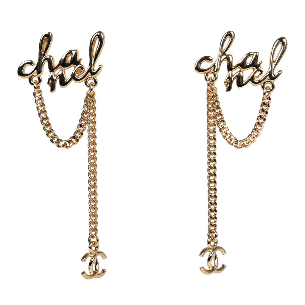 Chanel Logo Drop Chain Earrings Gold Metal