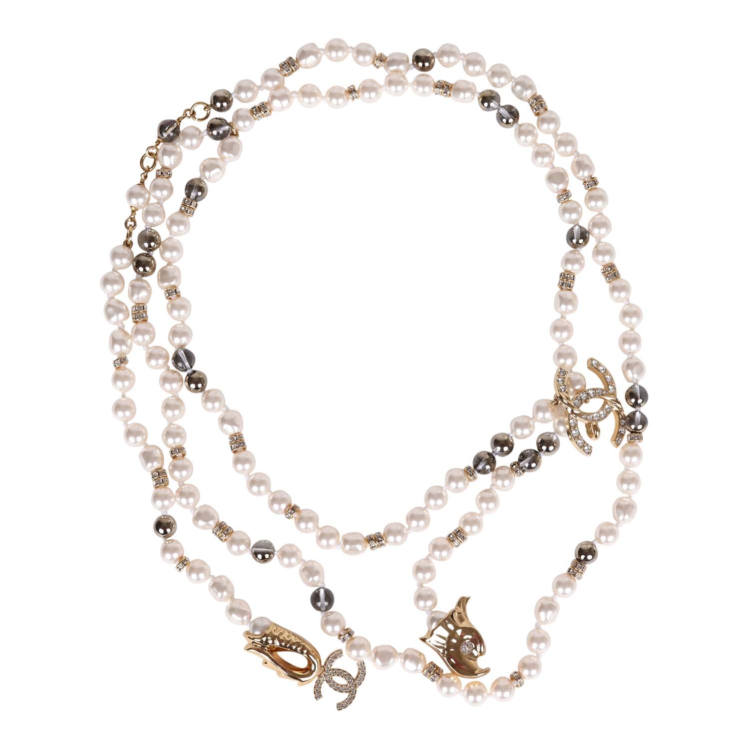 This Chanel long pearl necklace is in clear gripoix with strass beads and gold tone metal CC fish head details throughout.