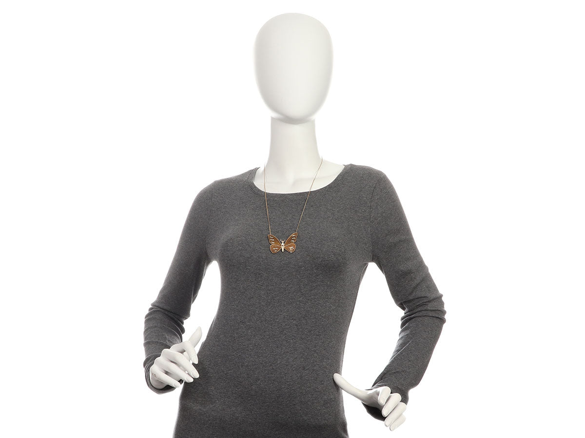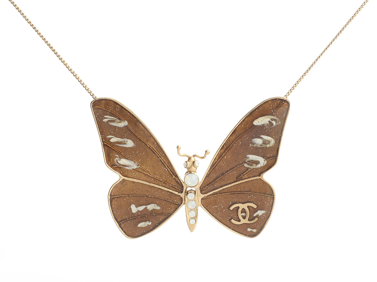 This ethereal Chanel Mauve Butterfly Pendant Necklace looks like it’s ready to take wing! But don’t worry, it’s firmly attached to a 24-inch delicate gold-tone chain with a lobster clasp. The butterfly measures 2.2 inches by 1.5 inches and is mauve in color with opal-colored crystals adorning the body and splashes in the wings that bring a shimmer to this flutterby. For logo lovers, you’ll find gold-tone interlocking C’s in the lower right corner. New and never worn, it comes with a pouch and box and is large enough to draw some very positive attention!