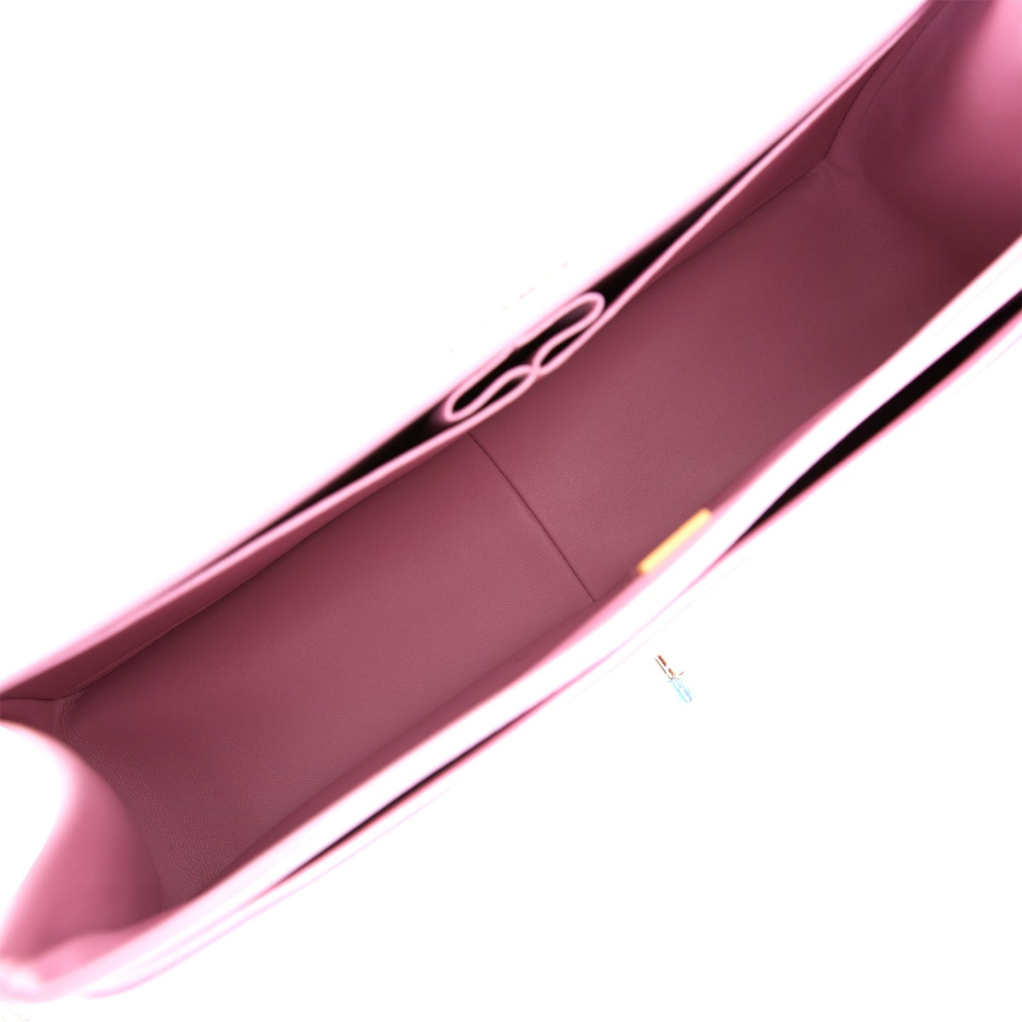The interior is lined in dark pink leather with a "love letter" zipper compartment under the first flap, an "outer" slit pocket under the second flap, and an interior compartment with two open pockets separated by a "lipstick" compartment.