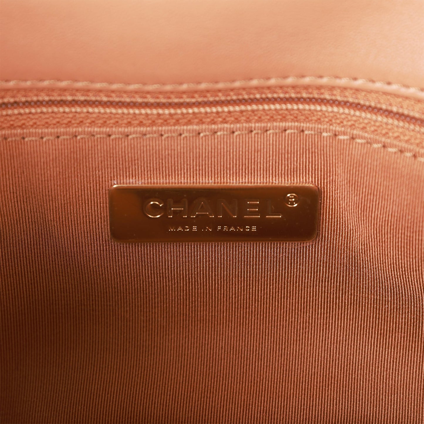 This Medium 19 Flap bag is of Caramel calfskin with mixed metal hardware and has the signature diamond quilting, signature CC interlocking closure, exterior back pocket, chain top handle, and long mixed metal and caramel leather chain.