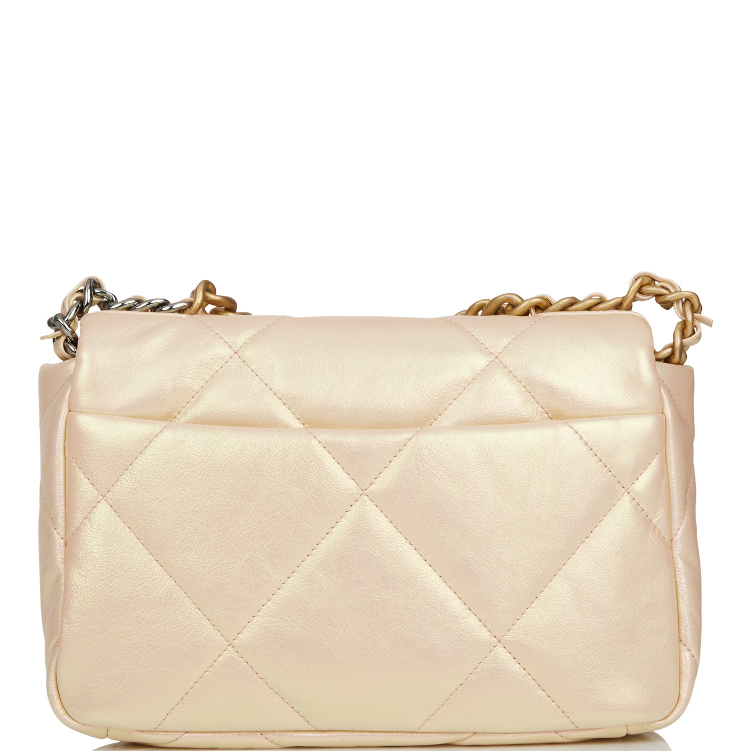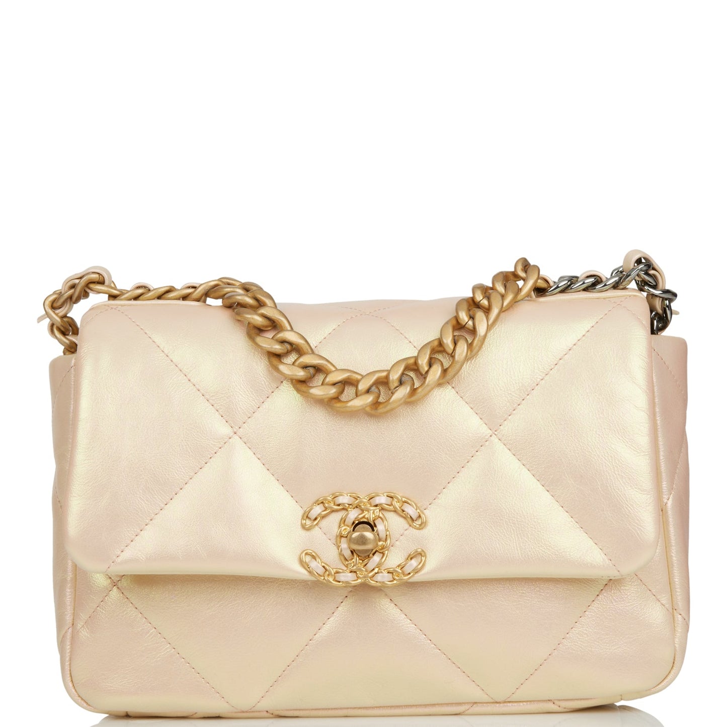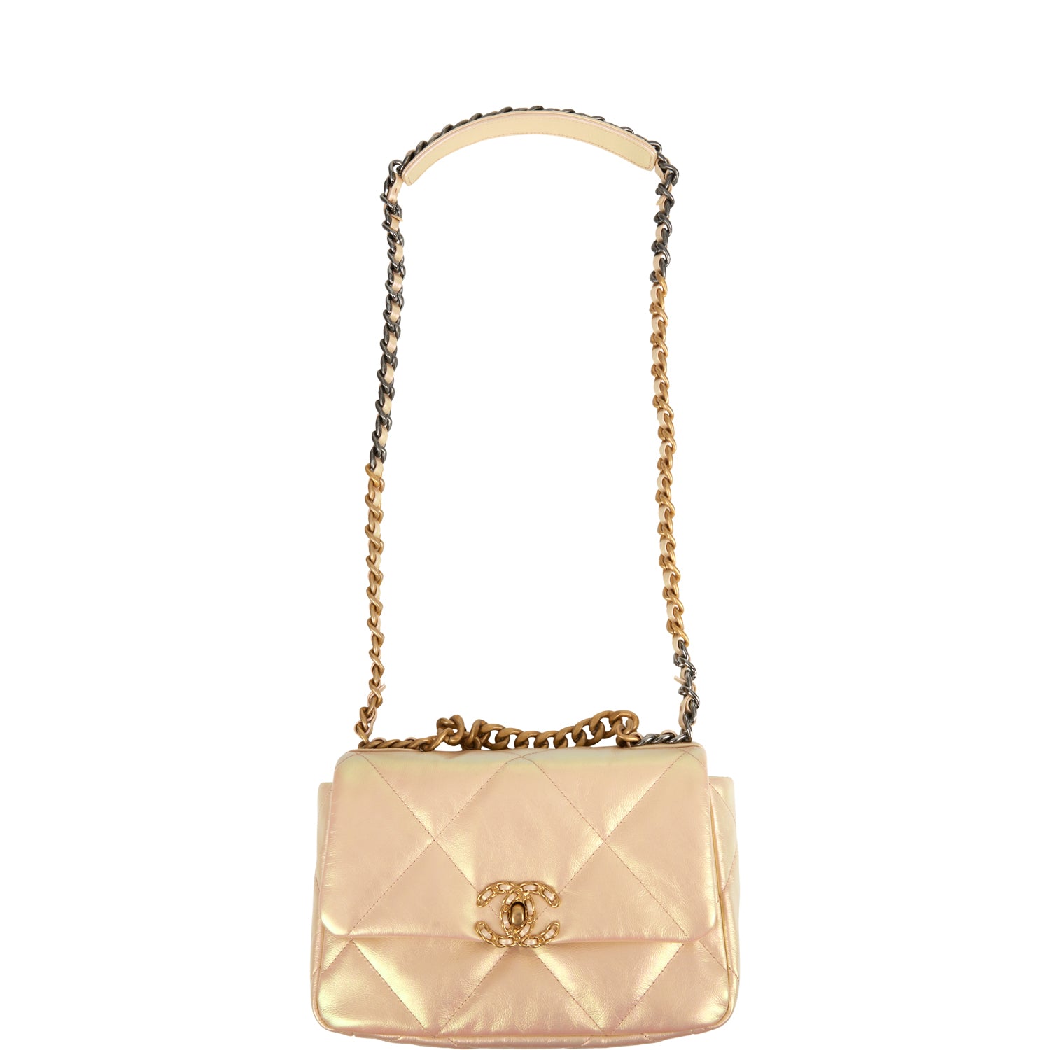 This Medium 19 Flap bag is of rose iridescent calfskin with mixed metal hardware and has the signature diamond quilting, signature CC interlocking closure, exterior back pocket, chain top handle, and long mixed metal and rose leather chain.