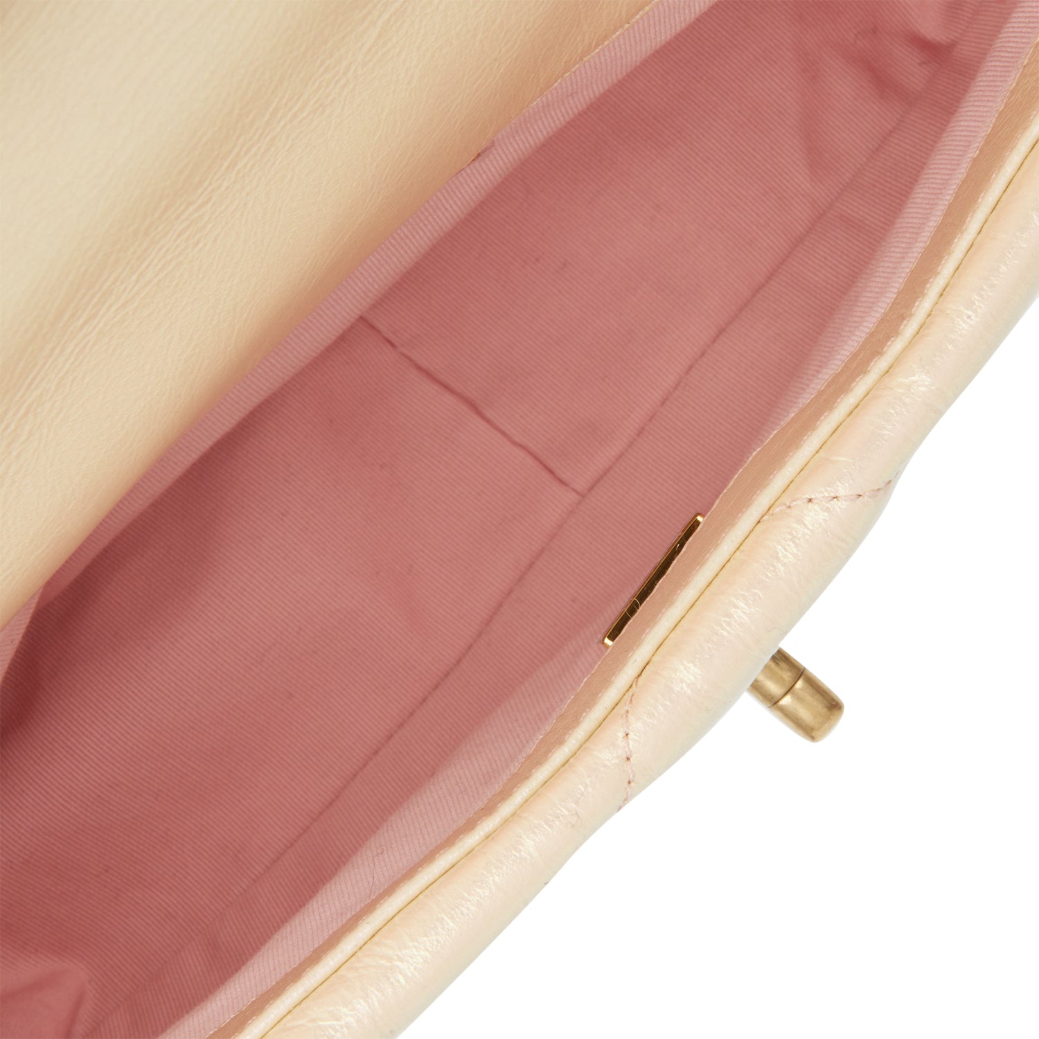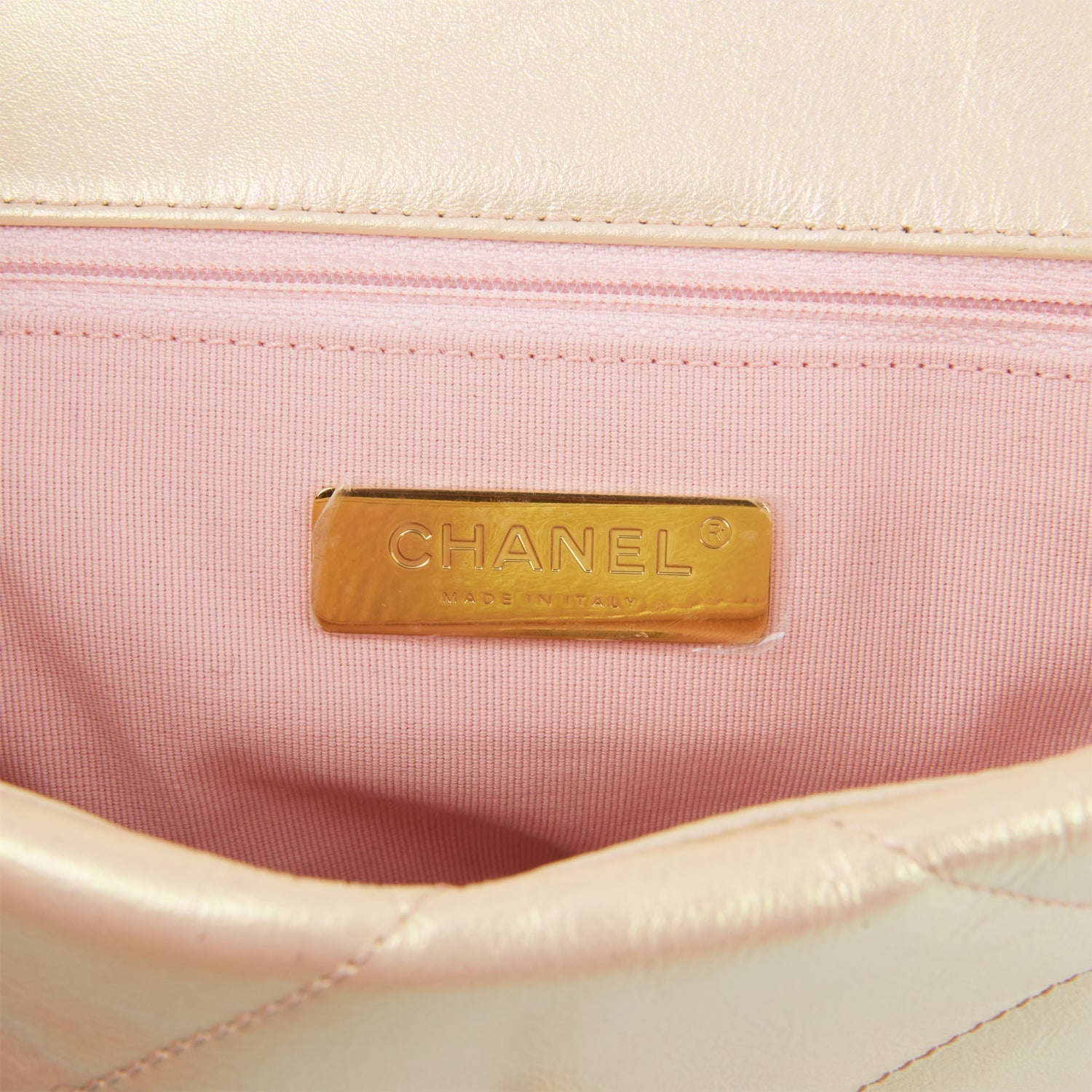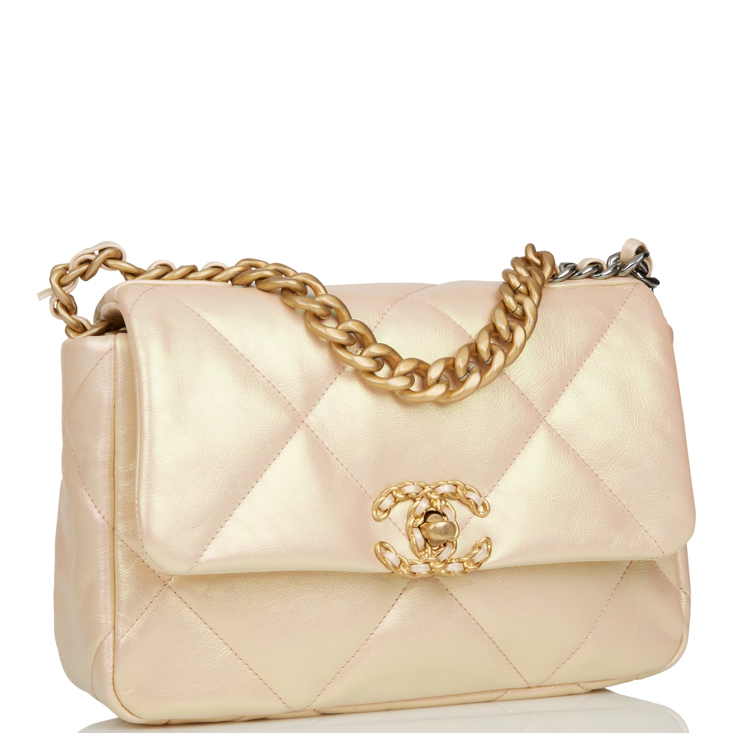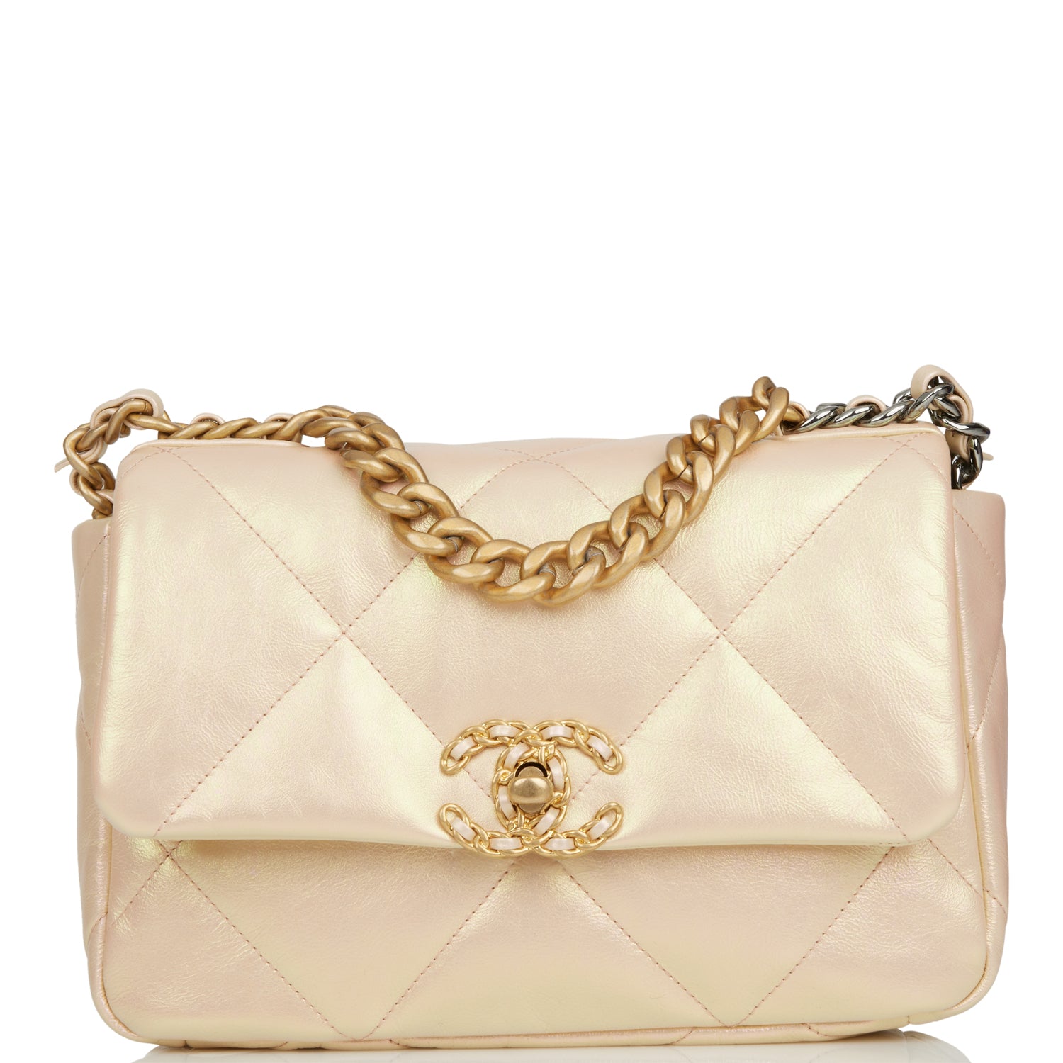 This Medium 19 Flap bag is of rose iridescent calfskin with mixed metal hardware and has the signature diamond quilting, signature CC interlocking closure, exterior back pocket, chain top handle, and long mixed metal and rose leather chain.