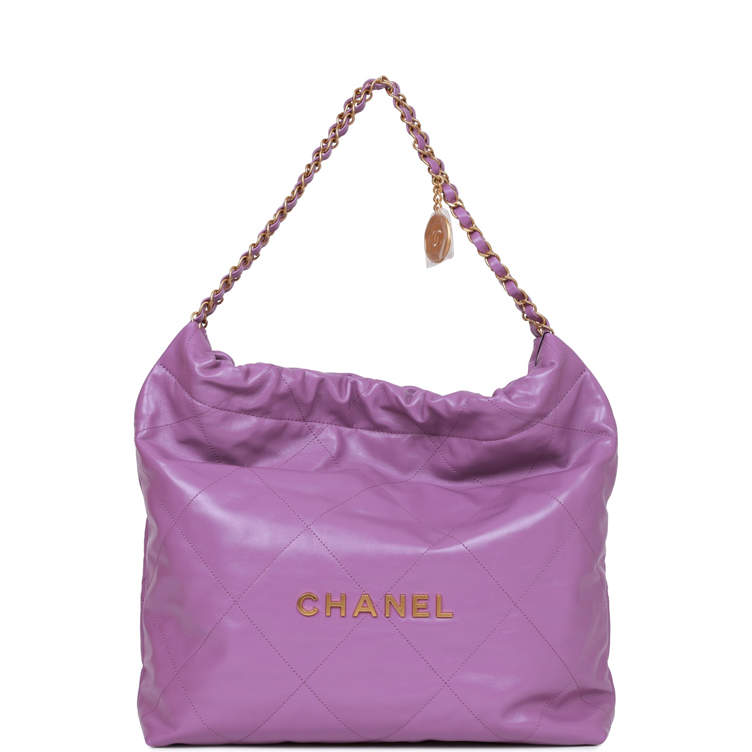 This Medium 22 hobo bag is of purple calfskin with gold tone hardware and has the signature diamond quilting, CHANEL on the front in gold metal, removable pouch, and long gold tone and purple leather chain.