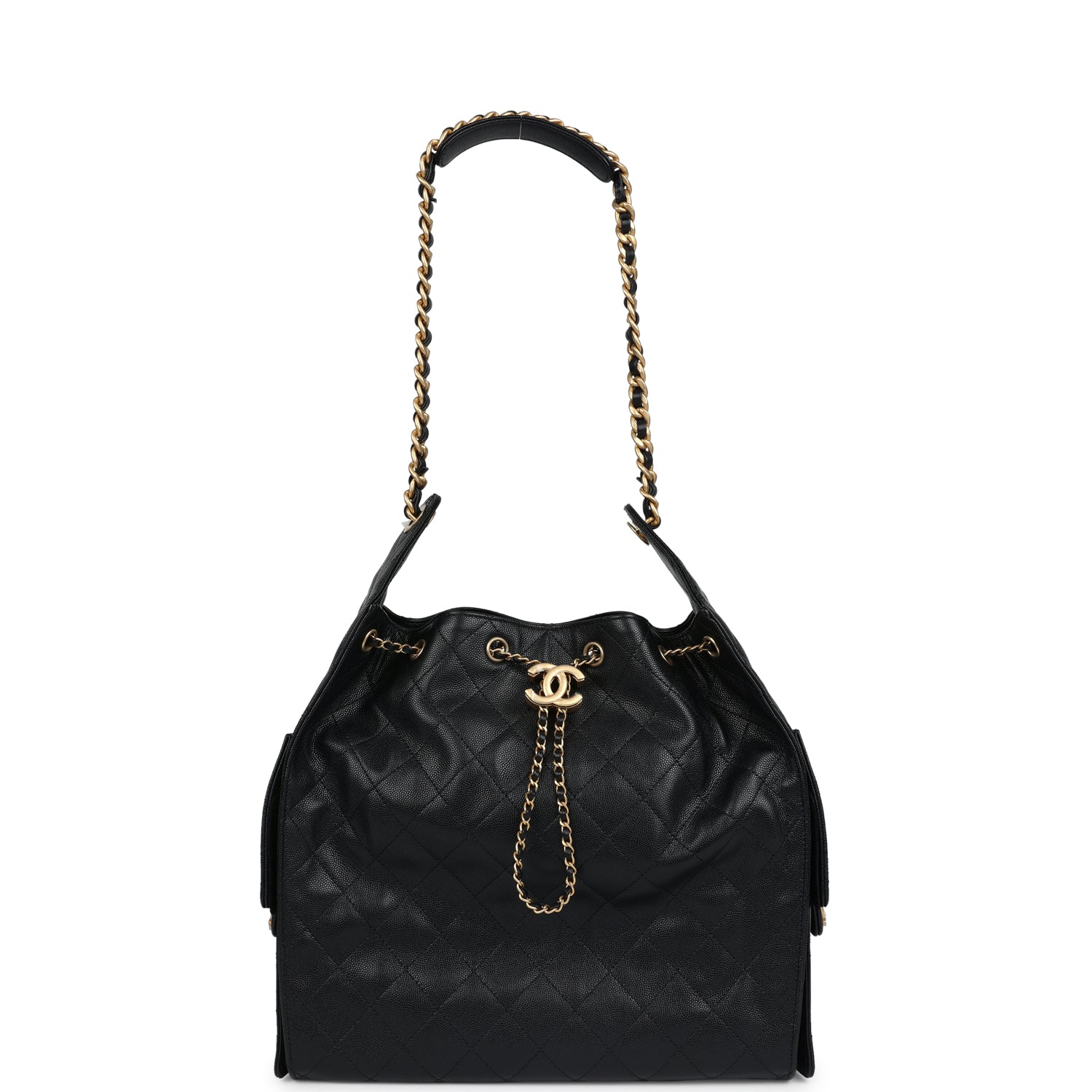 This Chanel Medium 25 Hobo Bag is in black caviar leather with antique gold hardware, features signature diamond quilt, two exterior side pockets, drawstring closure, a removable pouch, and a single interwoven antique gold and Black leather shoulder strap.