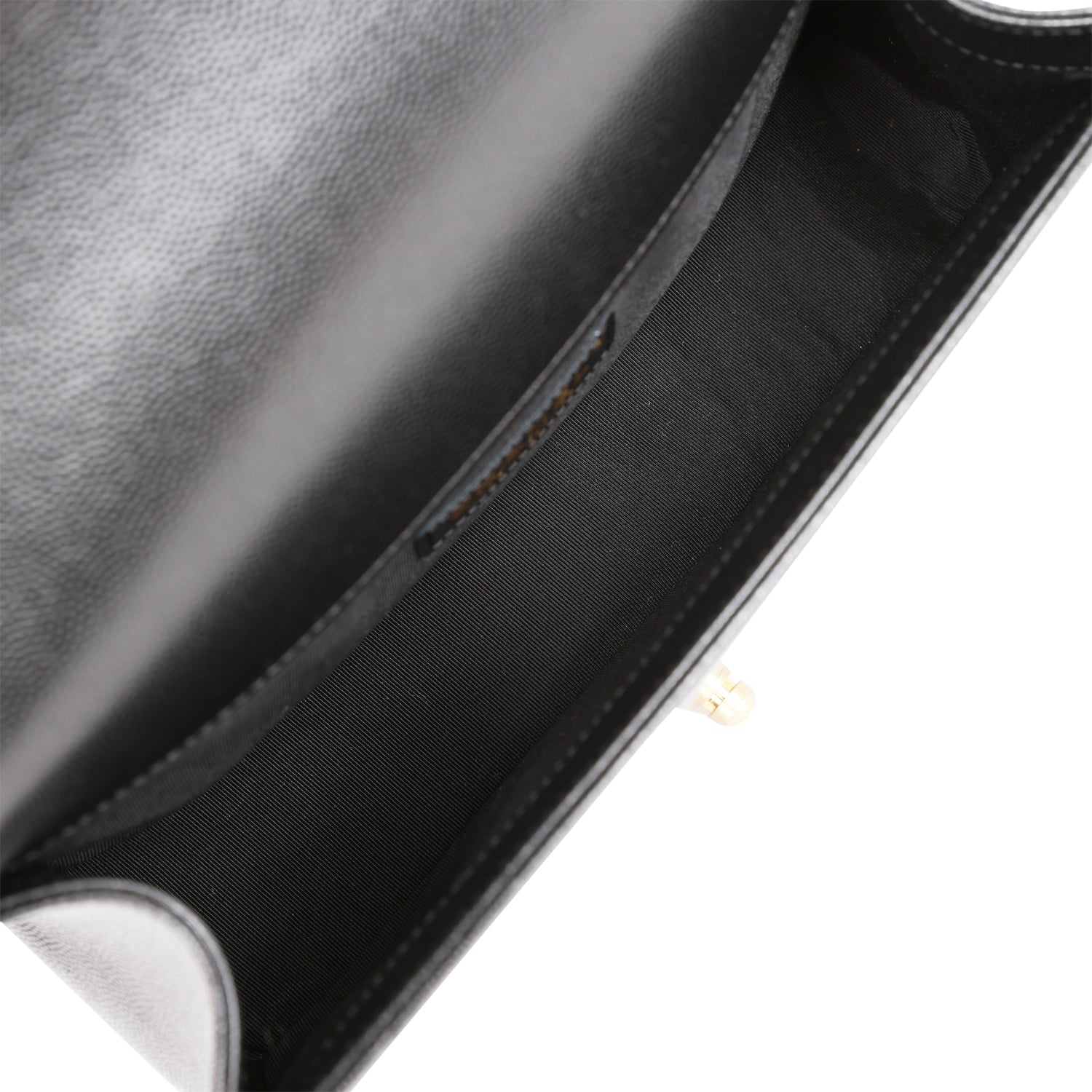 This Old Medium Boy bag is in black caviar leather with antique gold tone hardware and features a full front flap with the Le Boy CC push lock closure and an antique gold tone chain link and black leather padded shoulder/crossbody strap.