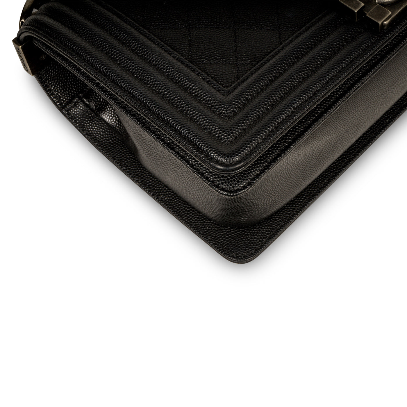 Chanel presents one of its highly-acclaimed and most sought after bags, the Chanel Boy Bag in Medium in the timeless combination of Black Caviar Leather and Ruthenium Hardware. As designed by Karl Lagerfeld, the Boy Bag collection was established to embody boyish charm and femininity. This magnificent handbag is crafted from quilted caviar leather. Its charm is only fortified through the delicate punctuation of ruthenium hardware from the chain-link strap to the signature CC push lock. Its interior features fabulous fabric lining and a single storage compartment, not to mention a subtle slip pocket.
