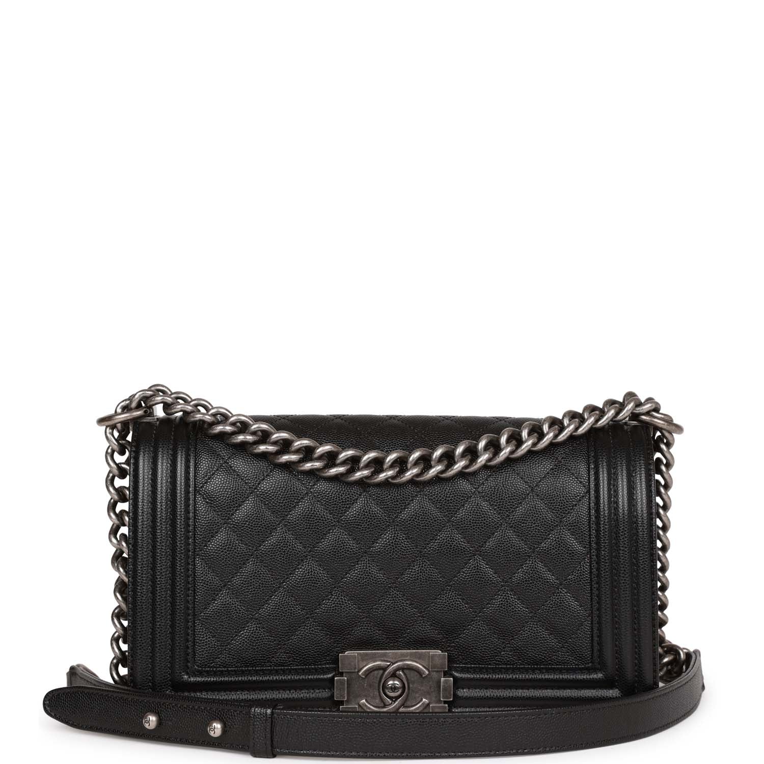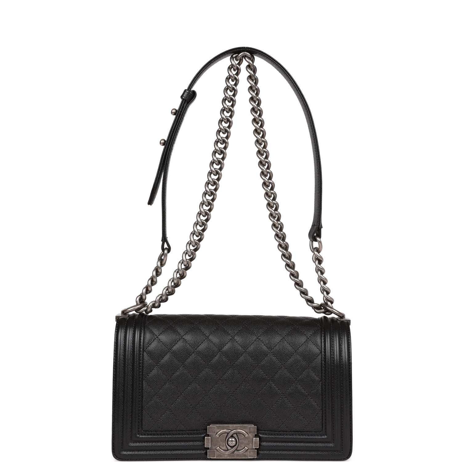 This Old Medium Boy bag is in Black caviar leather with ruthenium hardware and features a full front flap with the Le Boy CC push lock closure and a ruthenium tone chain link and black leather padded shoulder/crossbody strap.