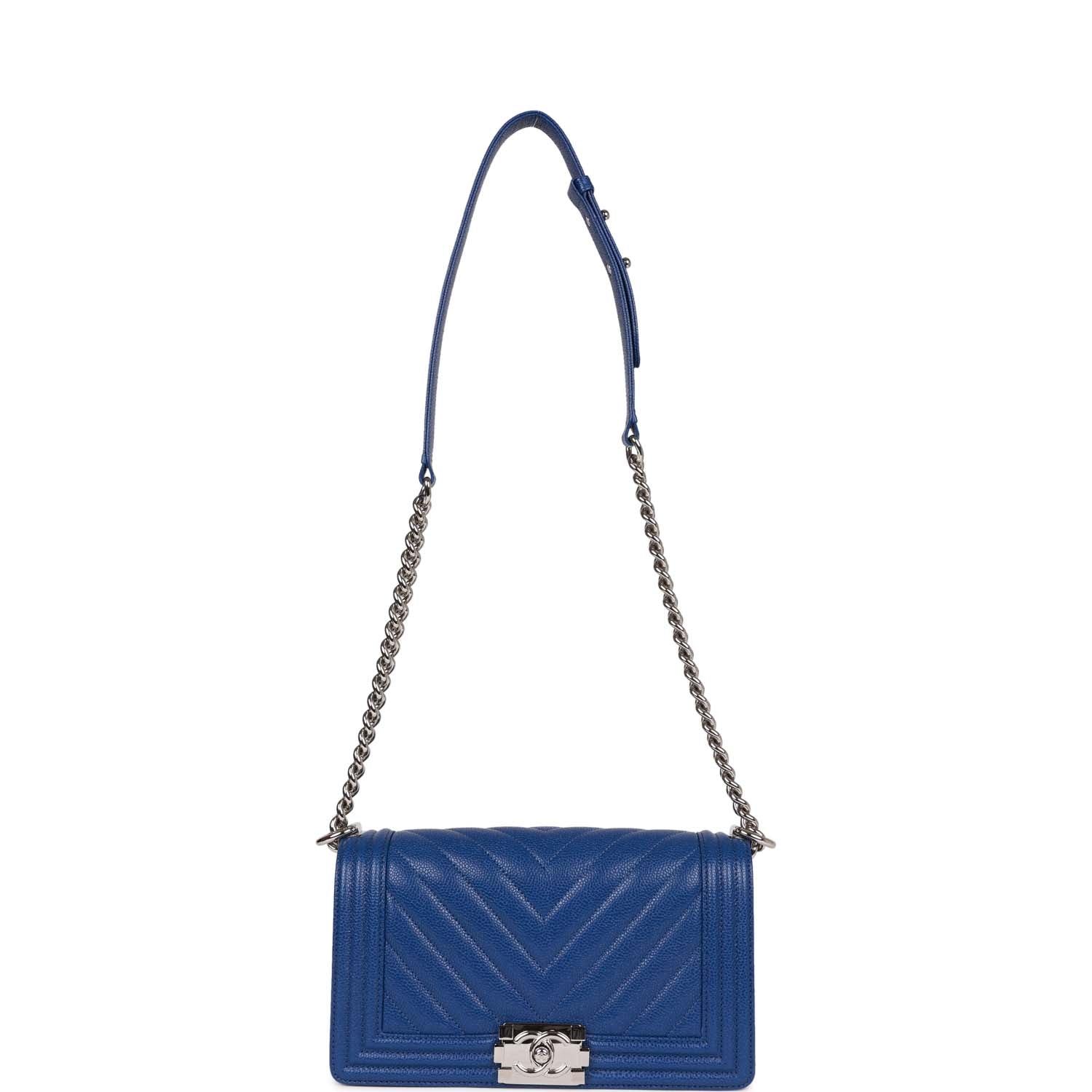 This Old Medium Boy bag is in blue chevron caviar leather with silver tone hardware and features a full front flap with the Le Boy CC push lock closure and a silver tone chain link and blue leather padded shoulder/crossbody strap.