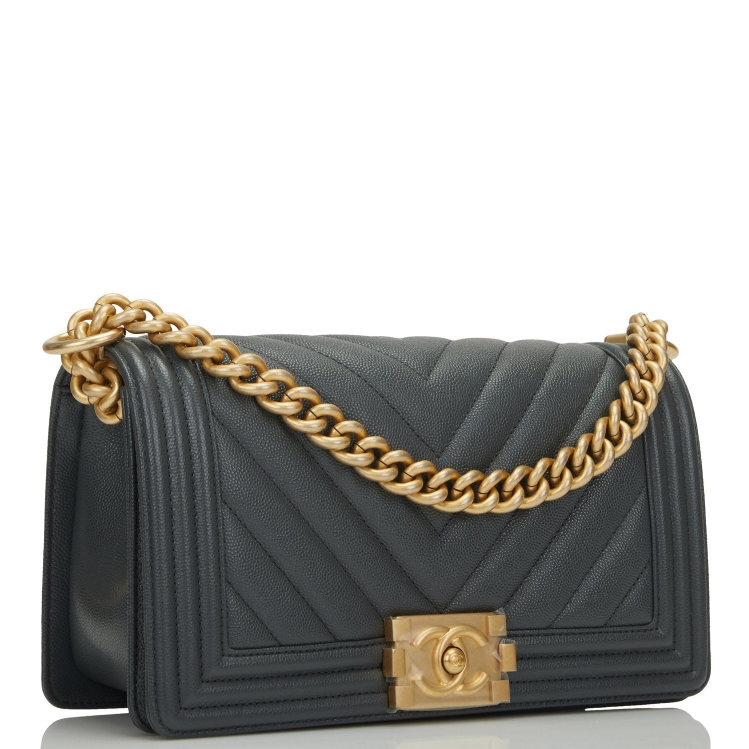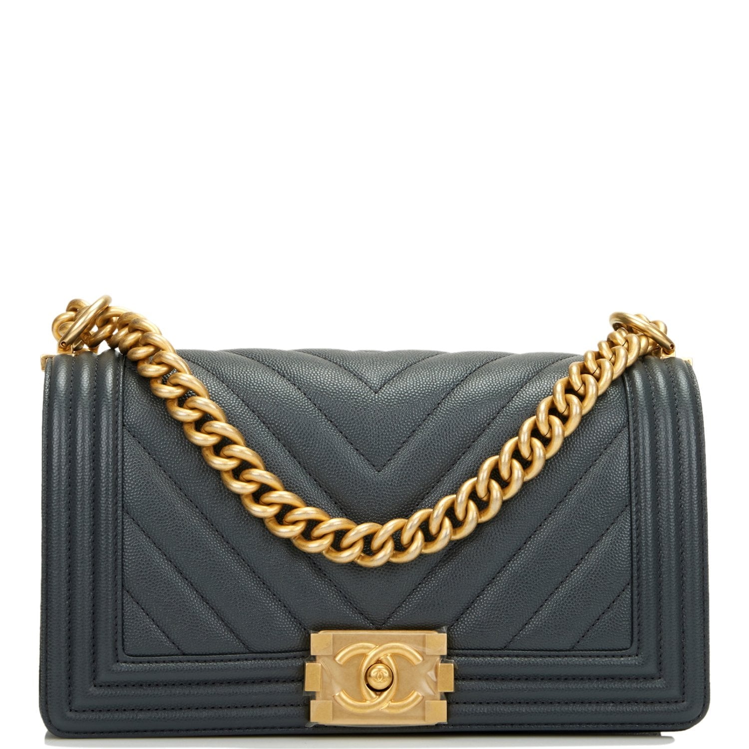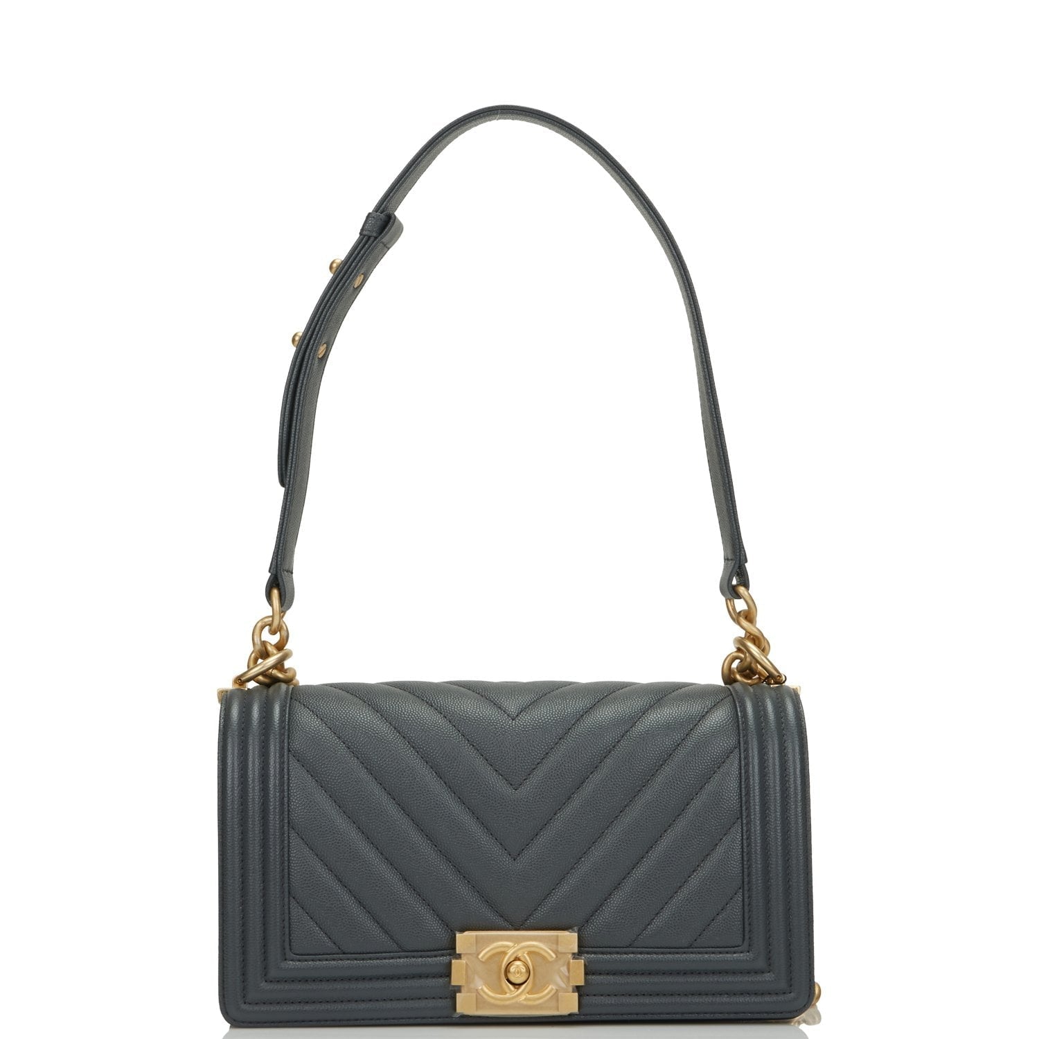 Chanel Medium Boy Bag Dark Grey Chevron Caviar Antique Gold Hardware