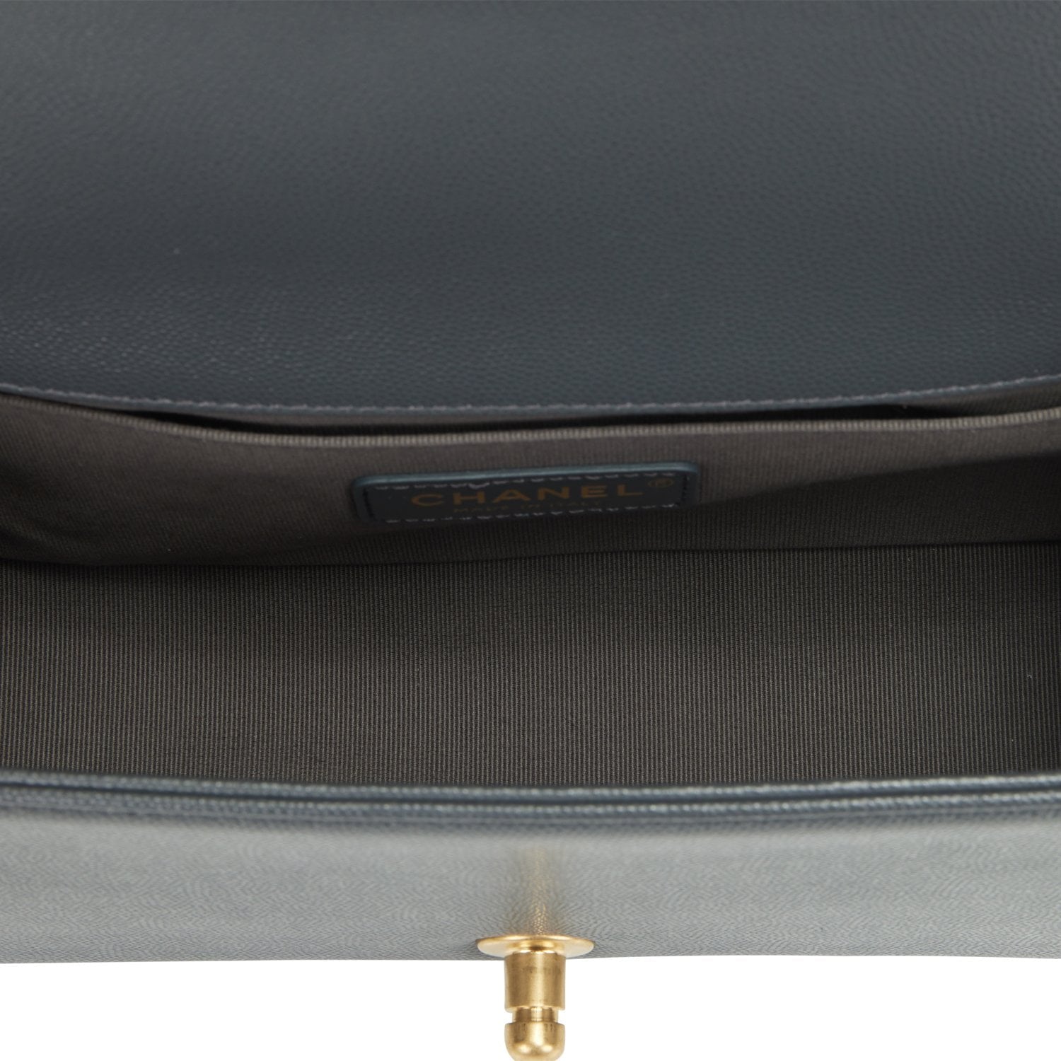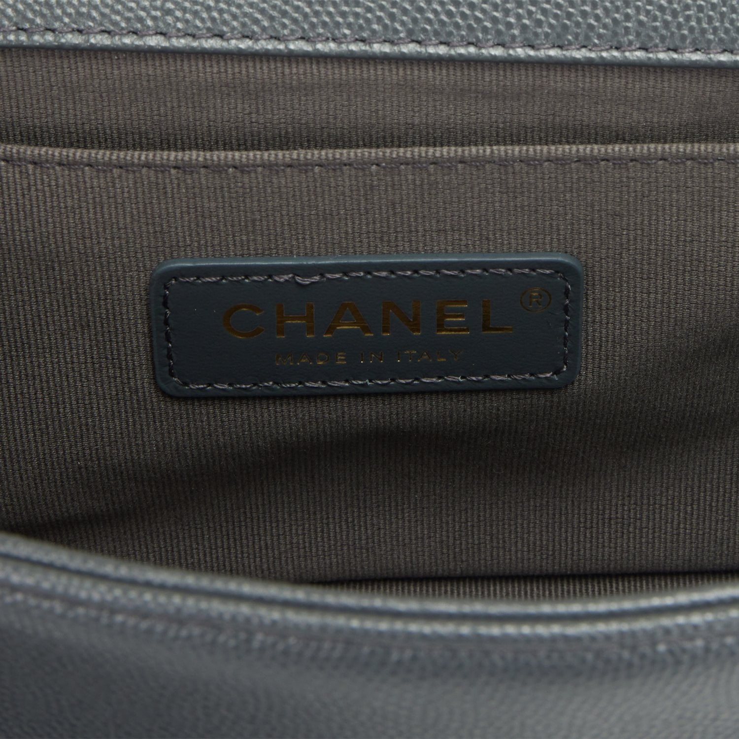 This Old Medium Boy bag is in dark grey chevron caviar leather with antique gold tone hardware and features a full front flap with the Le Boy CC push lock closure and an antique gold tone chain link and dark grey leather padded shoulder/crossbody strap.