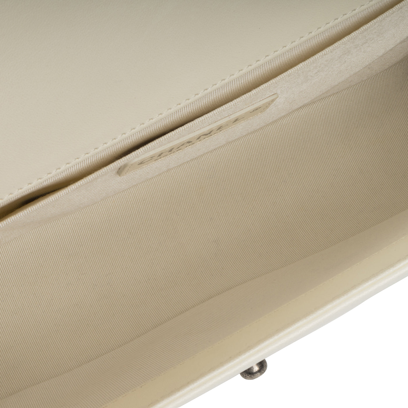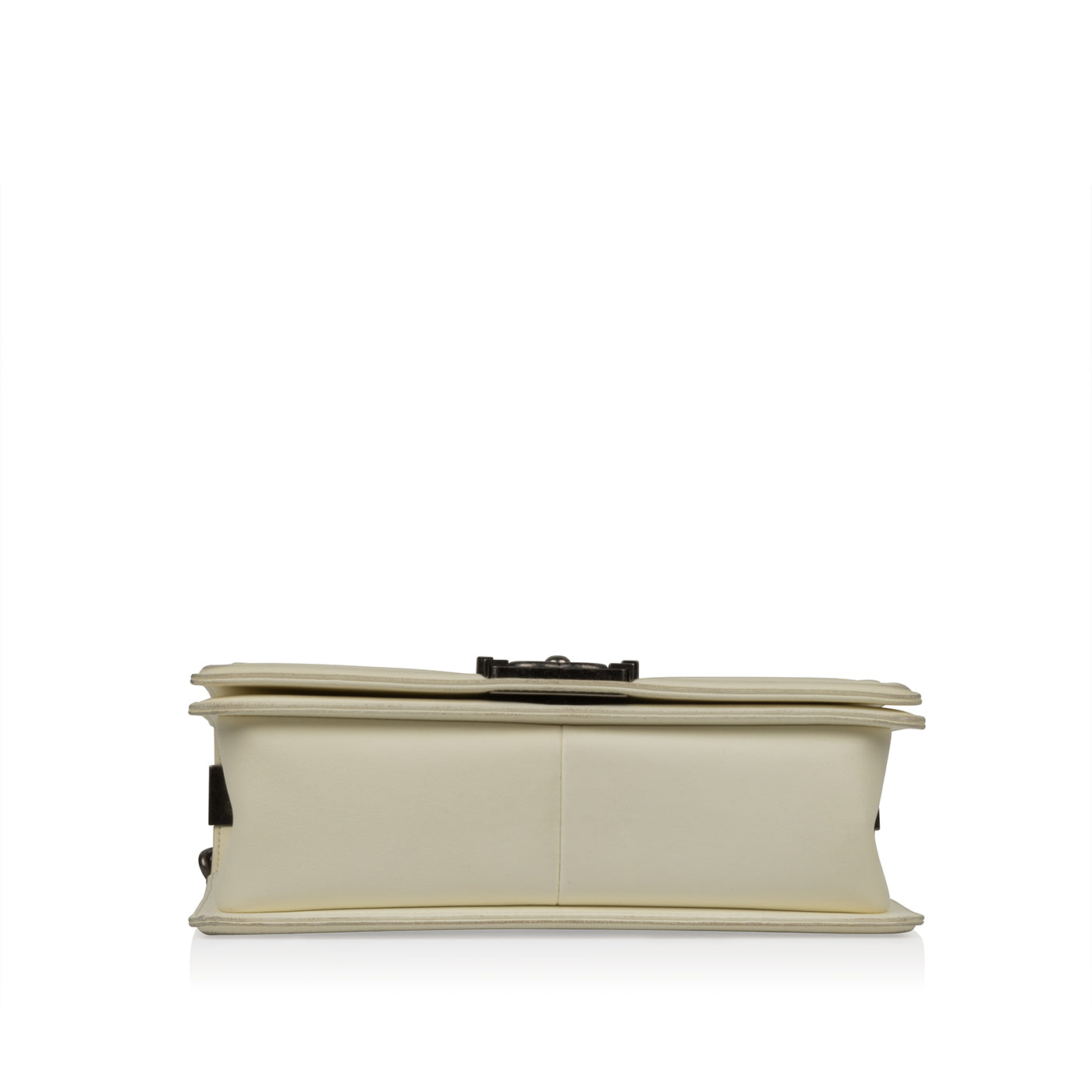 Chanel presents one of its highly-acclaimed and most sought after bags, the Chanel Boy Bag in medium in the timeless combination of cream lambskin leather and ruthenium hardware. Designed by Karl Lagerfeld, the Boy Bag was named after Boy Chapel, Coco Chanel's lover. Featuring a half chain / leather strap and the signature Boy CC push lock clasp, this iconic bag is one that will remain in style forever. Hold all your necessities comfortably inside while remaining sleek, stylish and sophisticated. A well-worthy investment piece that won't decrease in value, no luxury handbag collection is complete without a Chanel Boy.