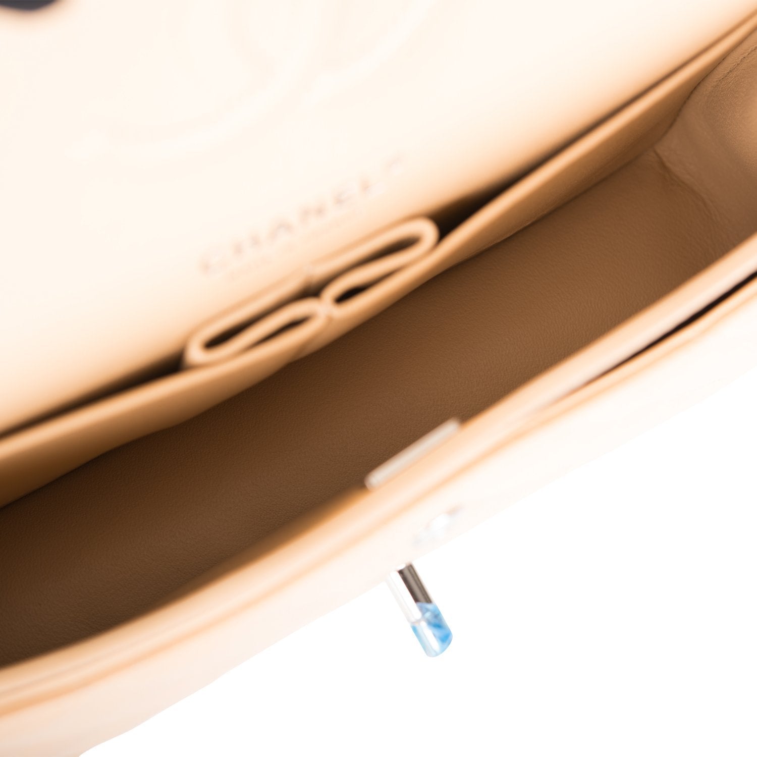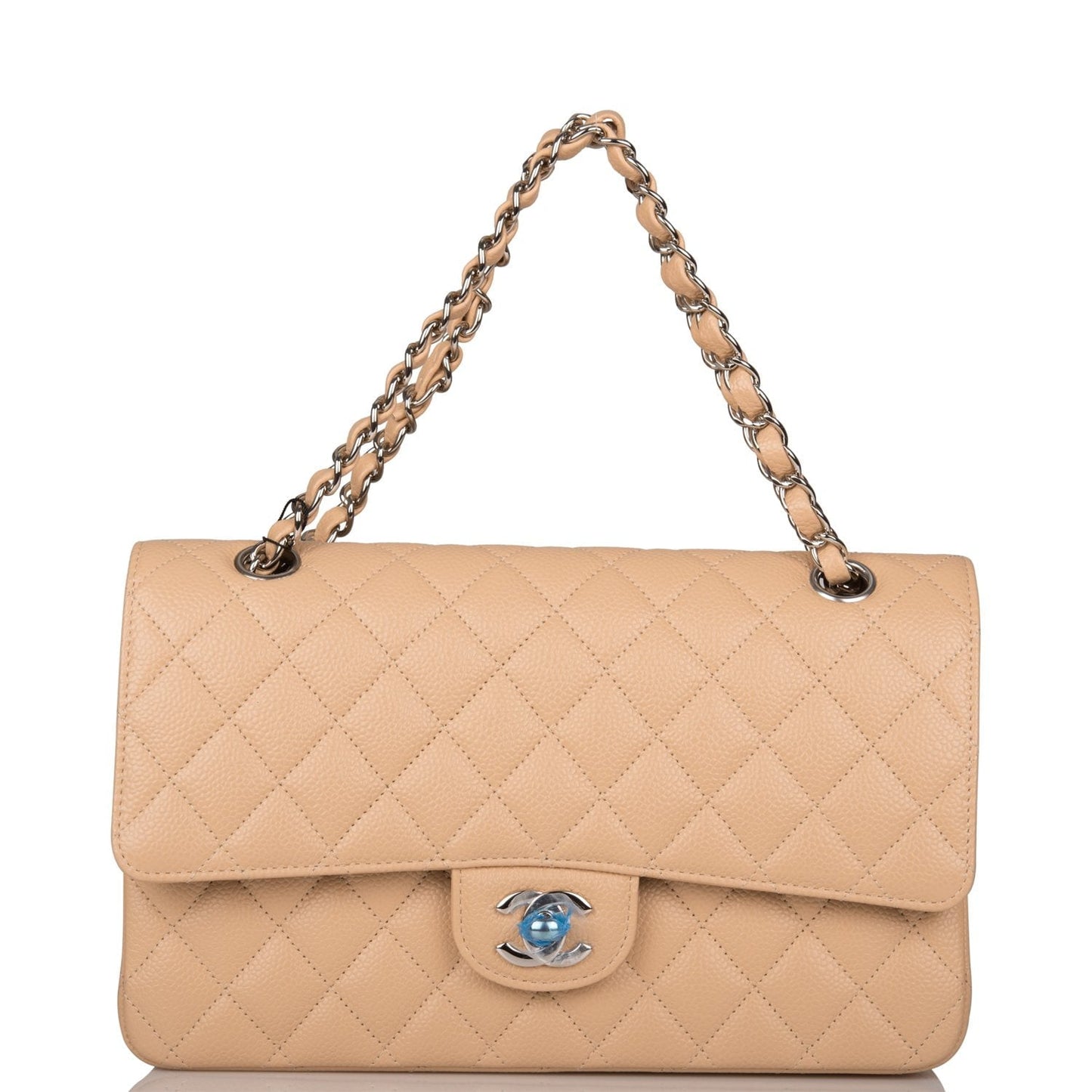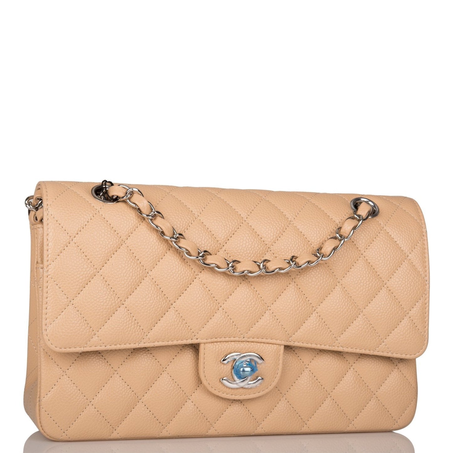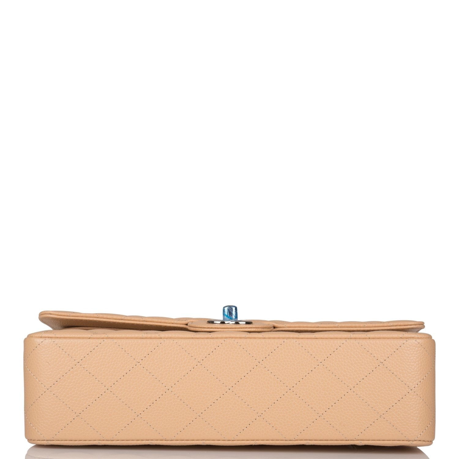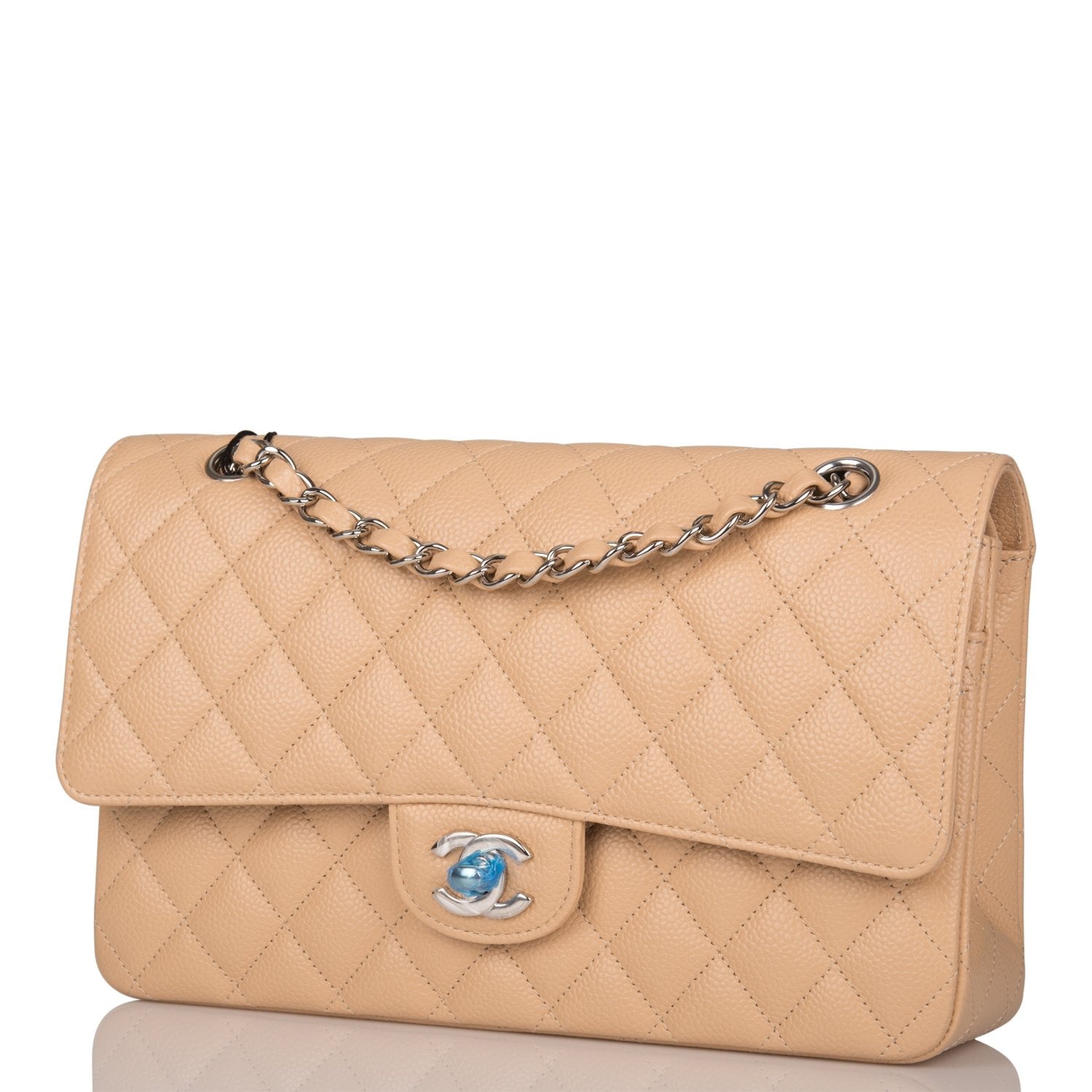 Chanel Medium Classic Double Flap Bag Beige Quilted Caviar Silver Hardware